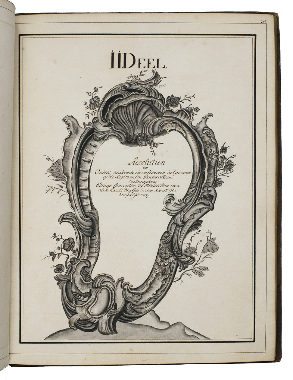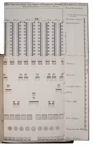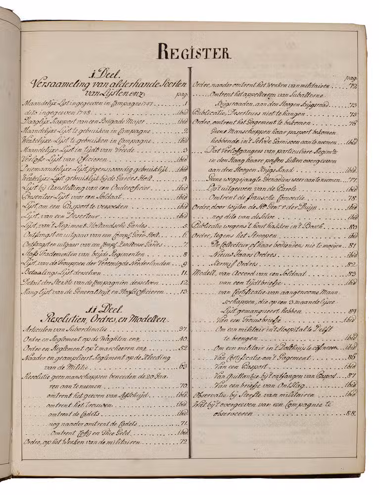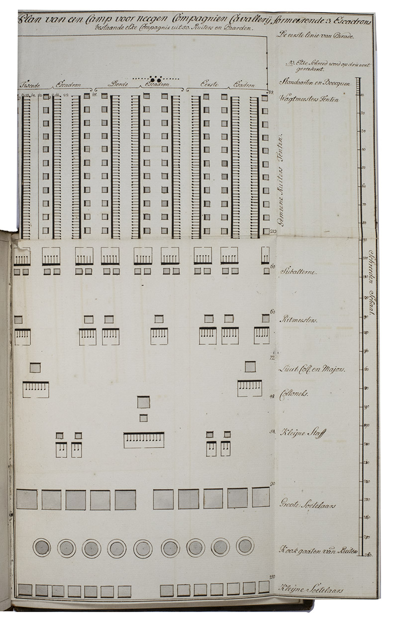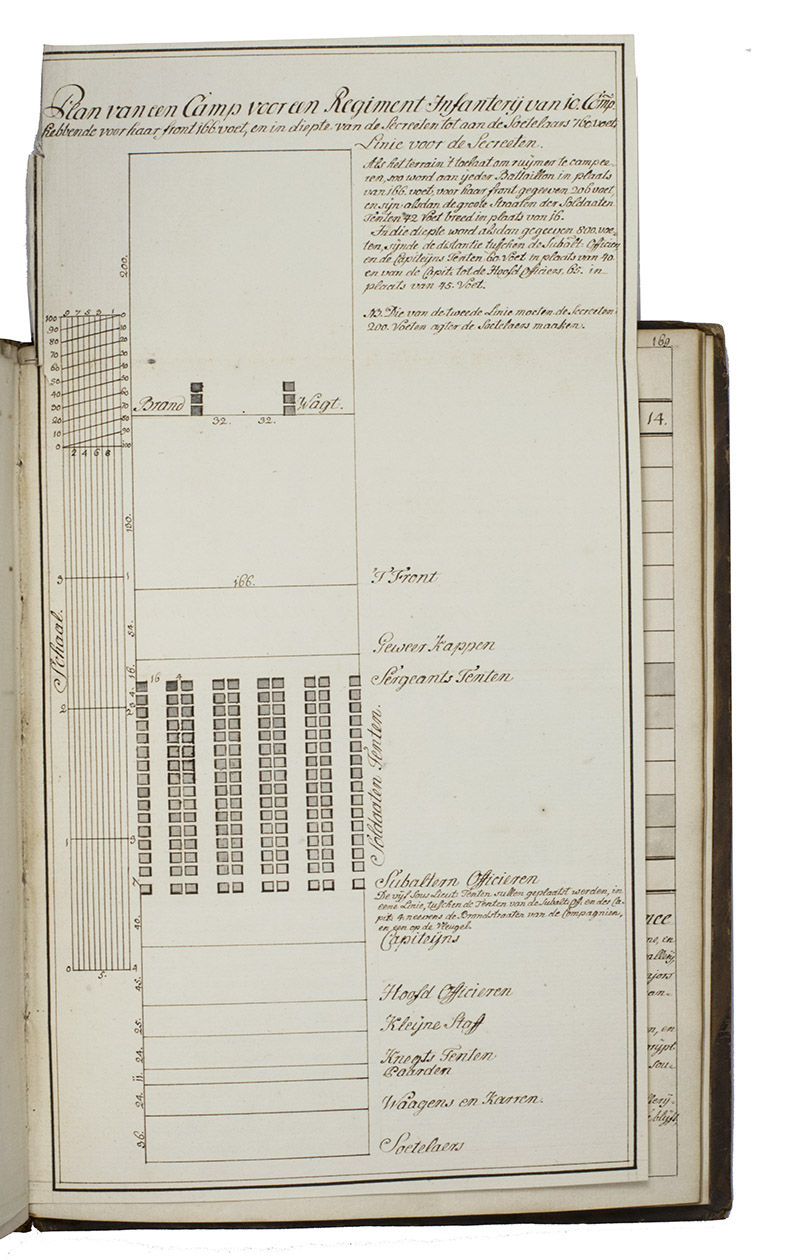 The first part contains many lists and models, with the names of several officers and their ranks in the military hierarchy, including a model for administering to those who were sick or injured, on personal leave or who lost their lives. It further explains the financial administration of the army, including the income and expenditures for the captain, officers, Swiss guards and many others. The second part contains regulations and prescriptions for the Dutch army, all copied from the Prince of Orange and Nassaus official decrees, drawn up by his secretary in the second and third quarters of the 18th century, at least mostly by Willem IV (1711-1751). It includes regulations to end his displeasure about the envy and disharmony of the different regimental officers in the Dutch army and the fact that orders from higher military ranks were sometimes neglected by the lower ones. This part also includes prescriptions for the uniforms and many concept or model letters that were commonly used in military service, including one to record the amount of money a soldier obtained, a license to marry someone, a small letter to bring someone to the hospital or sanitarium and a redundancy notice. Also included is a short protocol for when someone died and a small list of the several goods and weapons used in the army. The third part opens with a copy of a letter from Anne, Princess Royal and Princess of Orange (1709-1759), the wife of Willem IV, Prince of Orange and first heriditary stadtholder of the Seven United Provinces of the Netherlands. It continues with some very strict orders concerning the daily military matters in The Hague, such as the duties of sentries, guards and patrols, arrests, visitations, emergencies, fires, etc. The last part contains detailed tables and plans, 3 of them showing battle formations, including those for the battles of Muhlberg (1730) and Oosterhout (1732). The other 2 folding plans are model plans for military camps of the infantry and cavalry.