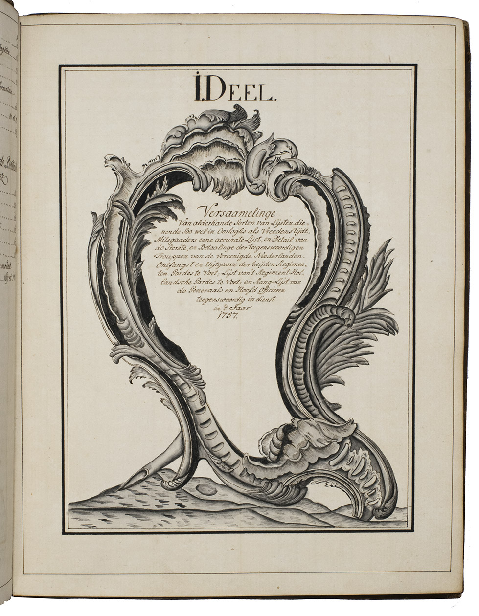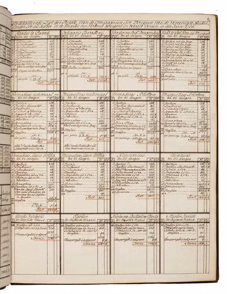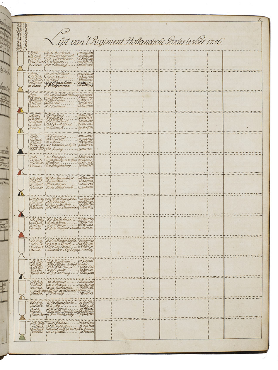 Memorie boeck of verzaameling van alderhande soorten van lijsten, in den dienst gebruiklijk sijnde, of geweest hebbende; Staat der sterkte der trouppen van den staat, met hunner betaalinge etc.; Ranglijst van de generaaliteijt, en staffs officieren; Eenige resolutien en ordres, modellen van briefjes enz.; Staat, detail en dienst van 't garnisoen, en de trouppes in S.G. Haage; Mitsgaaders eenige plans van ordre de bataille en campeeringe, en modell, van roosters.