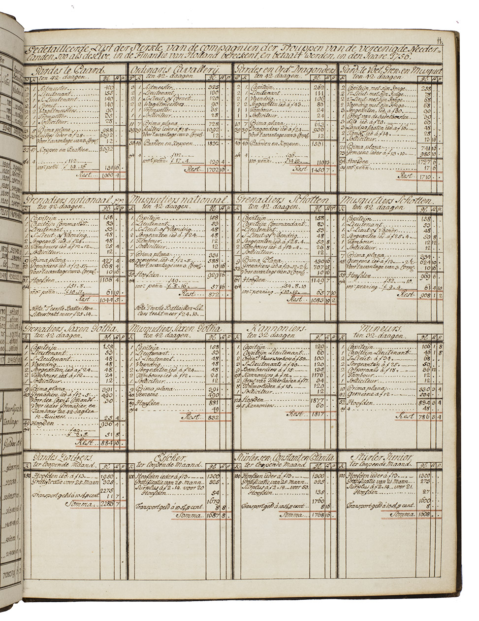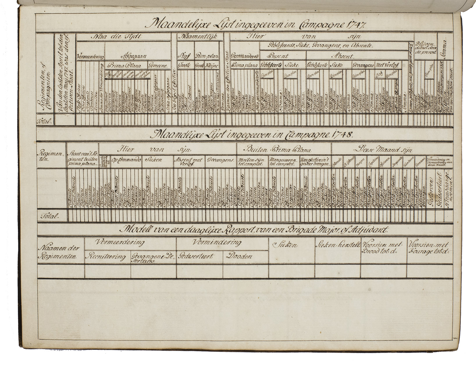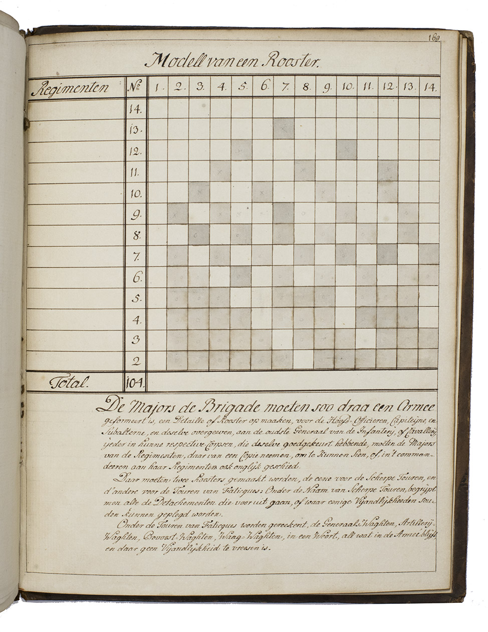 Memorie boeck of verzaameling van alderhande soorten van lijsten, in den dienst gebruiklijk sijnde, of geweest hebbende; Staat der sterkte der trouppen van den staat, met hunner betaalinge etc.; Ranglijst van de generaaliteijt, en staffs officieren; Eenige resolutien en ordres, modellen van briefjes enz.; Staat, detail en dienst van 't garnisoen, en de trouppes in S.G. Haage; Mitsgaaders eenige plans van ordre de bataille en campeeringe, en modell, van roosters.