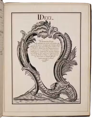 [The Hague?], ca. 1757. 4 parts in 1 volume. 4to. Written in Dutch in a neat 18th-century hand in one column, also with many tables. With a hand-drawn title-page in washed ink, with the title in a cartouche, showing a court scene with an armed soldier before Pallas Athena on the throne, the latter helding the motto "Scientia artis rei militaris", and at the head of the page a hand-coloured freemasonry symbol. Also with 4 hand-drawn half-titles in washed ink with the titles in different cartouches. Also with 3 full-page plans showing battle lines, including those for the battles of Muhlberg (1730) and Oosterhout (1732), 2 folding plans for the military camps of both the infantry and cavalry and many tables. 18th-century mottled calf, gold-tooled frame on both boards with gold-stamped fleur-de-lis in the corners, gold-tooled spine, gold-tooled board edges, gilt edges, marbled endpapers. [6], 174 pp. including some blanks.