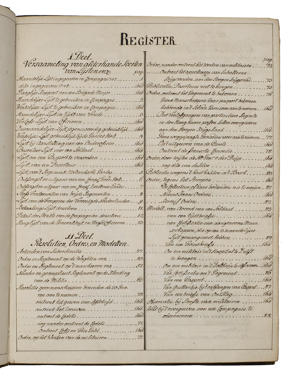 Highly interesting military manuscript, showing the daily military life, standards, regulations, orders and rules and administration of the Dutch army in the second and third quarters of the 18th-century. It was written in four parts, each with its own part-title, discussing several relevant aspects of military life.