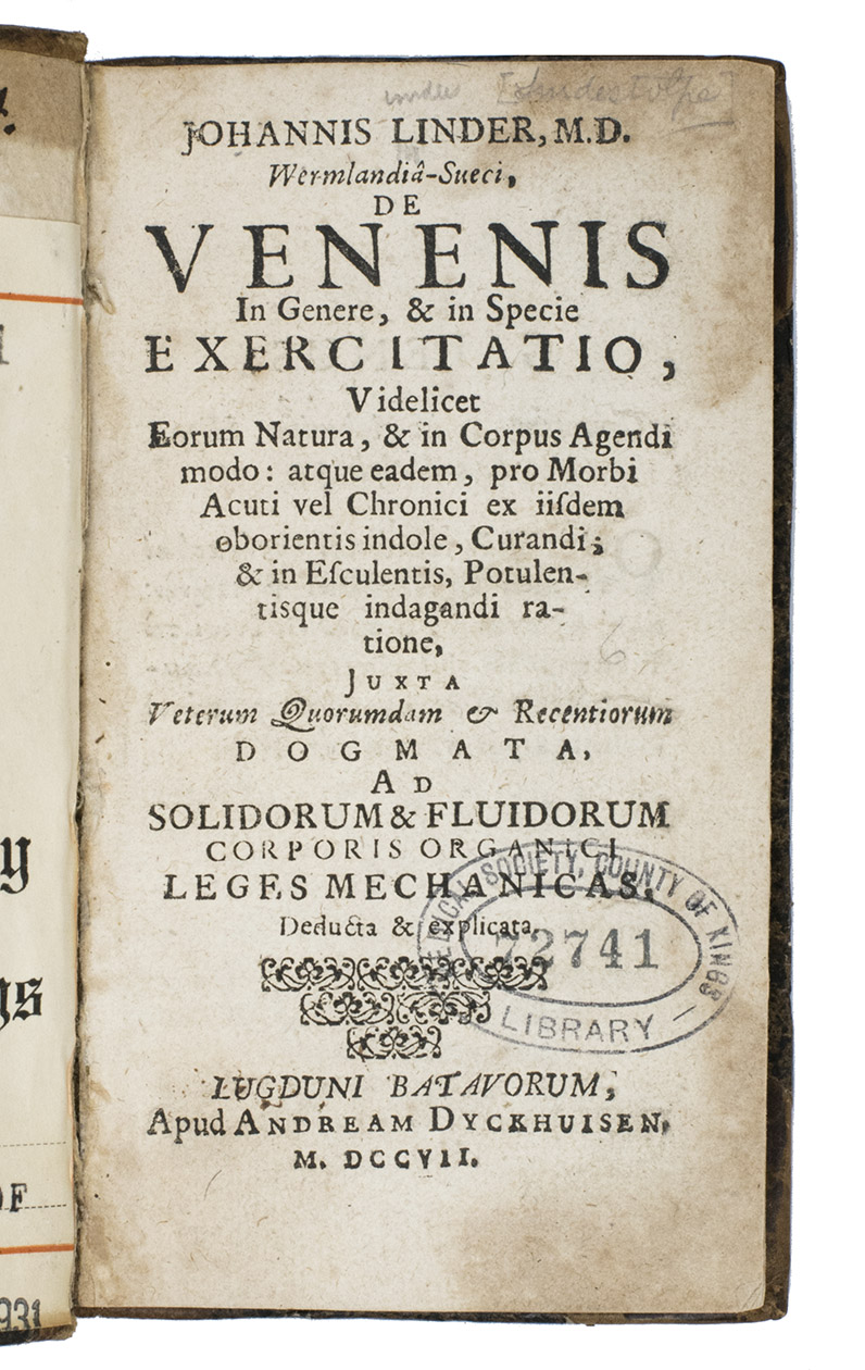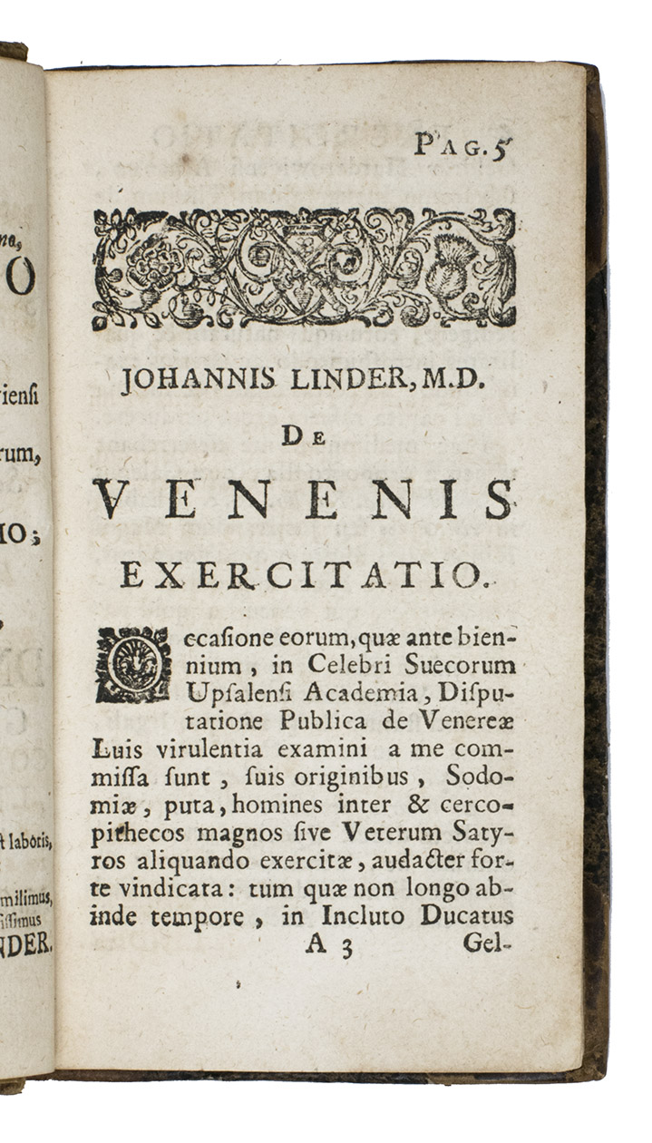 Very rare first issue of the first edition of a medical treatise on natural poisons, their antidotes and their applicability in curing some diseases, by the Swedish physician and botanist Johannis Linder (1678-1724) from Wermlandia. Linder studied in Uppsala and Leiden and took his degree in Harderwijk. Boerhaave mentions this treatise in his Verhandeling over de kragten der geneesmiddelen (1762), p. 378, in the chapter on antidotes, noting that Johannes Lindelstolpes book on poisons (1739) had already been published under the name Linder at Leiden in 1707. The intellectual Queen Ulrika Eleonora of Sweden knighted him in 1719 and from that date he used the name Lindelstolpe" . It seems that the second issue of this first edition was printed in 1708.