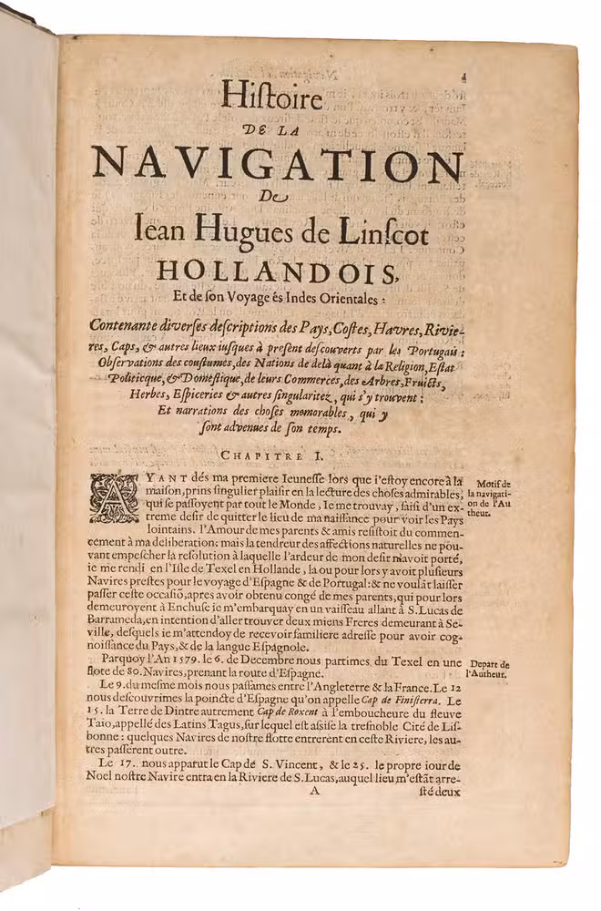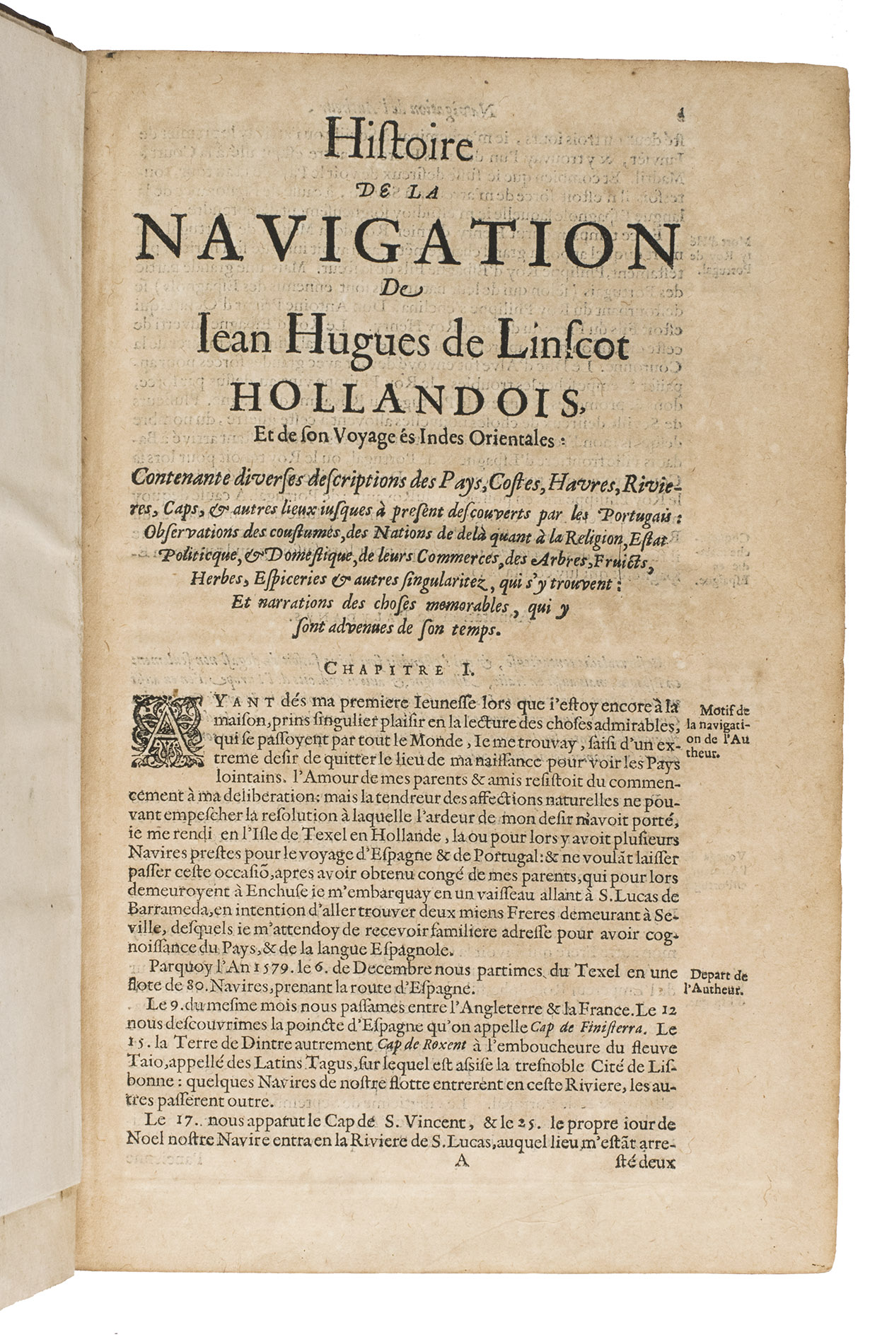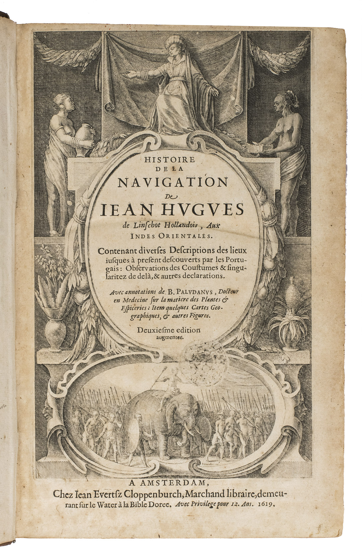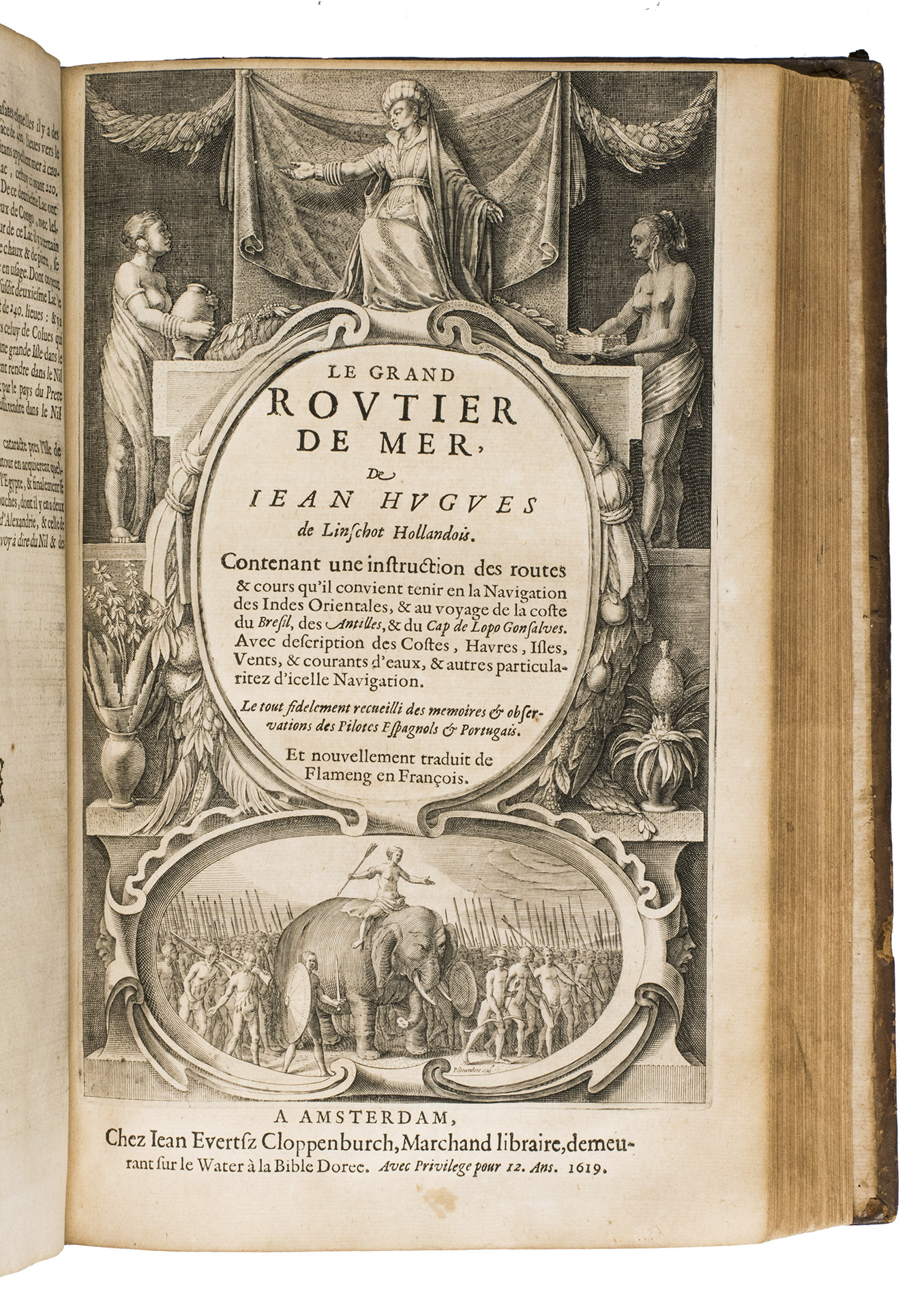 Amsterdam, Evert Cloppenburg, 1619. 3 works in 1 volume, the first in 2 parts. Folio (31 x 21 cm) With an engraved title page for each work, 42 engraved plates (31 double-page and 11 folding), including 6 maps, and a full-page portrait of the author within collation. Including: LINSCHOTEN, Jan Huyghen van. Le grand routier de mer, ...