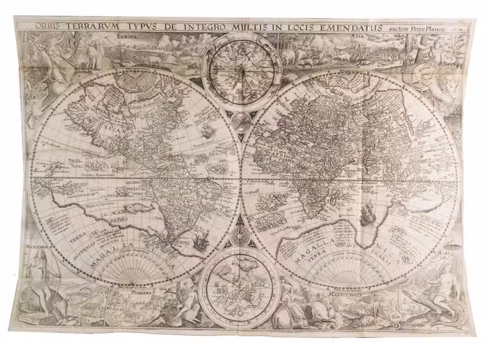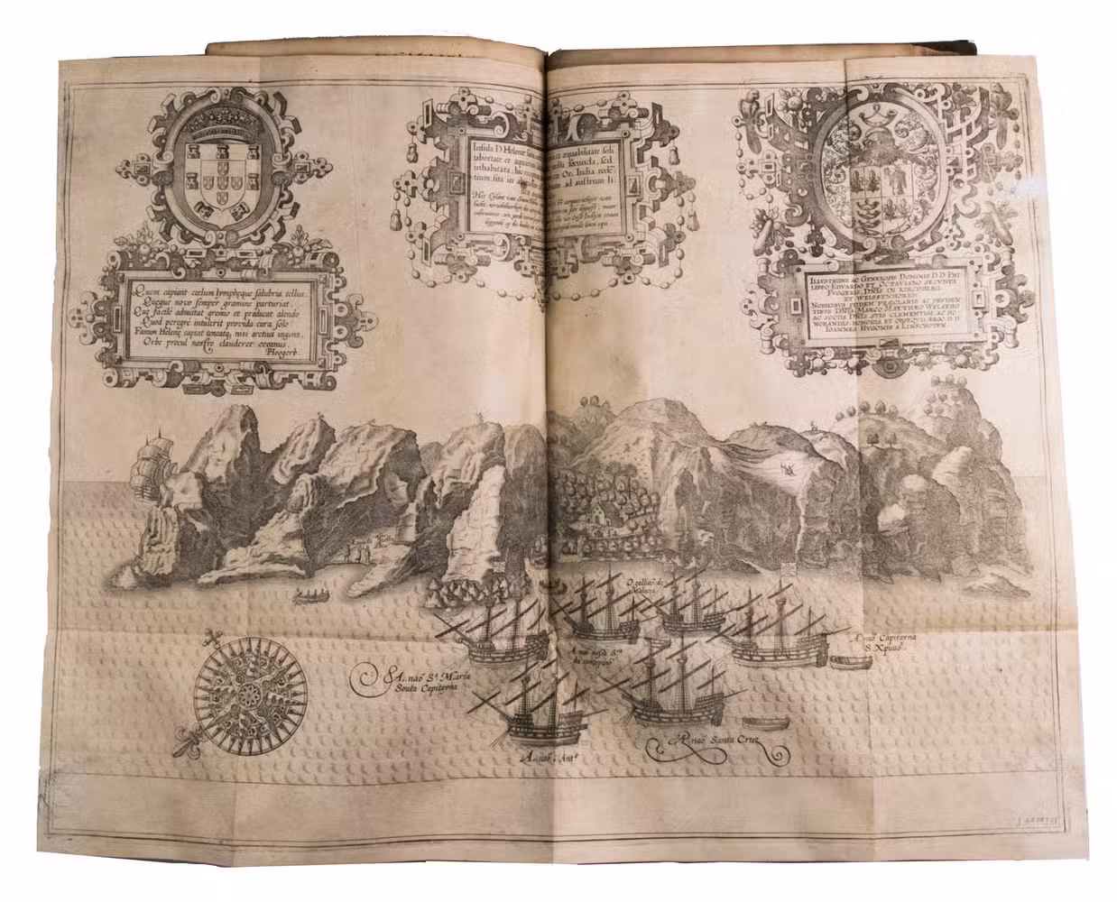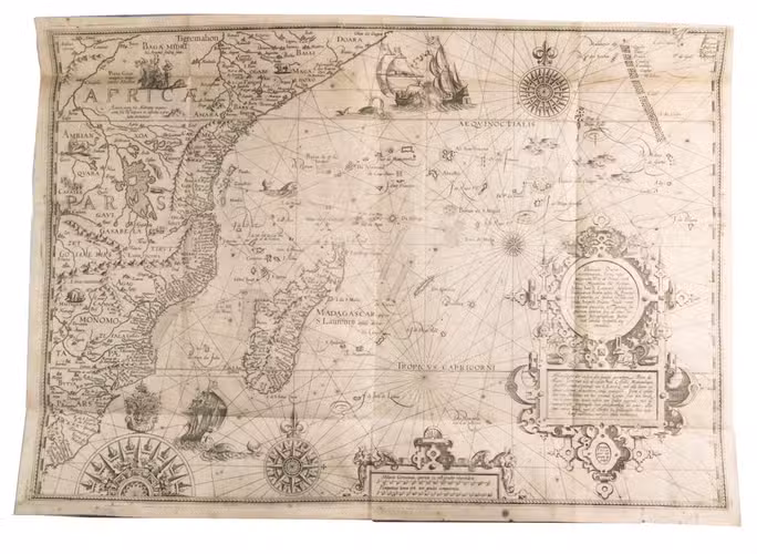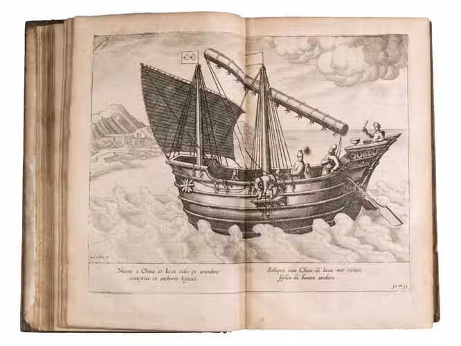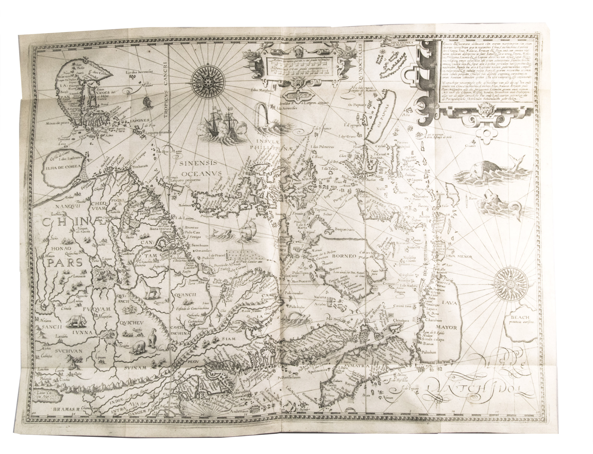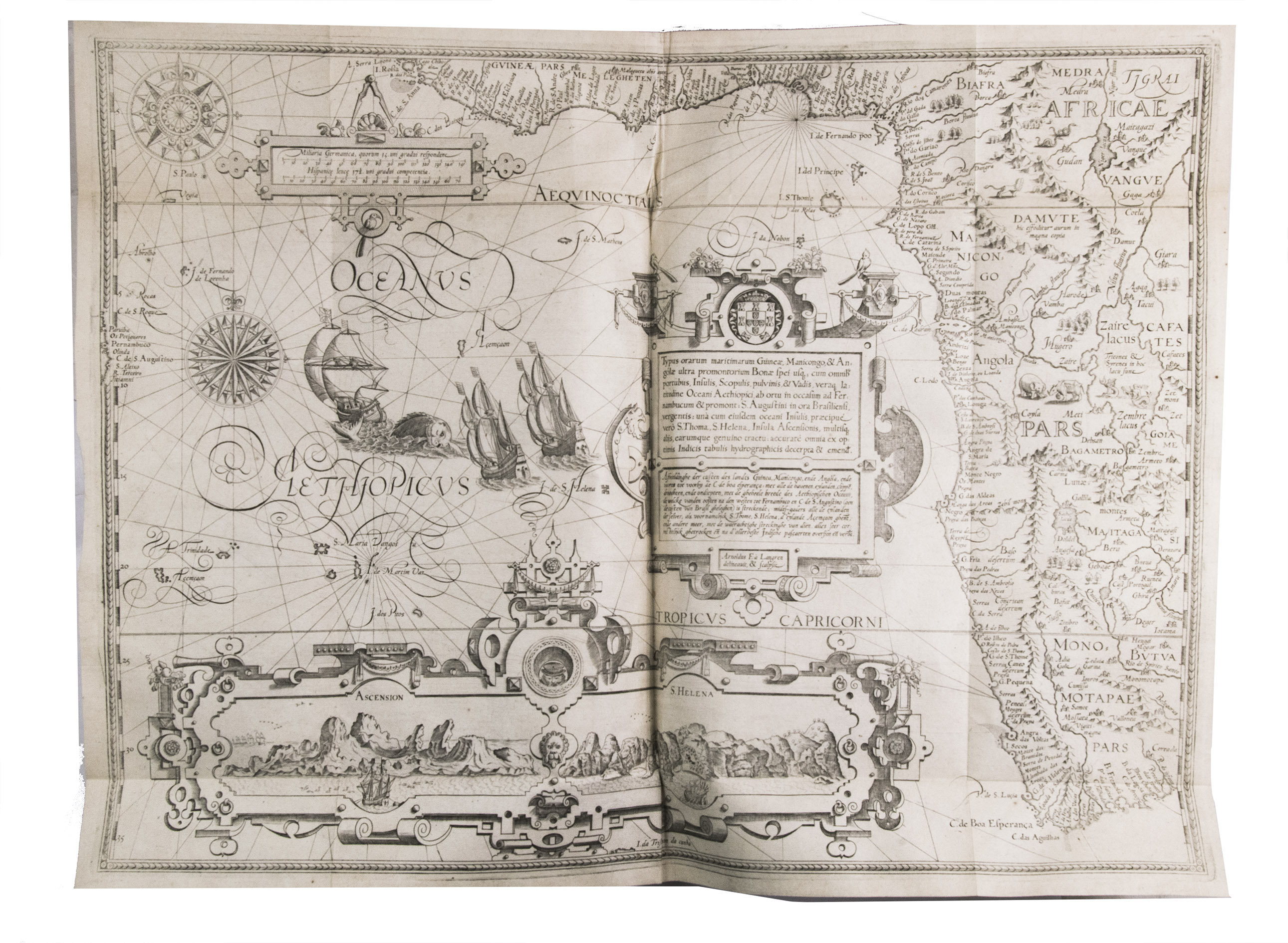 Amsterdam, Evert Cloppenburg, 1619. 3 works in 1 volume, the first in 2 parts. Folio (31 x 21 cm) With an engraved title page for each work, 42 engraved plates (31 double-page and 11 folding), including 6 maps, and a full-page portrait of the author within collation. Including: LINSCHOTEN, Jan Huyghen van. Le grand routier de mer, ...