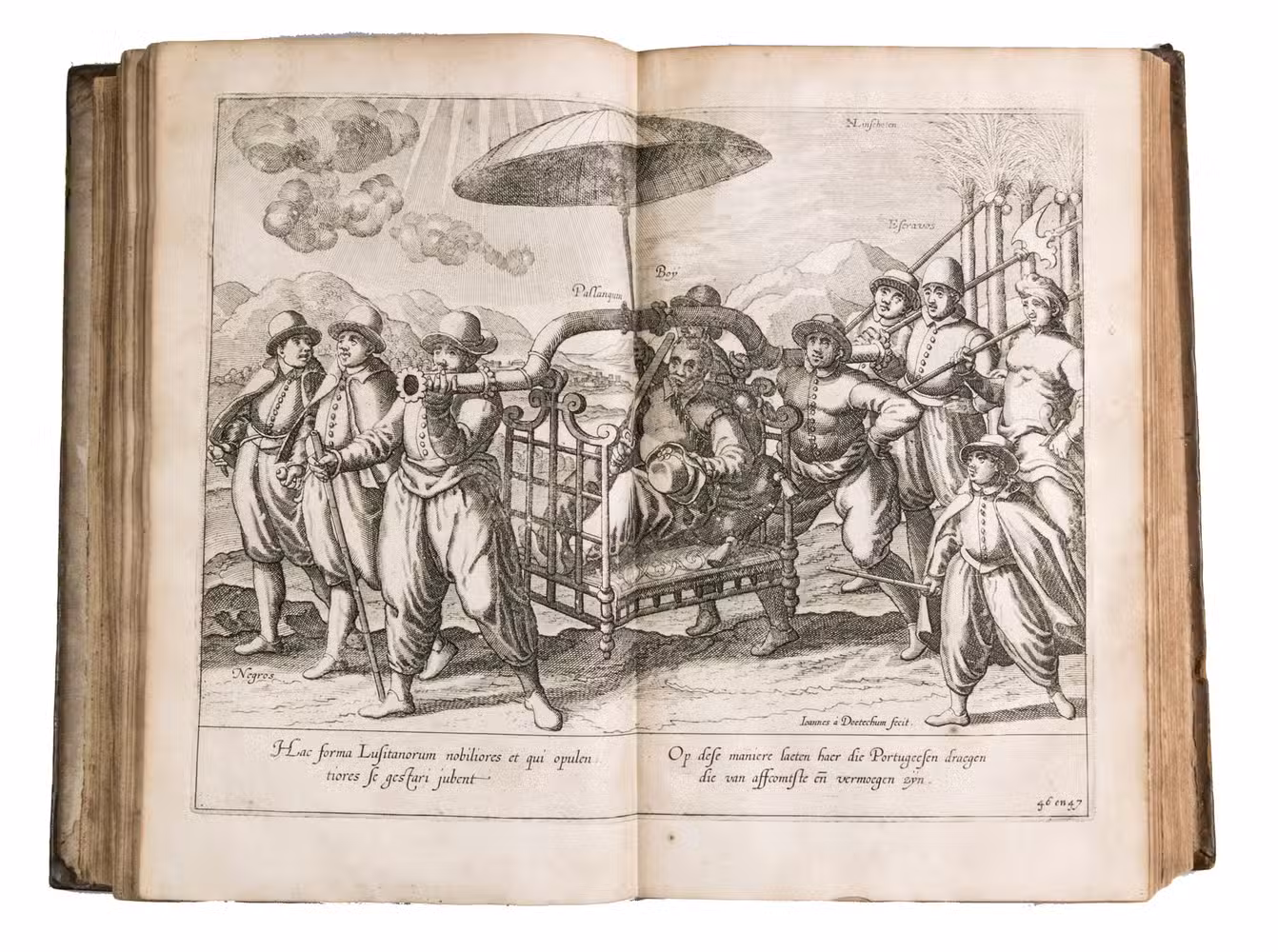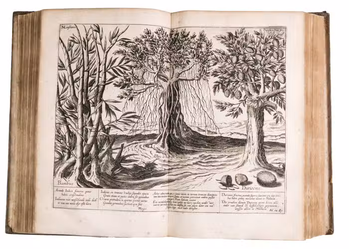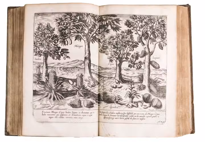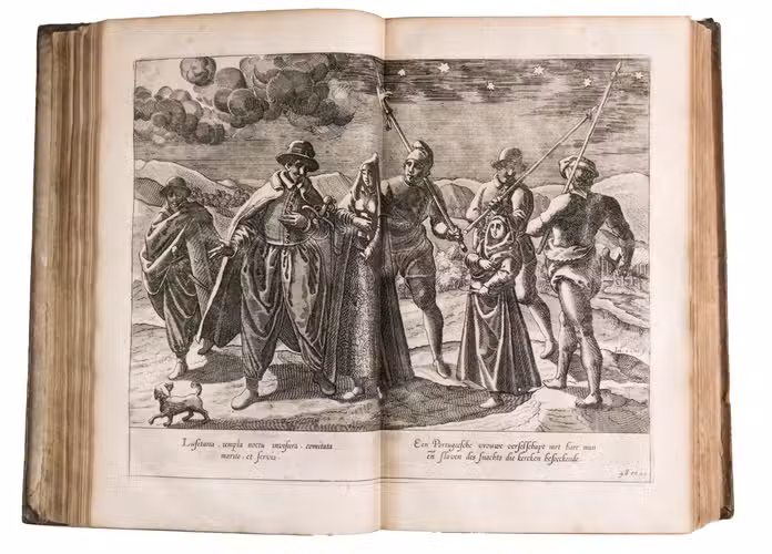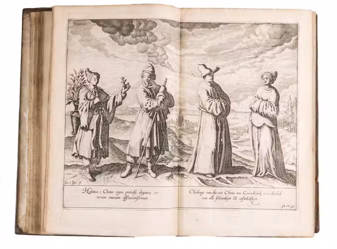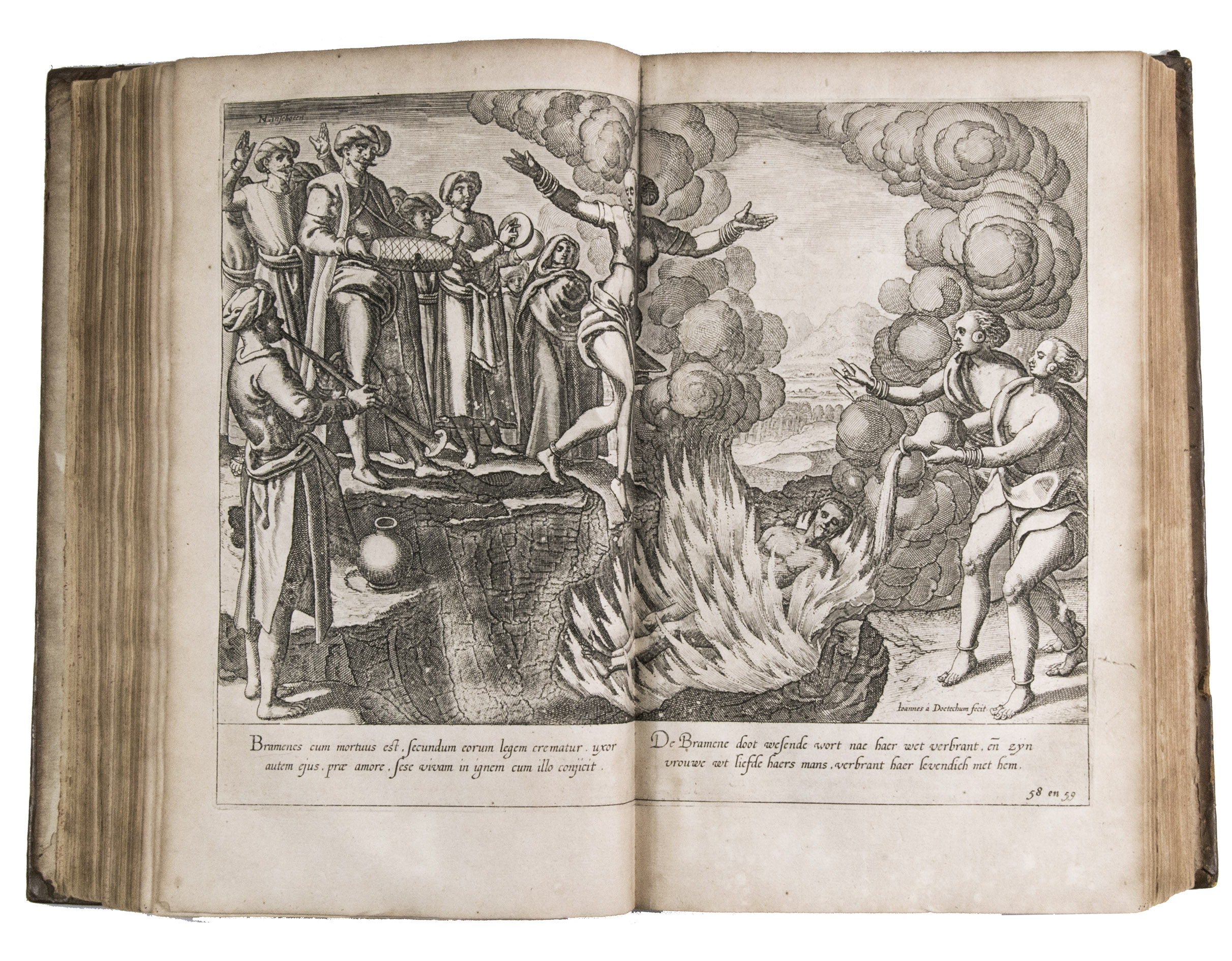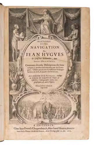 The work was first published in Dutch in 1595/96 followed by Latin and English translations in 1598. The first French edition appeared in 1610, but its plates are copies of a reduced version and derive from De Bry. The second and third French editions return to the original large plates of the Dutch edition and add Bernardus Paludanus annotations. The 1619 and 1638 editions are accordingly the most desirable. Although the present title page describes this edition as augmented, that is with respect to the first: the second and third editions contain the same plates and have the same collation, with little change to the text. The head- and tailpieces and decorated initials (cast from woodcut patterns) are mostly those best known from their use by William Brewsters so-called Pilgrim Press in Leiden in the years 1616-1619, ornaments II and III and the initials in fig. 33 of Harris & Jones, The Pilgrim Press, 2nd ed., 1987. The pagination in part 3 erroneously omits the numbers 61-66, but no leaves are lacking.