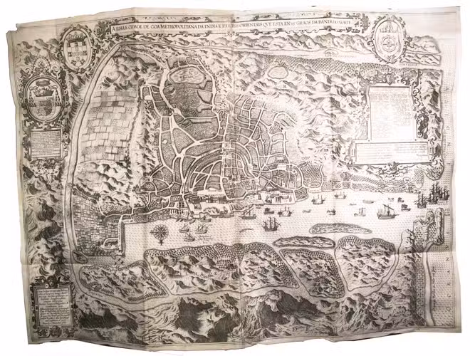 Although the text is divided into three parts, each with its own title page, the divisions between them fall in the middle of the quires, so that they could not easily be issued separately. The first part covers the East Indies and East Africa, including regions as far east as Japan. The second describes the navigation along the coasts of West Africa around the Cape of Good Hope to Arabia, together with some coasts in the New World, with a "real roteiro" after the Portuguese royal navigator Diego Affonso that sets out sailing directions from Portugal to India and from island to island in the East Indies. The third book is devoted to North America, the Caribbean, and Brazil, with a large folding map (not noted in the index of plates, but called for on the title page to part 3).