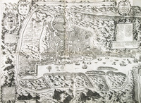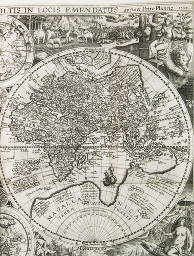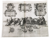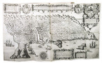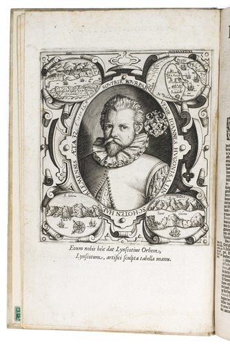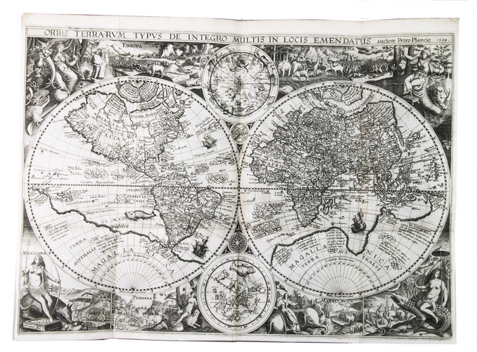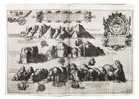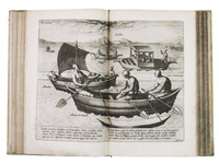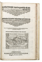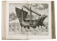 Amsterdam, Cornelis Claesz., 1596. 4 parts in 1 volume. Small folio (ca. 31 x 21 cm). With 6 folding maps, 36 folding or double-page plates, a full-page author's portrait, and a large illustration on each of the 4 divisional title pages, all engraved. Contemporary blind-tooled vellum over modern boards (?), sewn on 5 supports laced through the joints, with the manuscript author, title, and year of publication on the spine, red and blue sprinkled edges. [8], 160; 134, [4], 135-147; [82], [2 blank], [8] pp.