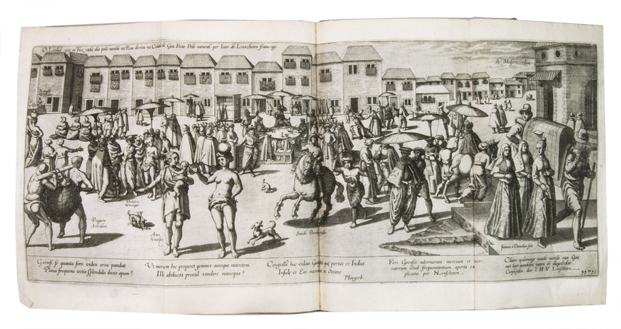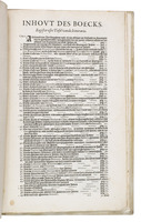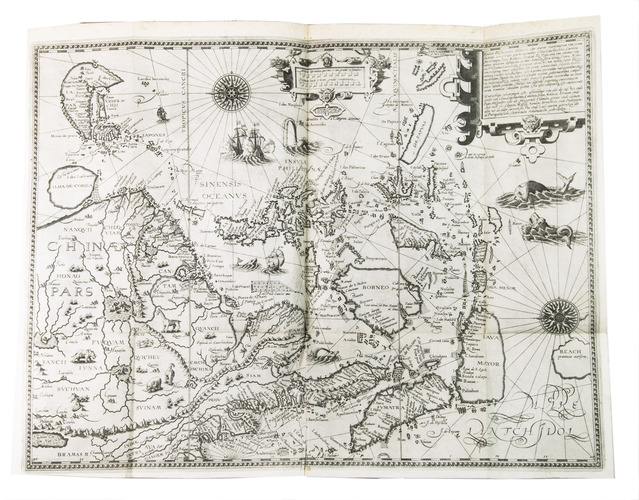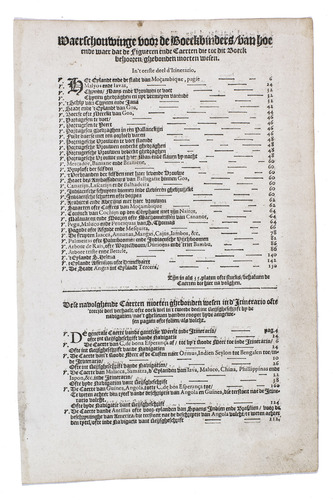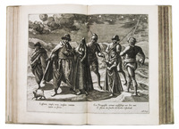 With the bookseller's label of R. W. P. de Vries in Amsterdam mounted at the foot of the front pastedown, and the rare "Waerschouwinge voor de boekbinders" loosely inserted in the back. The work has been recased with new endpapers and supports, small restorations on the head and foot of the spine. The work is slightly browned throughout, part 3 (ads 2a and 2b) has been bound before part 2 (ad 3), small restorations at the bottom outer corner of some of the leaves, small tears in the folds of some of the maps, mostly in the margins, contemporary annotations in the margins of some of the leaves and on the verso of some of the plates, the chapter titles on page 12-20 and 31-34 in ad 1 have been corrected with a small strip of paper glued on top, the leaves of ad 3 have been numbered by hand. Otherwise in good condition. Alden & Landis 596/63; Borba de Moraes, pp. 486-487; Church 252; Howgego, L131-132; Parker, Books to build an empire, pp. 159-161; Sabin 41356; STCN 853189978 (9 copies); cf. Hill 1025 (English ed.); Nave, Philologia Arabica 22 (1623 ed.); for the map of Arabia, Persia and India: Tibbets 46 & pp. 23.