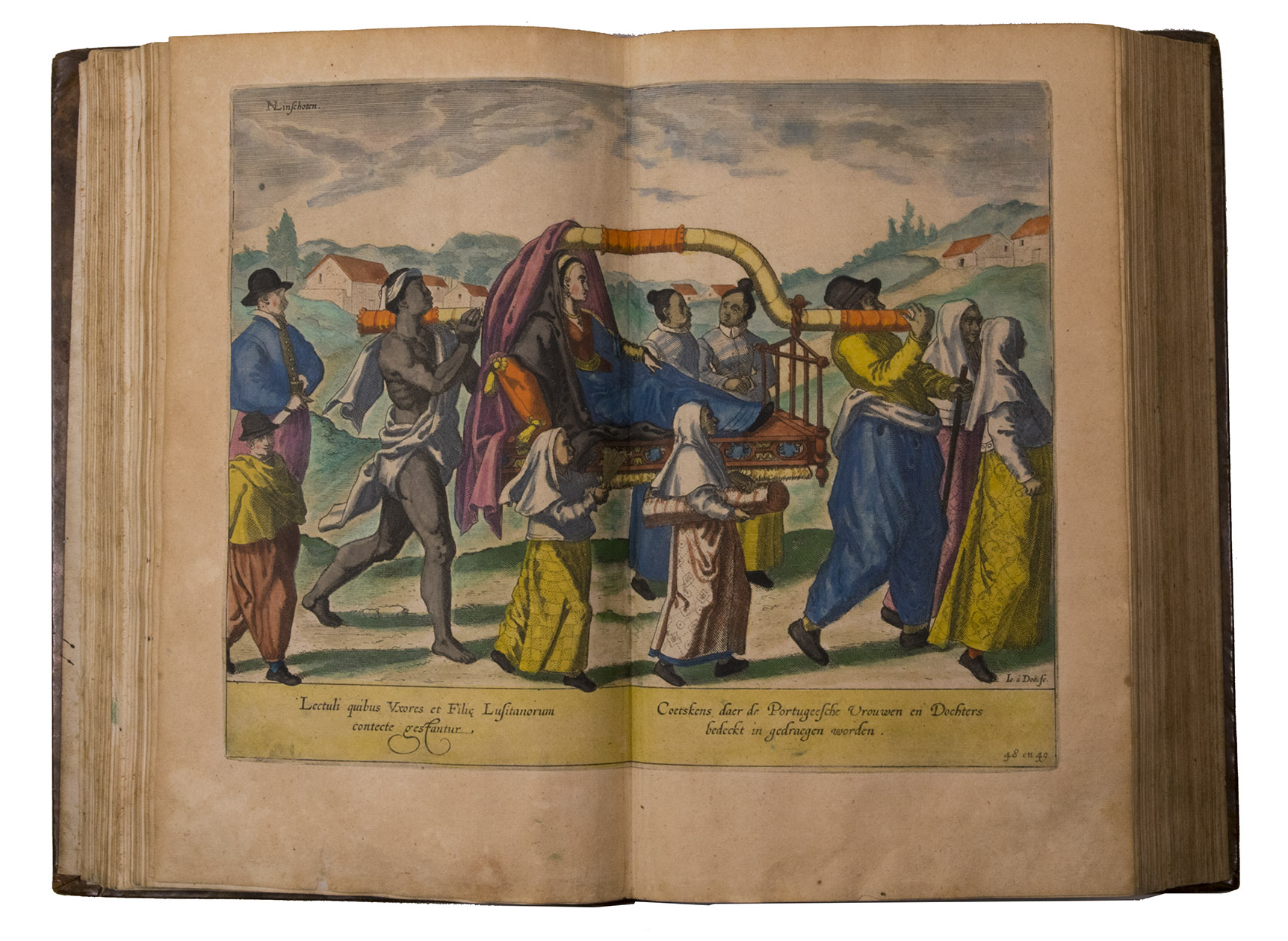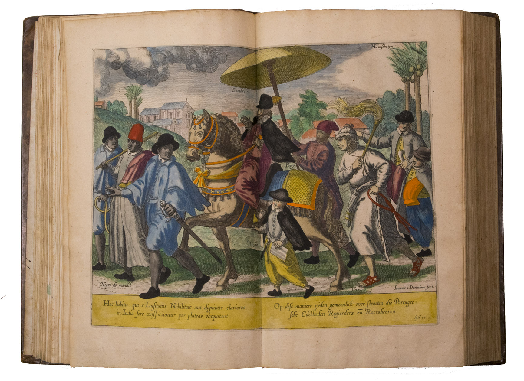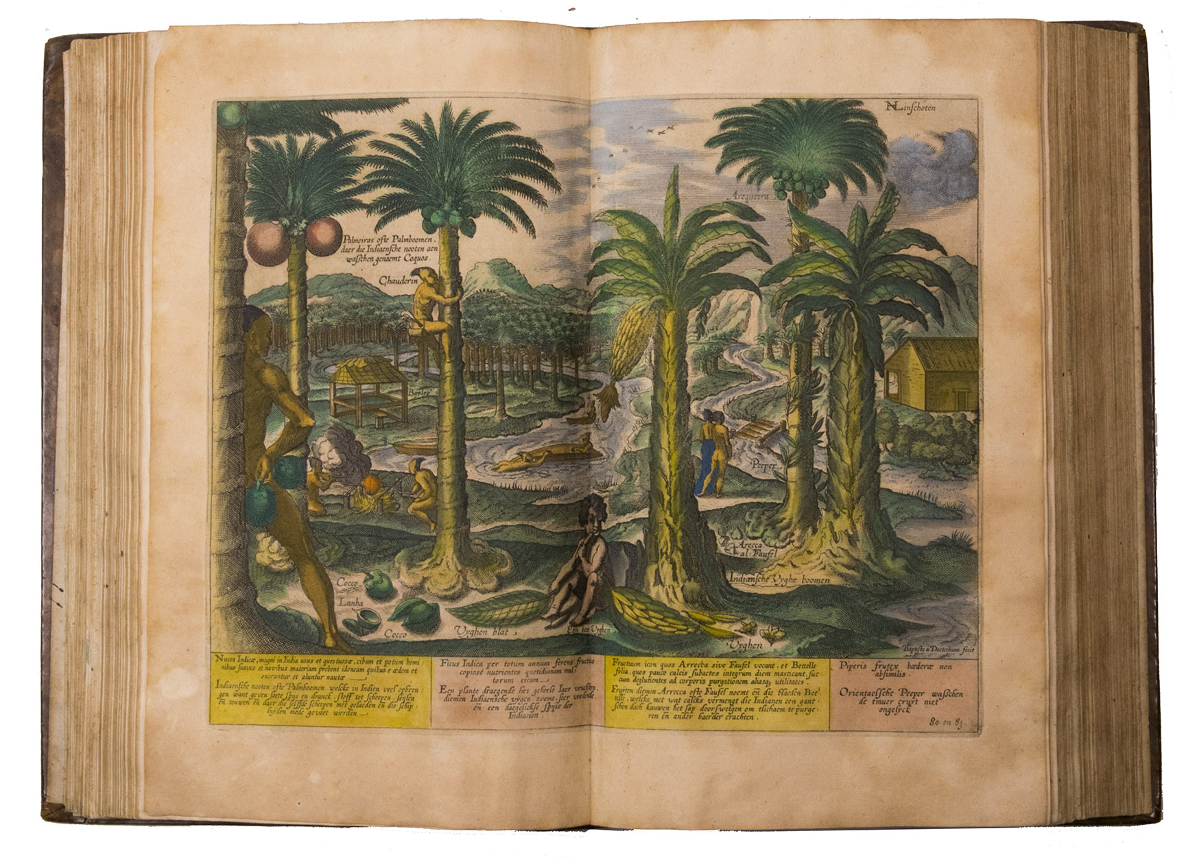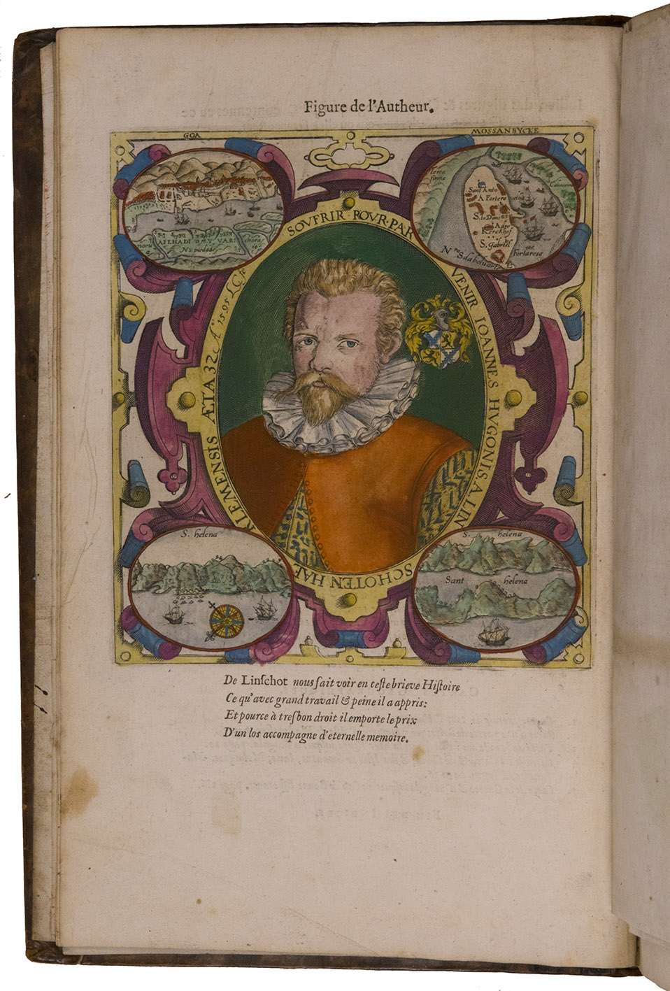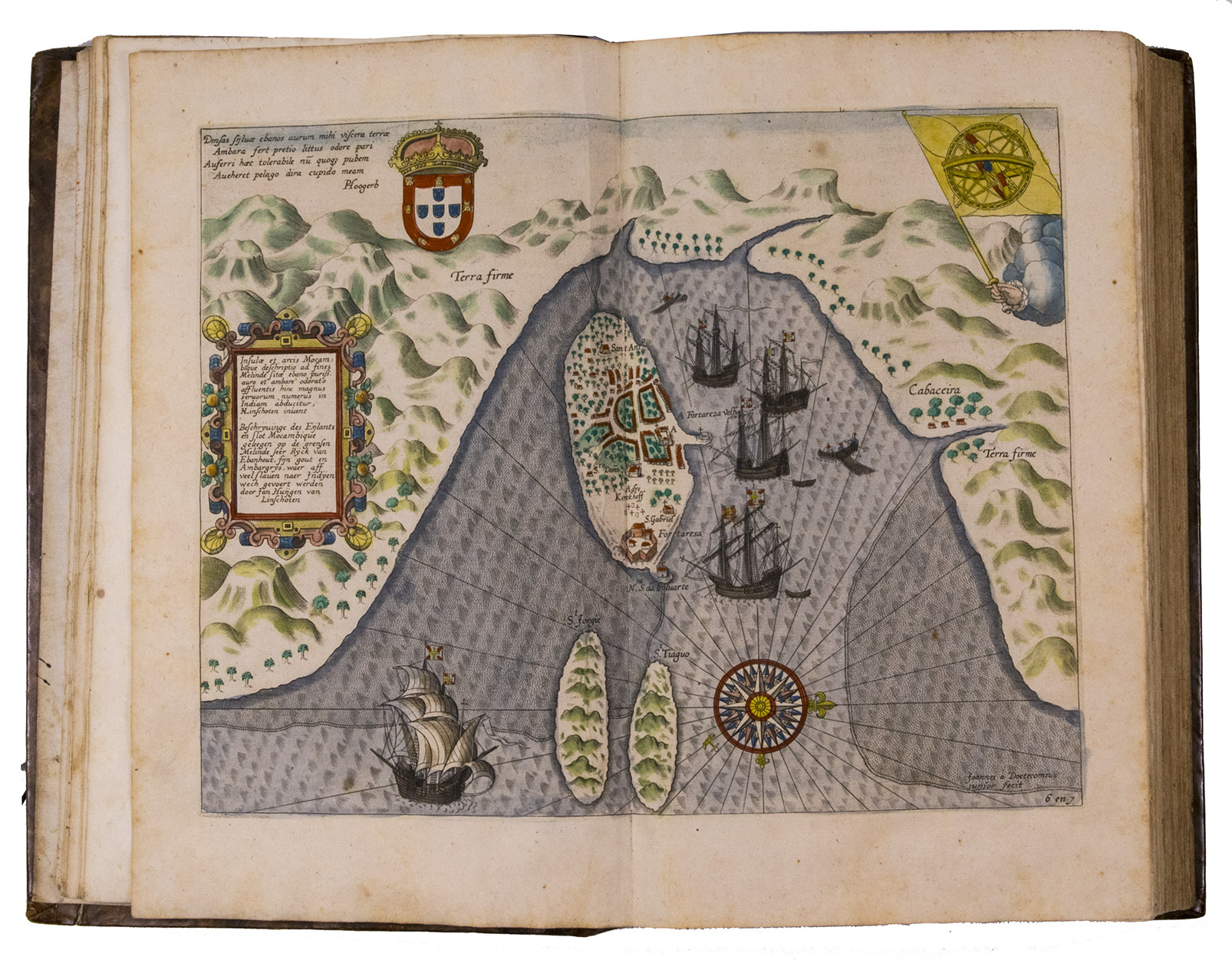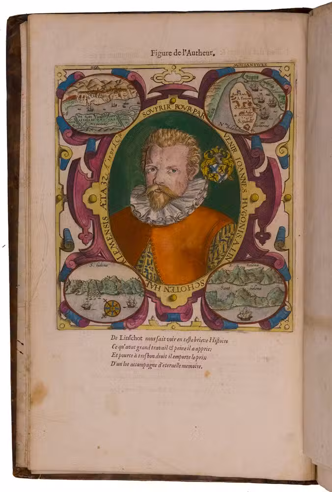 A hand-coloured copy of the third French edition of Linschoten's classic illustrated guide for travellers to the East and West Indies, termed by Lach ''the most important of the first-hand accounts published independently of the great travel collections'' (I.198). No other book contained so much useful intelligence on the East and West Indies. Unhindered by the censorship that constrained writers from the Iberian peninsula (details of seas and coasts in Asia and the Americas were military secrets), he included such information as sailing directions, physical descriptions of countries, and statistics on commerce and trade. The work was held in such high regard that for nearly a century, every Dutch ship sailing to Africa and Asia carried a copy of a Dutch edition of Linschoten. The 42 plates (11 large folding) are especially noteworthy, including 6 maps and several bird's-eye views, many with coats of arms of the regions shown and of the colonial powers that controlled parts of them.