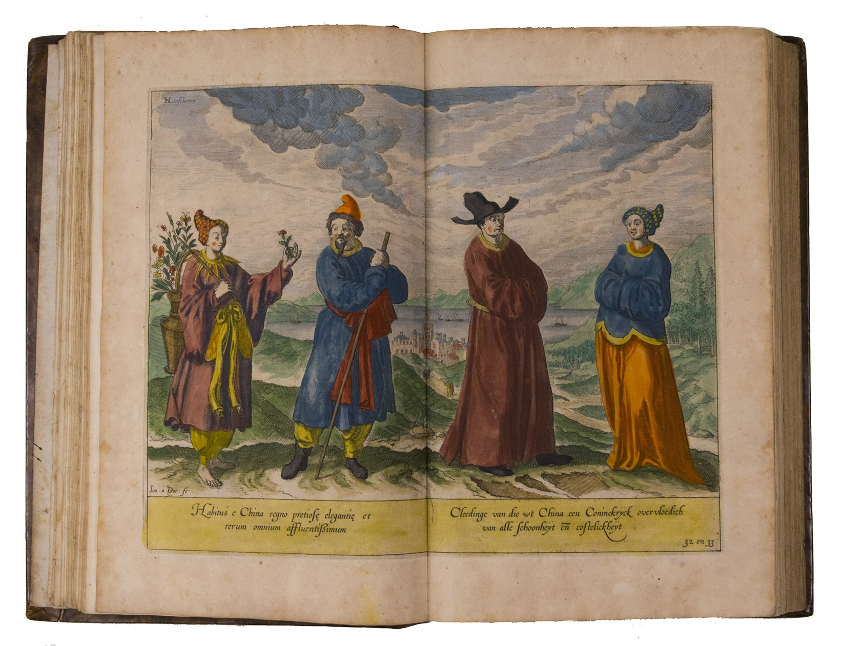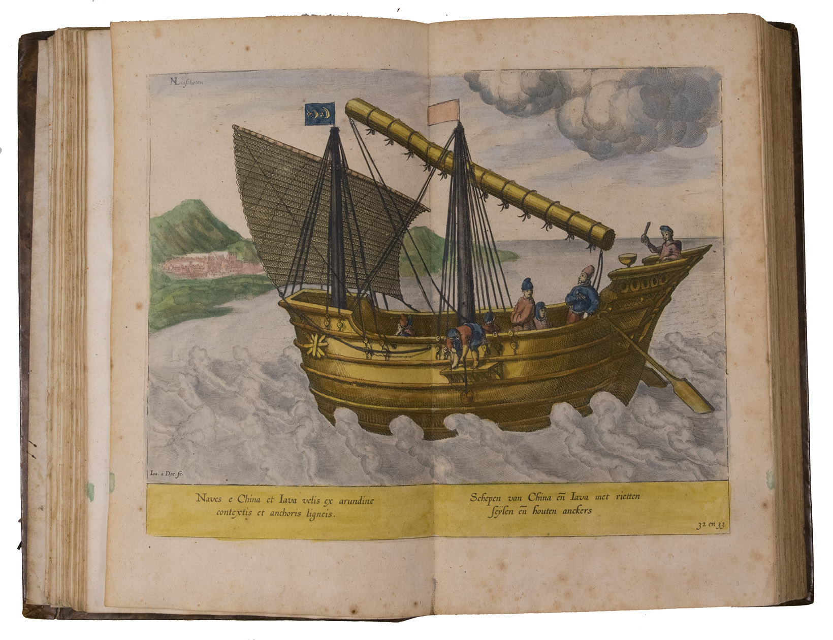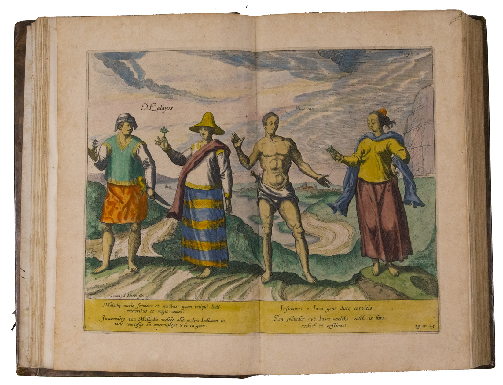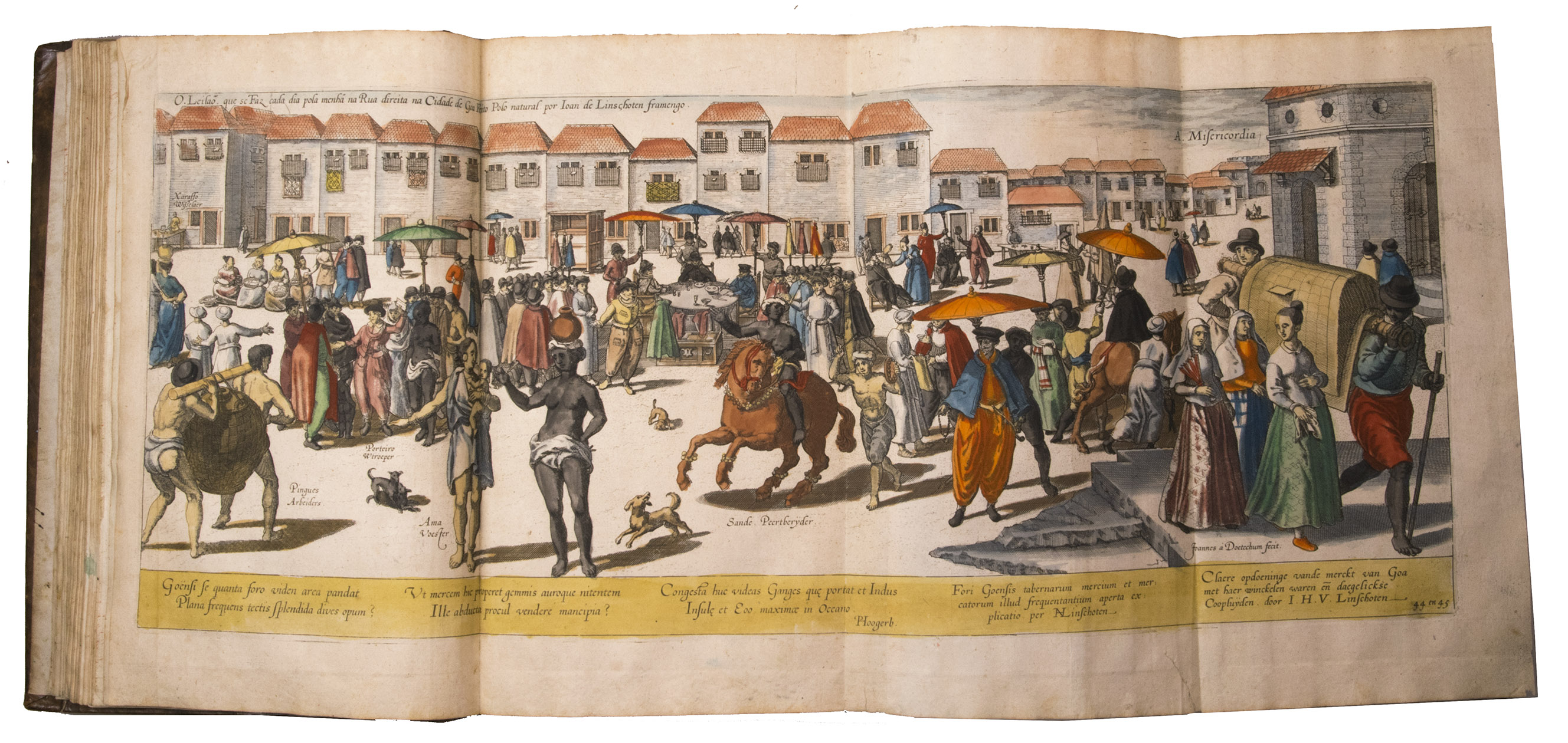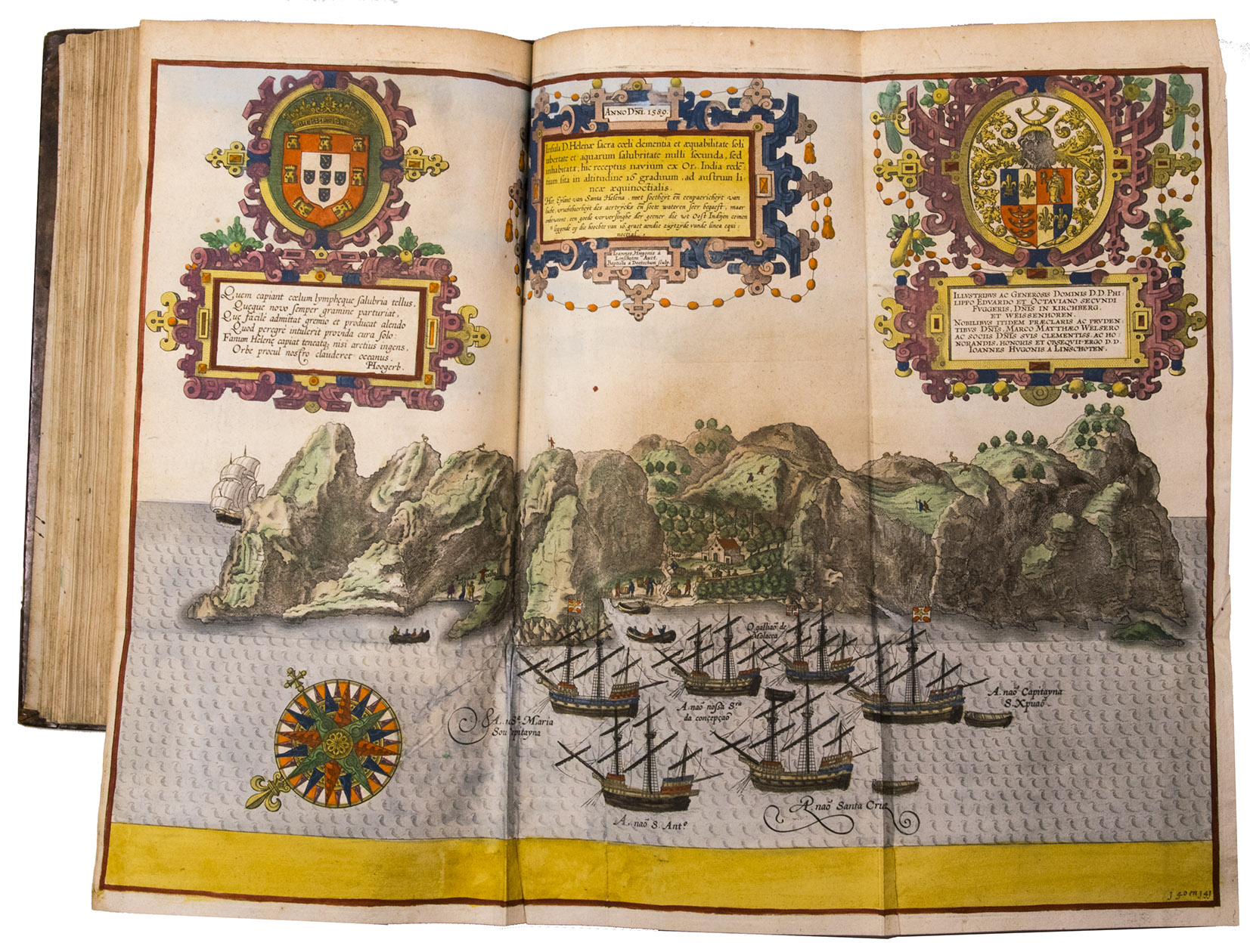 A hand-coloured copy of the third French edition of Linschoten's classic illustrated guide for travellers to the East and West Indies, termed by Lach ''the most important of the first-hand accounts published independently of the great travel collections'' (I.198). No other book contained so much useful intelligence on the East and West Indies. Unhindered by the censorship that constrained writers from the Iberian peninsula (details of seas and coasts in Asia and the Americas were military secrets), he included such information as sailing directions, physical descriptions of countries, and statistics on commerce and trade. The work was held in such high regard that for nearly a century, every Dutch ship sailing to Africa and Asia carried a copy of a Dutch edition of Linschoten. The 42 plates (11 large folding) are especially noteworthy, including 6 maps and several bird's-eye views, many with coats of arms of the regions shown and of the colonial powers that controlled parts of them.
