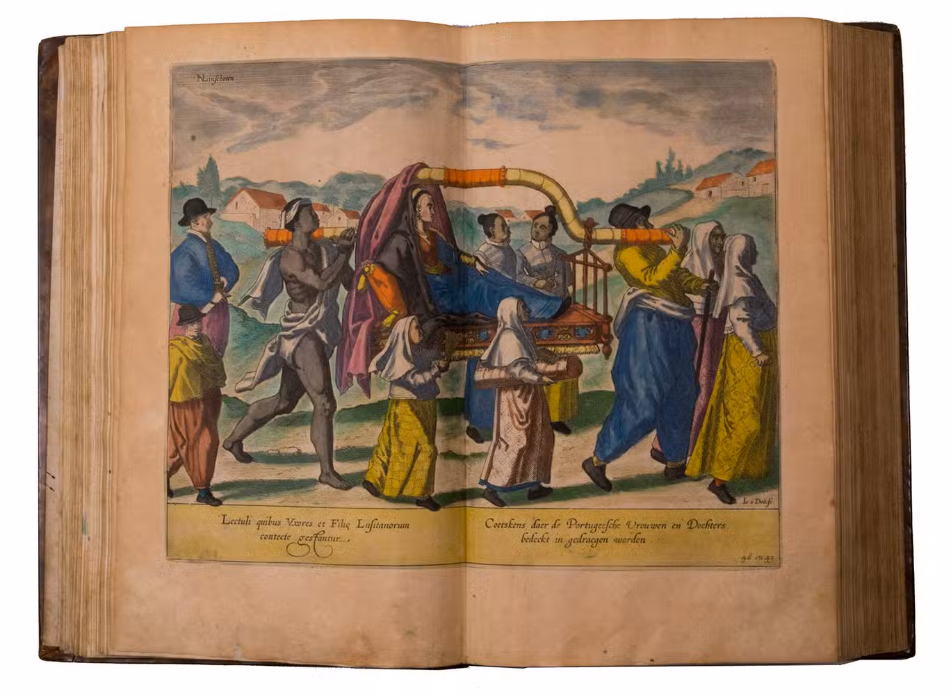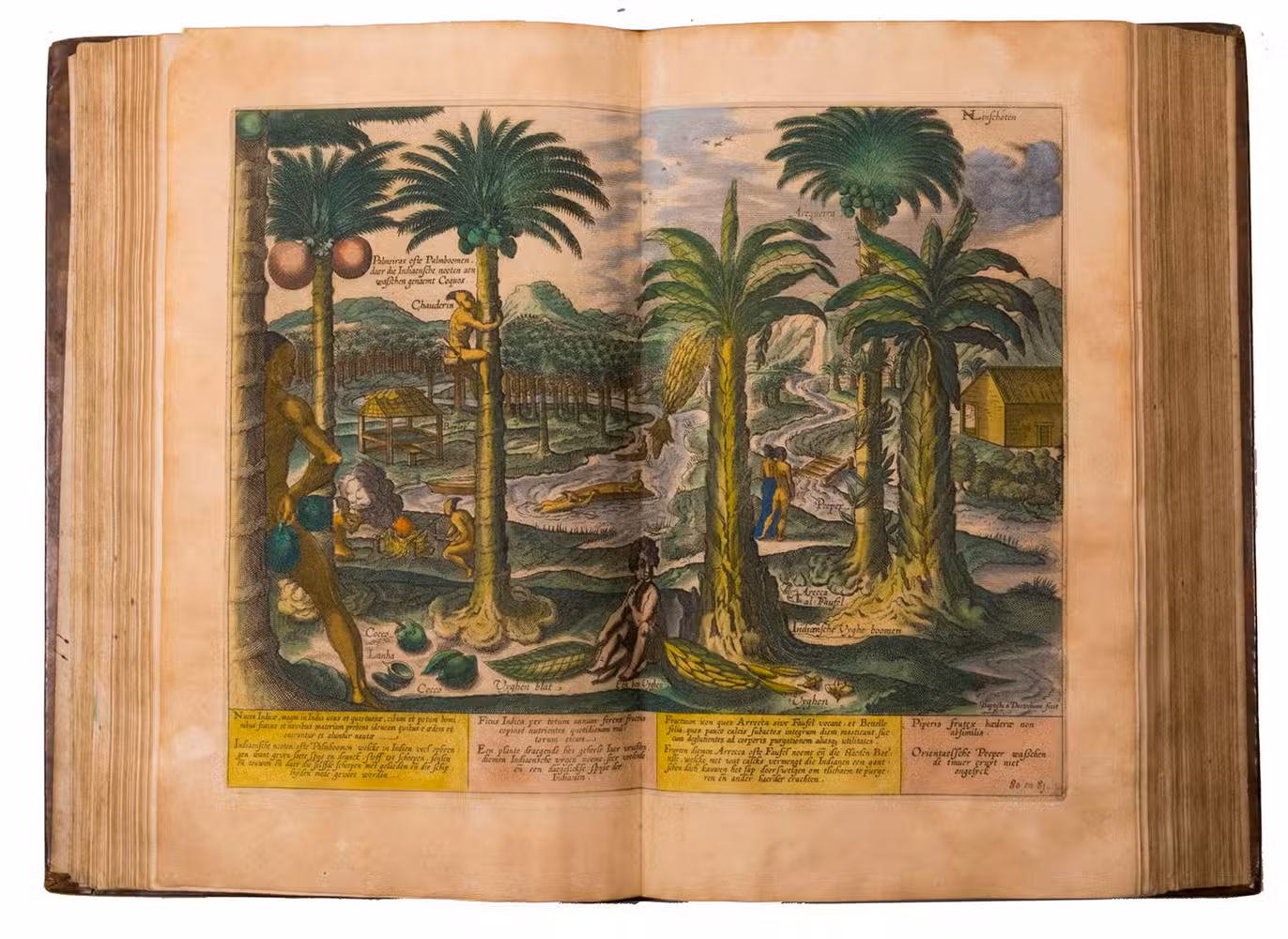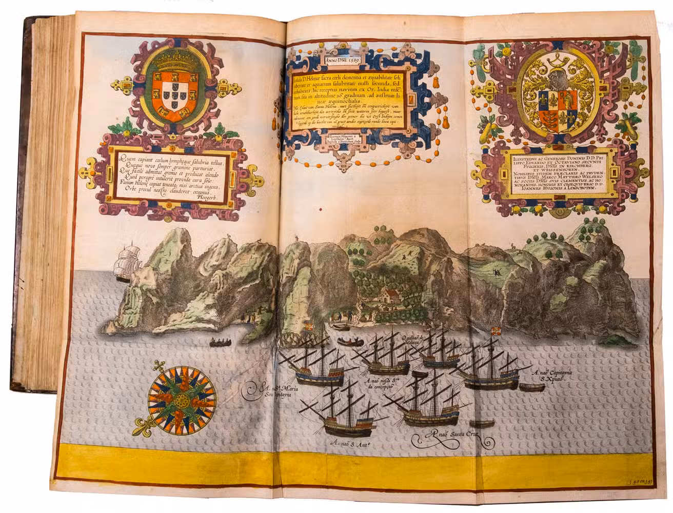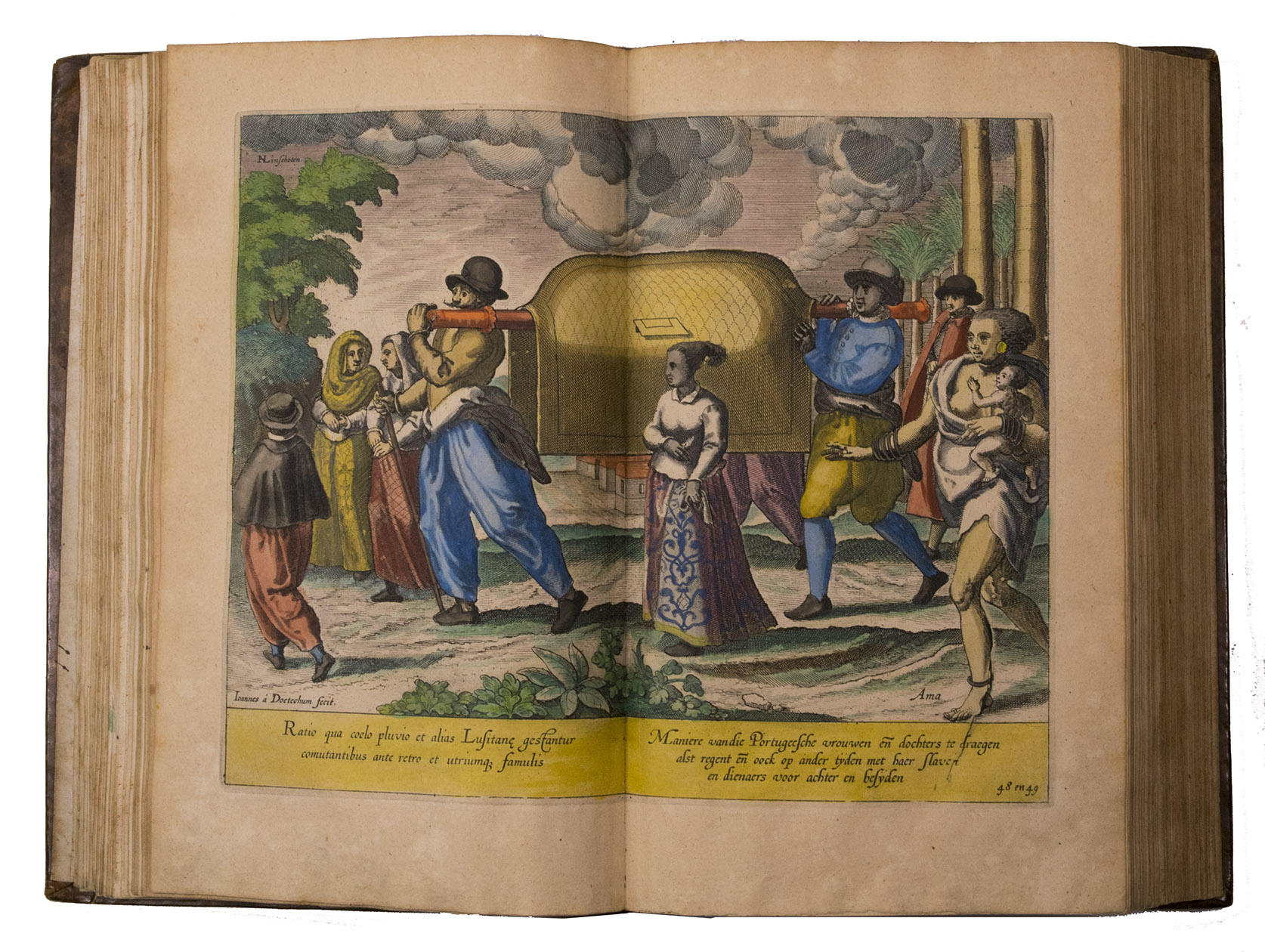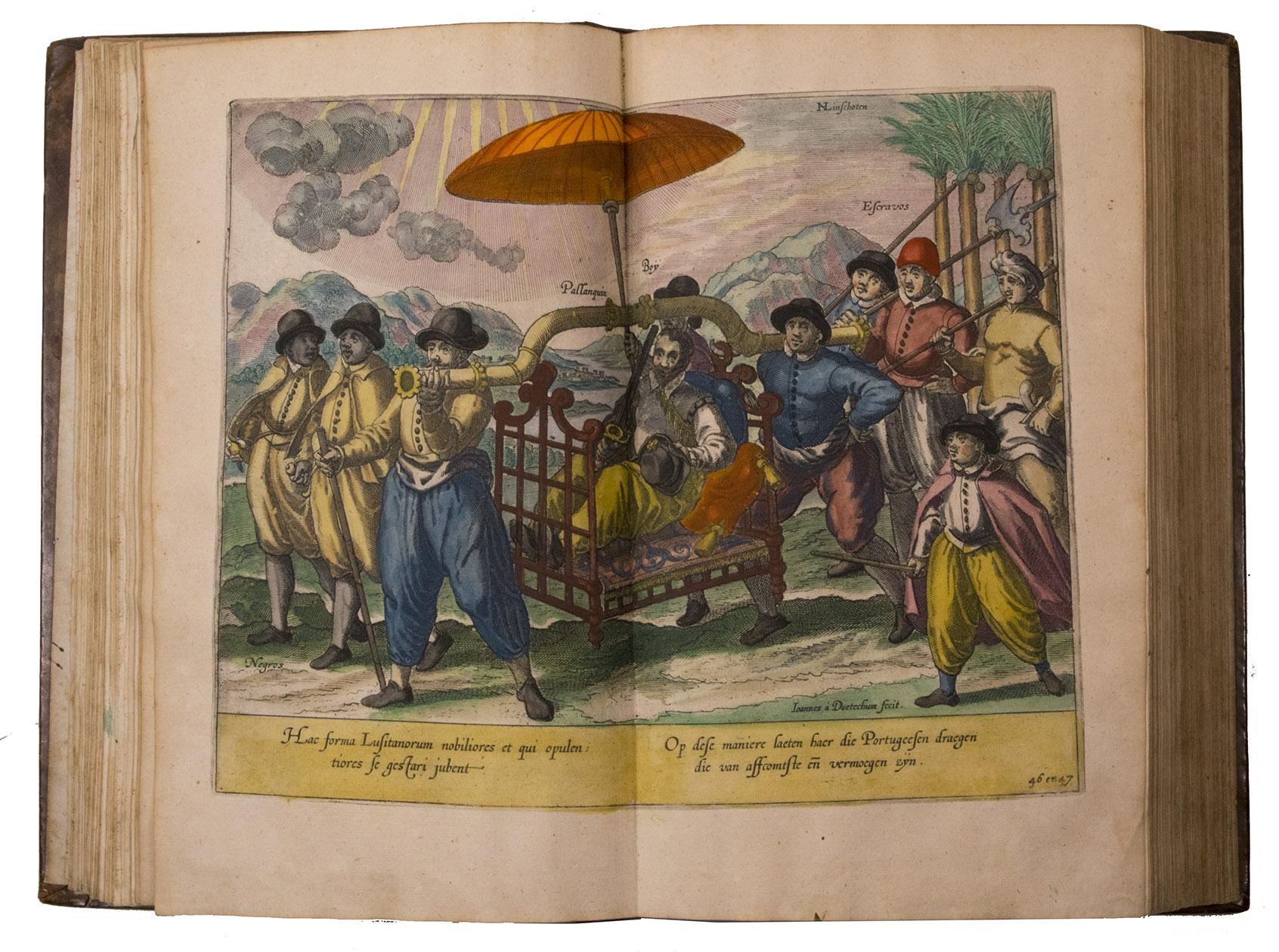 A hand-coloured copy of the third French edition of Linschoten's classic illustrated guide for travellers to the East and West Indies, termed by Lach ''the most important of the first-hand accounts published independently of the great travel collections'' (I.198). No other book contained so much useful intelligence on the East and West Indies. Unhindered by the censorship that constrained writers from the Iberian peninsula (details of seas and coasts in Asia and the Americas were military secrets), he included such information as sailing directions, physical descriptions of countries, and statistics on commerce and trade. The work was held in such high regard that for nearly a century, every Dutch ship sailing to Africa and Asia carried a copy of a Dutch edition of Linschoten. The 42 plates (11 large folding) are especially noteworthy, including 6 maps and several bird's-eye views, many with coats of arms of the regions shown and of the colonial powers that controlled parts of them.