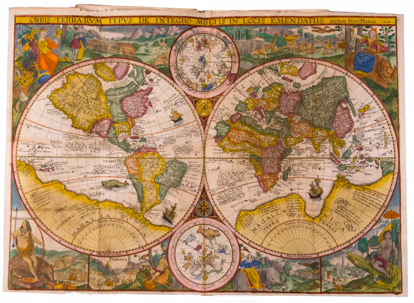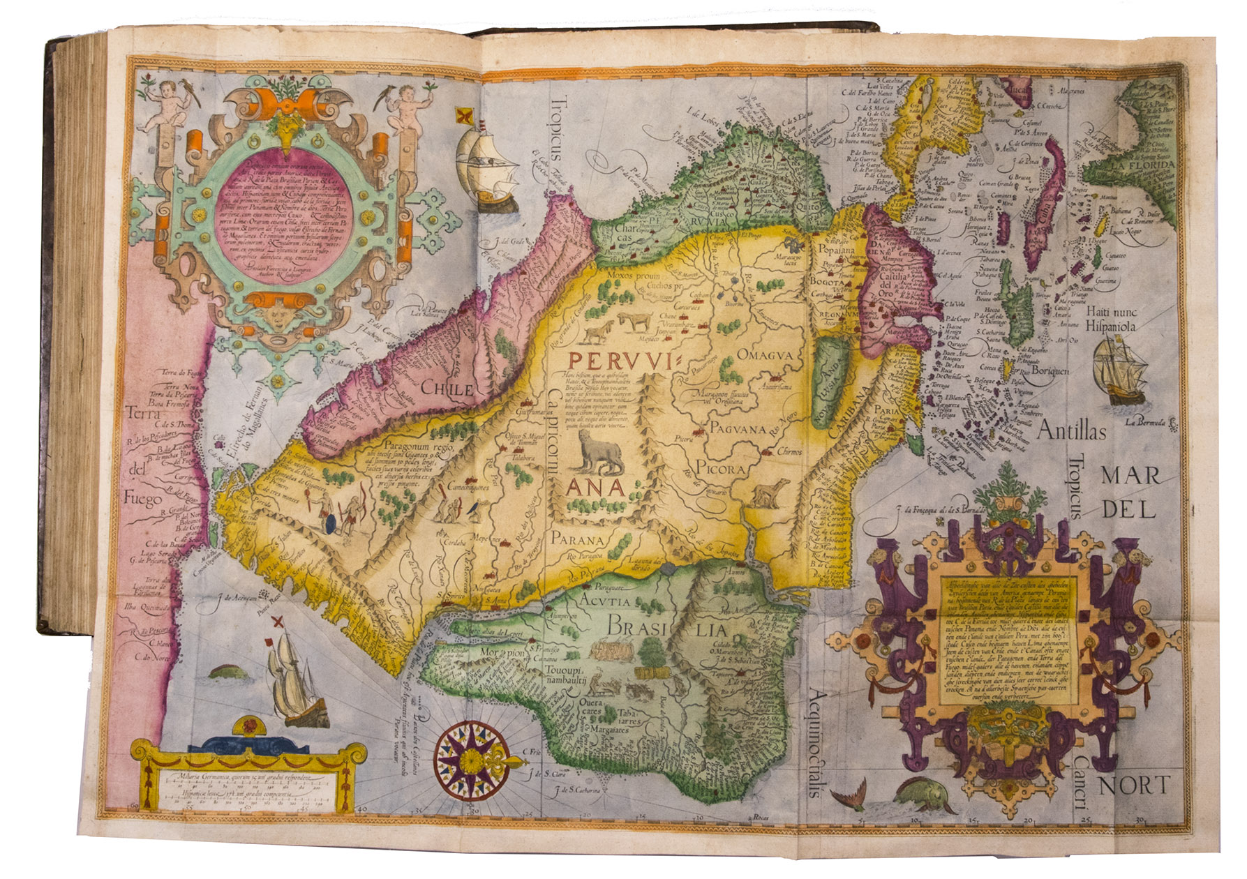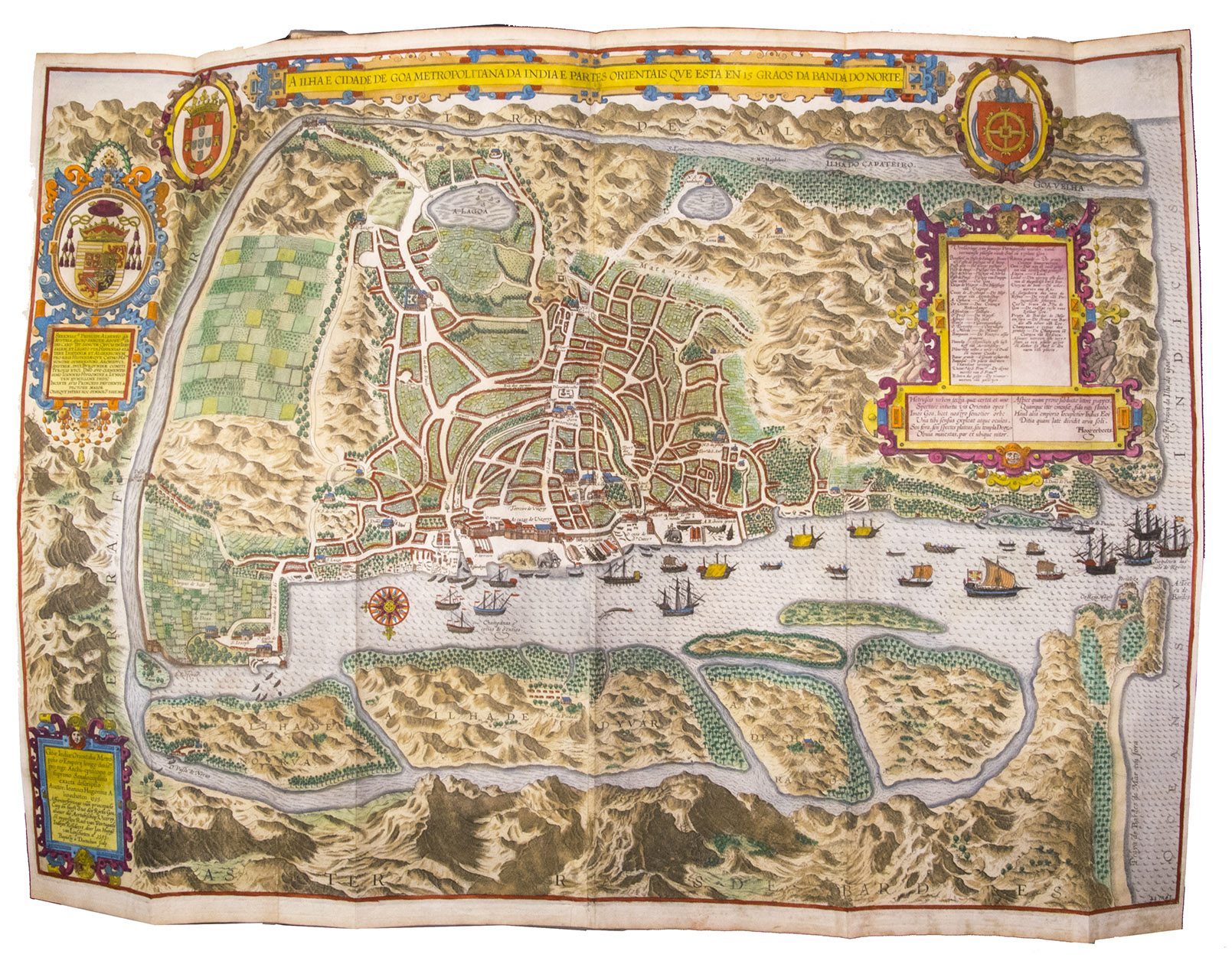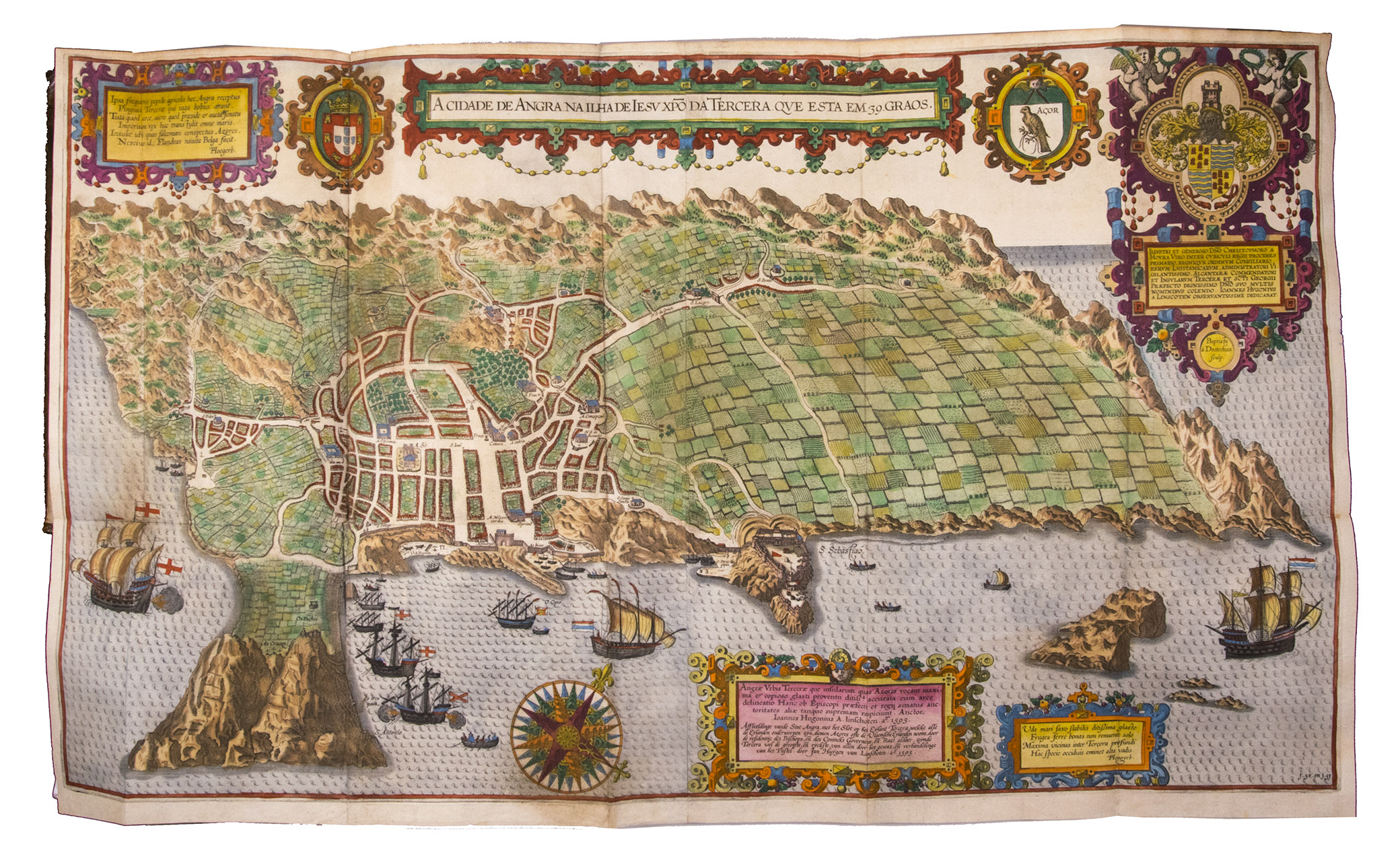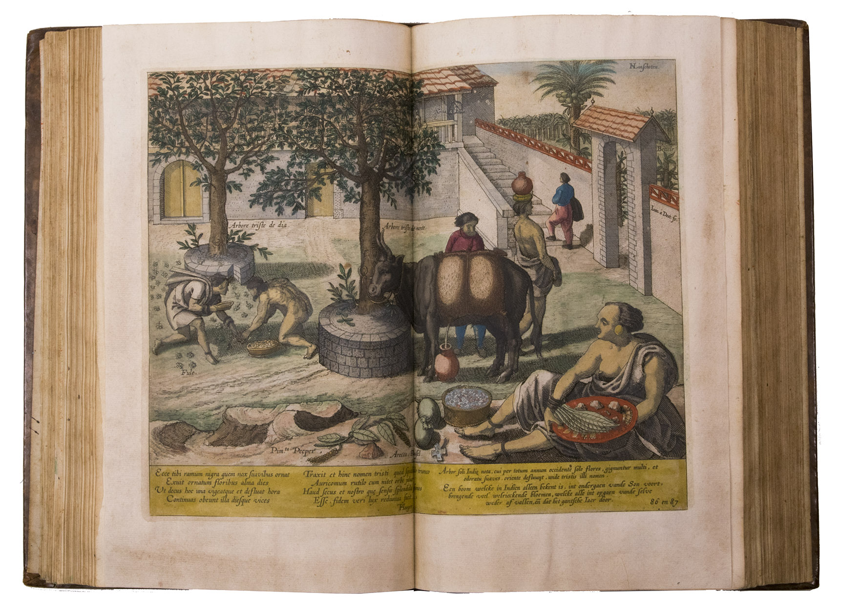 A hand-coloured copy of the third French edition of Linschoten's classic illustrated guide for travellers to the East and West Indies, termed by Lach ''the most important of the first-hand accounts published independently of the great travel collections'' (I.198). No other book contained so much useful intelligence on the East and West Indies. Unhindered by the censorship that constrained writers from the Iberian peninsula (details of seas and coasts in Asia and the Americas were military secrets), he included such information as sailing directions, physical descriptions of countries, and statistics on commerce and trade. The work was held in such high regard that for nearly a century, every Dutch ship sailing to Africa and Asia carried a copy of a Dutch edition of Linschoten. The 42 plates (11 large folding) are especially noteworthy, including 6 maps and several bird's-eye views, many with coats of arms of the regions shown and of the colonial powers that controlled parts of them.