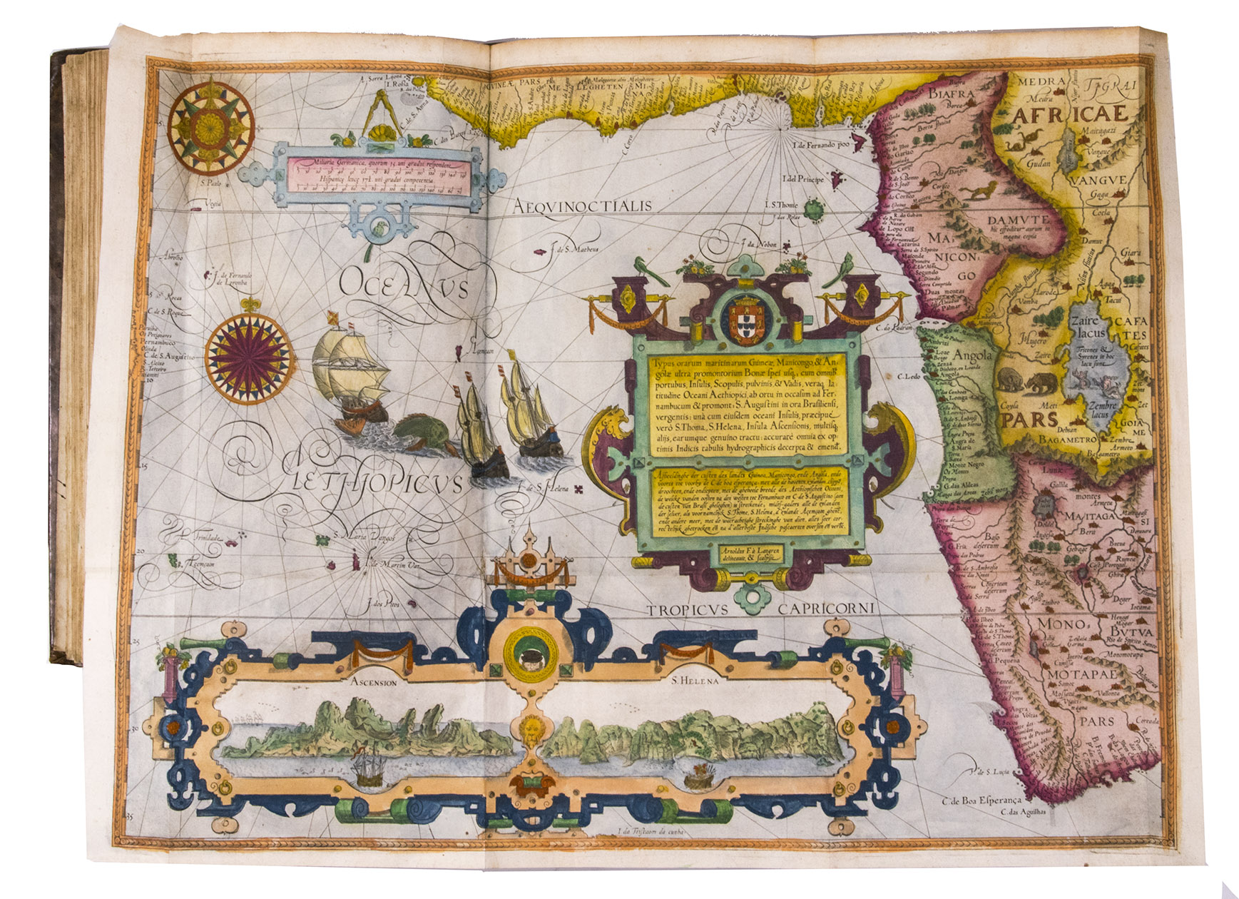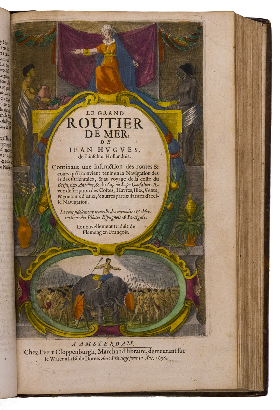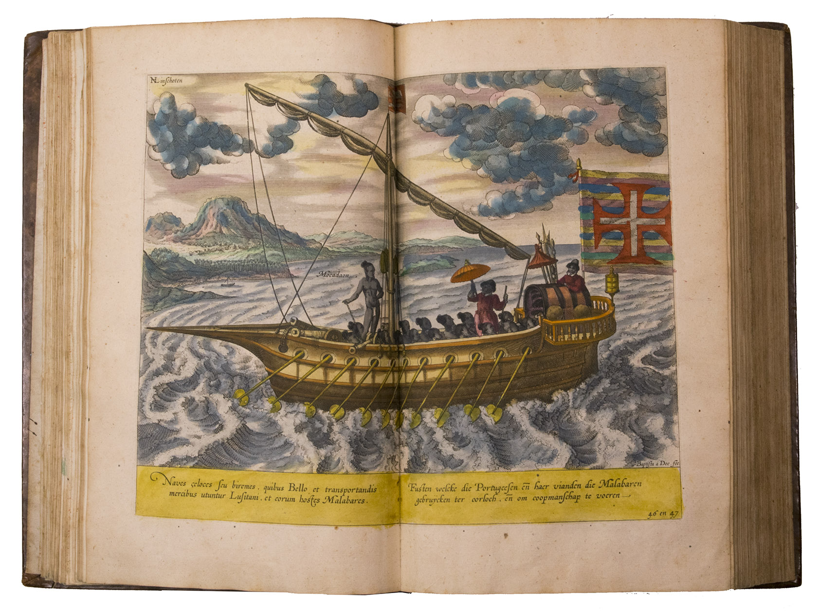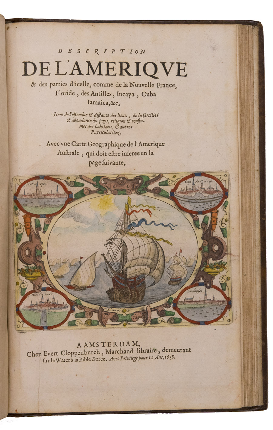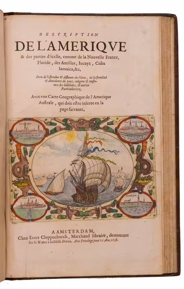 Amsterdam, Evert Cloppenburg, 1638. Folio (32.5 x 21 cm). With 3 title pages (2 from the same full-page engraving and 1 letterpress with an engraving of a ship in a cartouche with 4 inset city views), a nearly full-page engraved portrait of the author in a cartouche with 4 inset views, 42 engraved plates including 6 maps (31 double-page & 11 larger folding). All plates coloured by a contemporary hand. Near contemporary mottled calf, gold-tooled spine. [8], 206 pp.; [4], 181, [1 blank]; [1], [1 blank], “86” [= 80], [2 blank] pp.