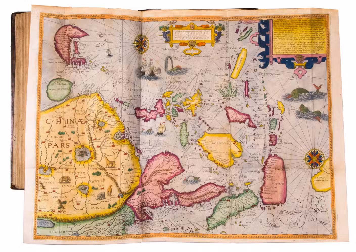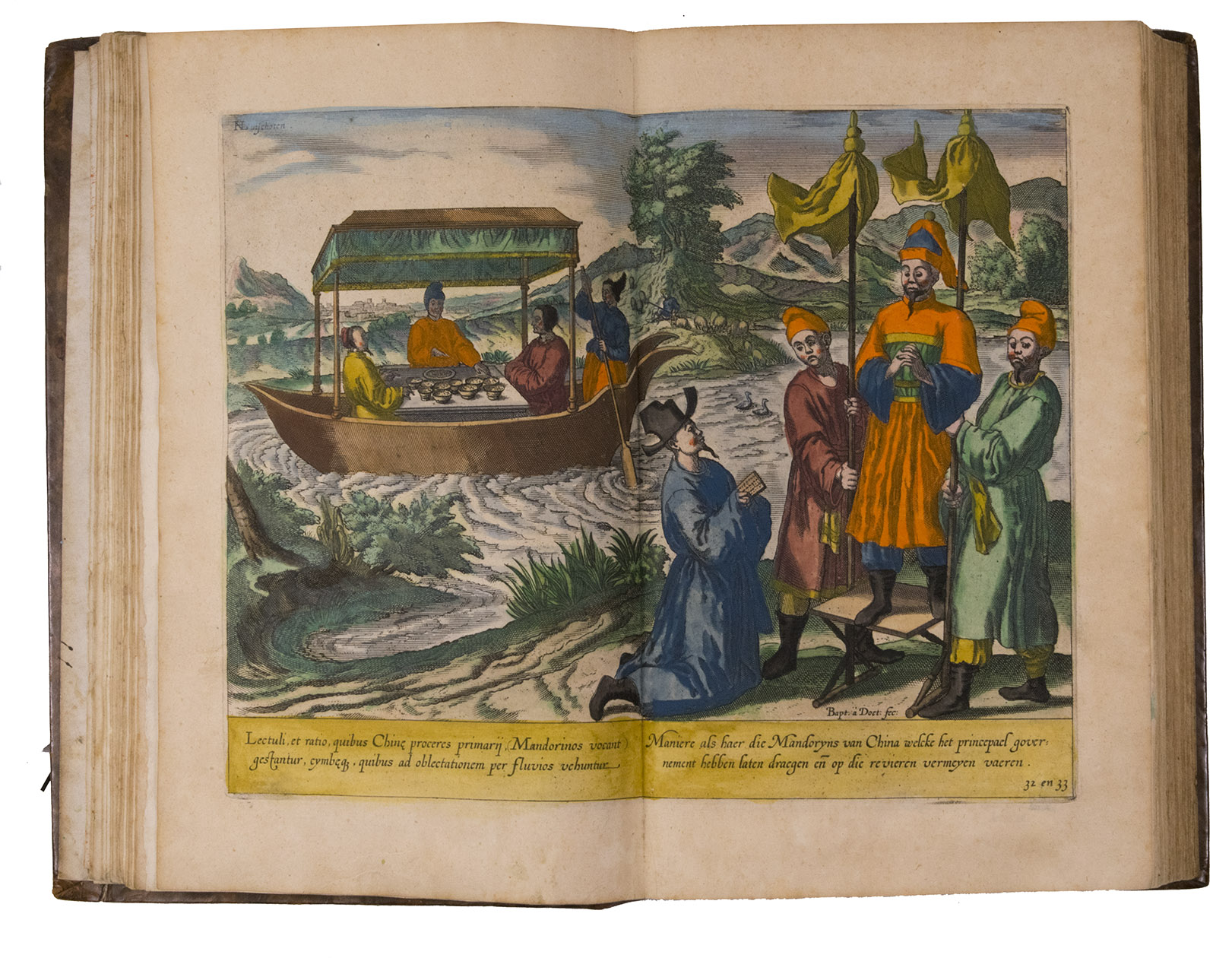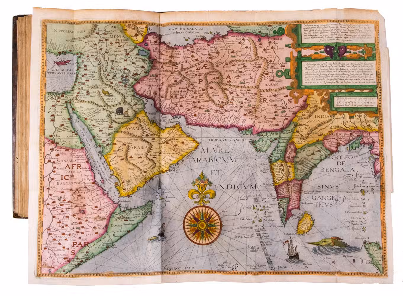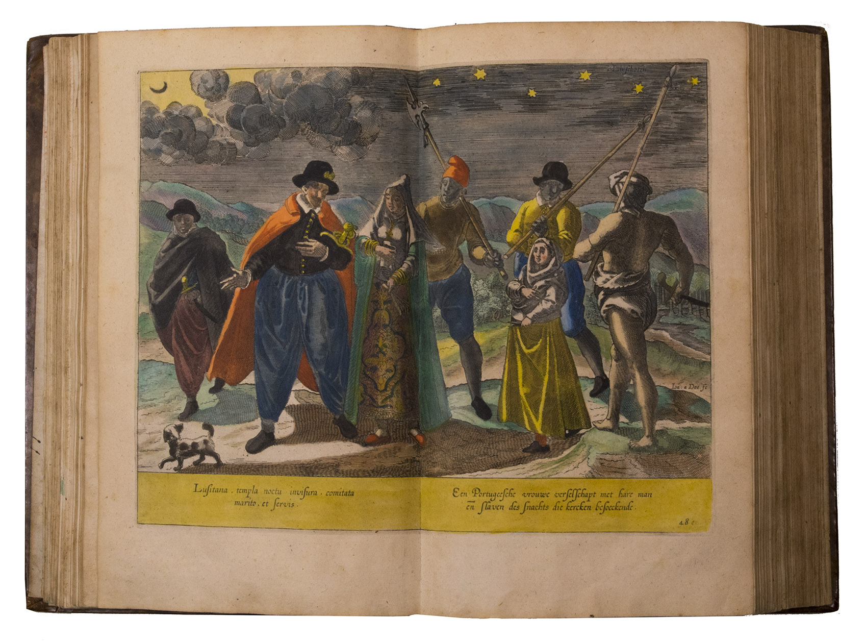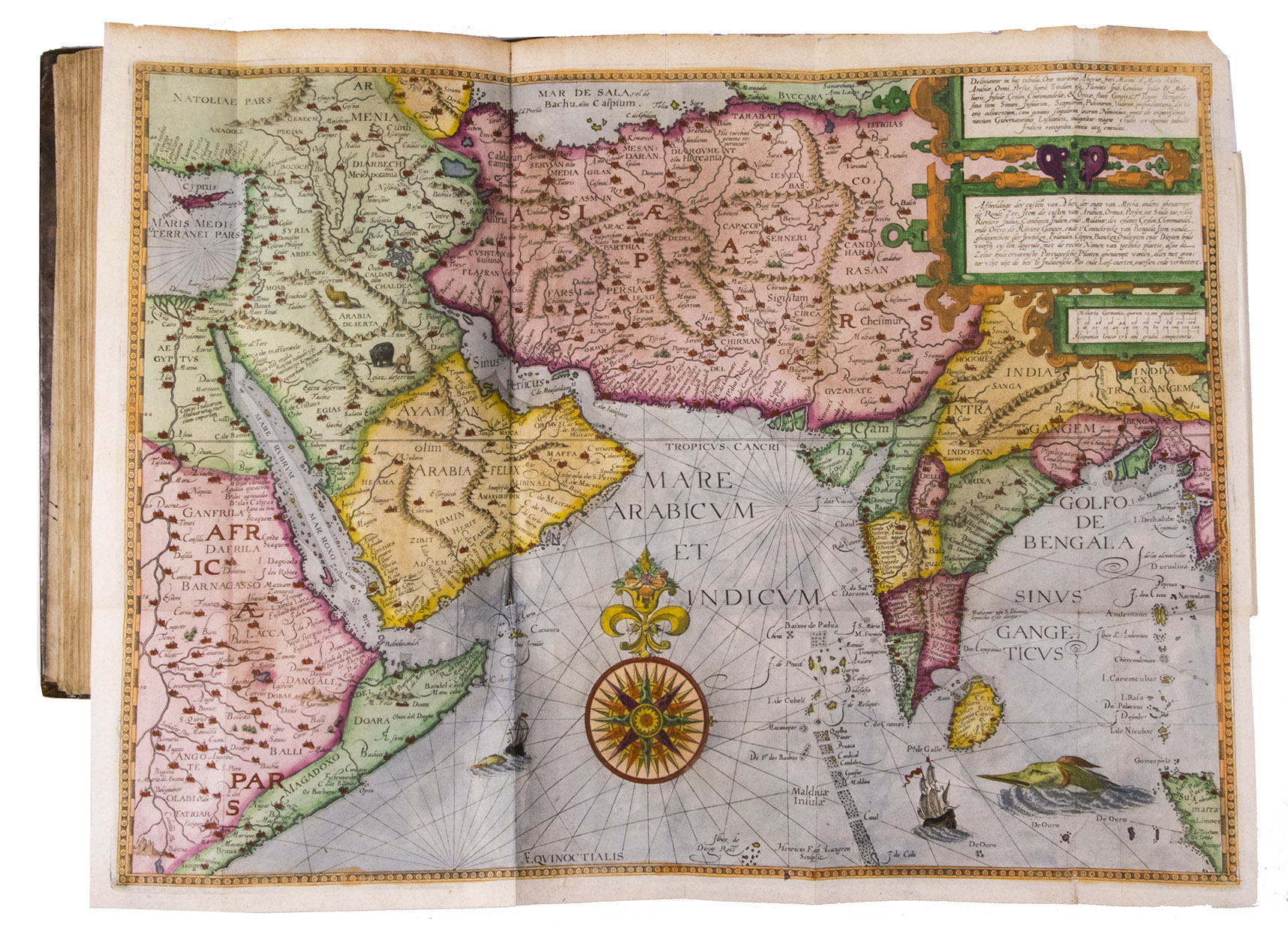 Amsterdam, Evert Cloppenburg, 1638. Folio (32.5 x 21 cm). With 3 title pages (2 from the same full-page engraving and 1 letterpress with an engraving of a ship in a cartouche with 4 inset city views), a nearly full-page engraved portrait of the author in a cartouche with 4 inset views, 42 engraved plates including 6 maps (31 double-page & 11 larger folding). All plates coloured by a contemporary hand. Near contemporary mottled calf, gold-tooled spine. [8], 206 pp.; [4], 181, [1 blank]; [1], [1 blank], “86” [= 80], [2 blank] pp.