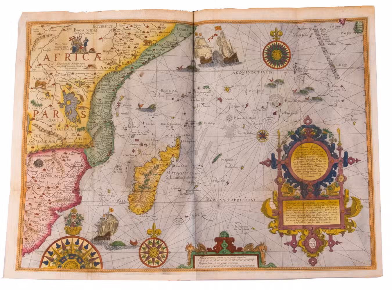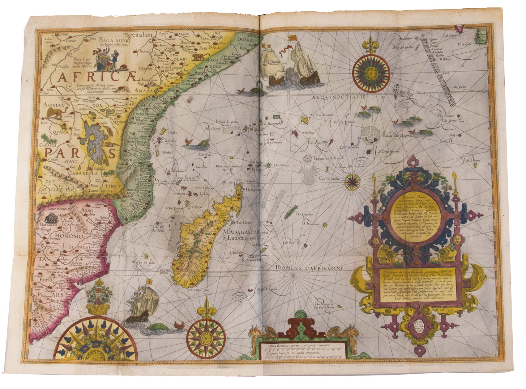The text is divided into three parts. The first part covers the East Indies and East Africa, including regions as far east as Japan. The second describes the navigation along the coasts of West Africa around the Cape of Good Hope to Arabia, together with some coasts in the New World. The third book is devoted to North America, the Caribbean and Brazil.