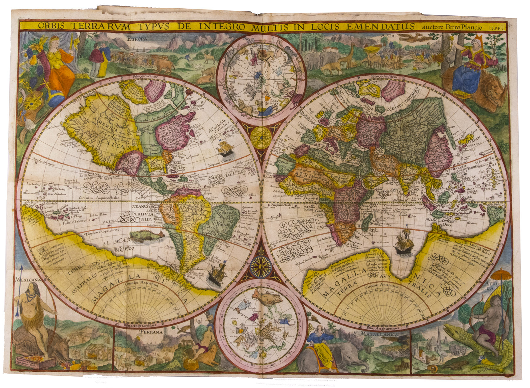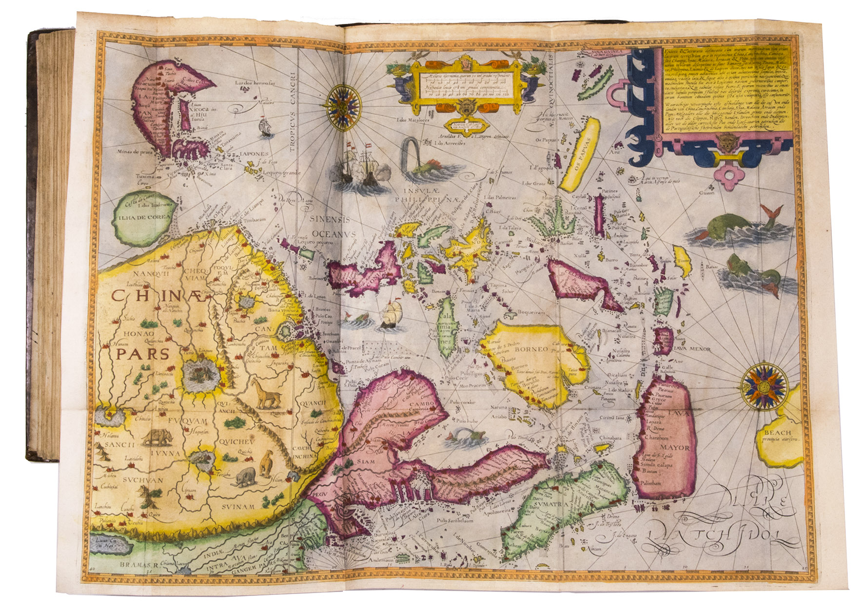 About 4 sheets slightly browned and a few others with spots or minor foxing, a tear repaired in the title-page to part 3 (not affecting the text or engraving), one plate was cut and reattached at an early date and a few others show very minor browning or small tears where the folds cross, the corner of one leaf torn off (without loss of text) and a few other minor marginal defects, but still generally in very good condition, with the colouring rich and in good condition. The boards are slightly rubbed and the head and foot of the spine expertly restored, but the binding is still in good condition. A seminal work on navigation to the East and West Indies that opened up exploration to explorers outside Spain and Portugal. Alden & Landis 638/37 (8 copies); Burnell & Tiele, The voyage of John Huyghen van Linschoten to the East Indies, Hakluyt Society (old series) LXX-LXXI (London 1885); JCB II, p. 271; Lach, Asia in the making of Europe, 1.1.196-204 & 482-490; Palau 138584; Sabin 41373 & 28266 (parts 1 & 2, cf. 19701 & 49497: 1619 ed. of part 3); STCN (3 copies); Tiele, Bibl. 686-688.
