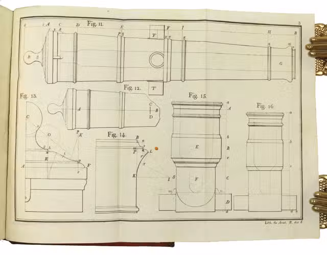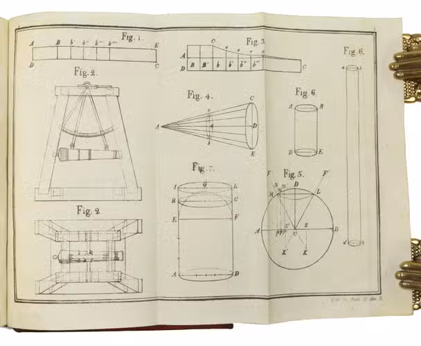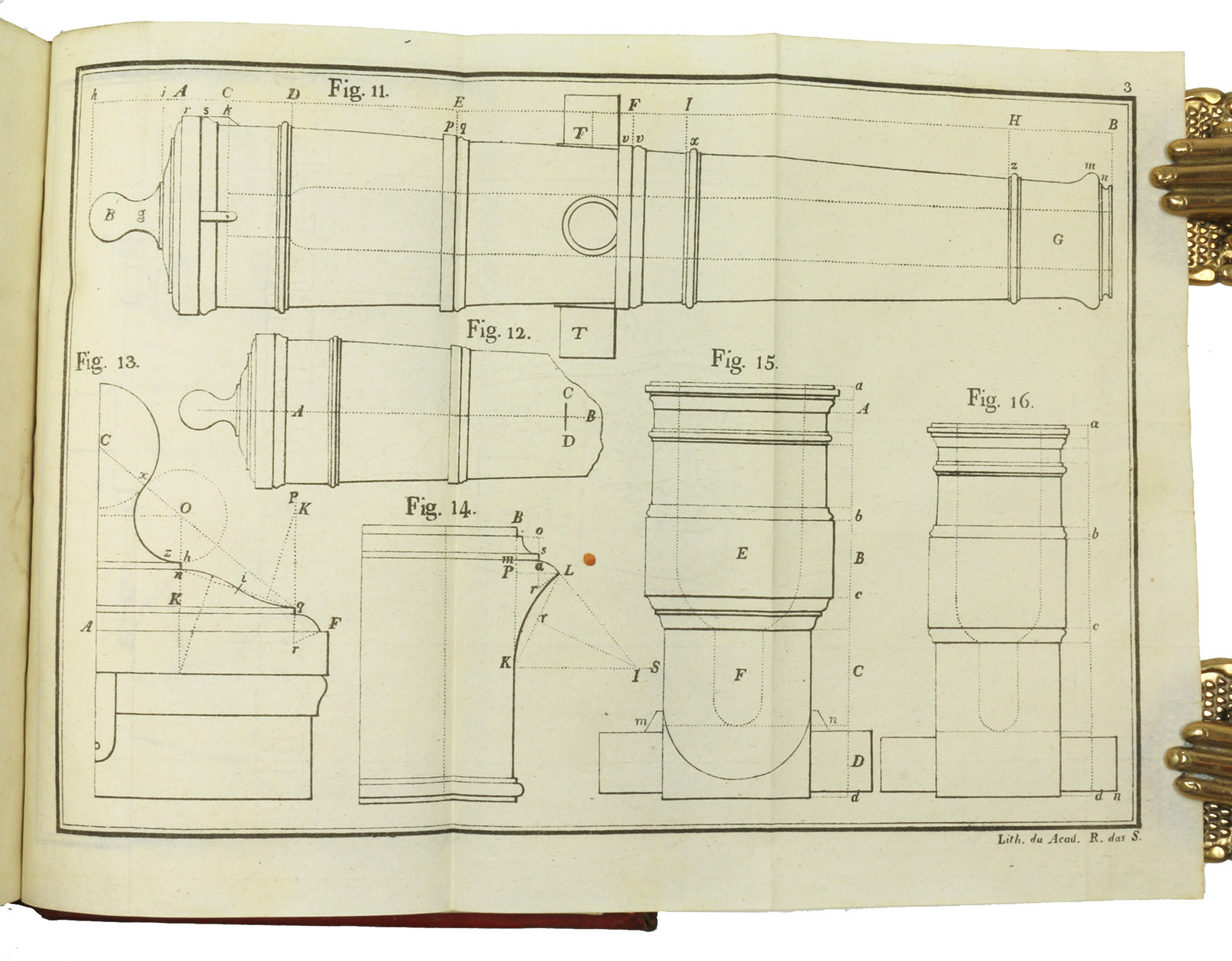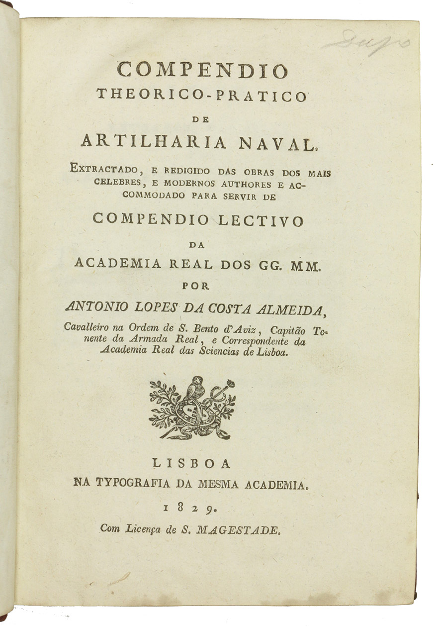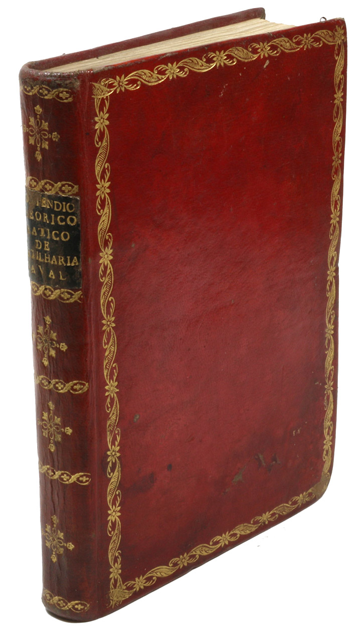Rare handbook of naval warfare by the Royal Army captain Lopes da Costa Almeida (1784-1859), barão de Reboredo; essentially a manual for the suitable deployment of ordnance at sea. A member of the Academia Real dos Guardas-Marinhas and the Naval Artillery, Lopes could draw on years of experience in the field for describing the appropriate weaponry and ammunition for various purposes and distances. The plates depict cannons and geometric calculations as well as projectile trajectories.