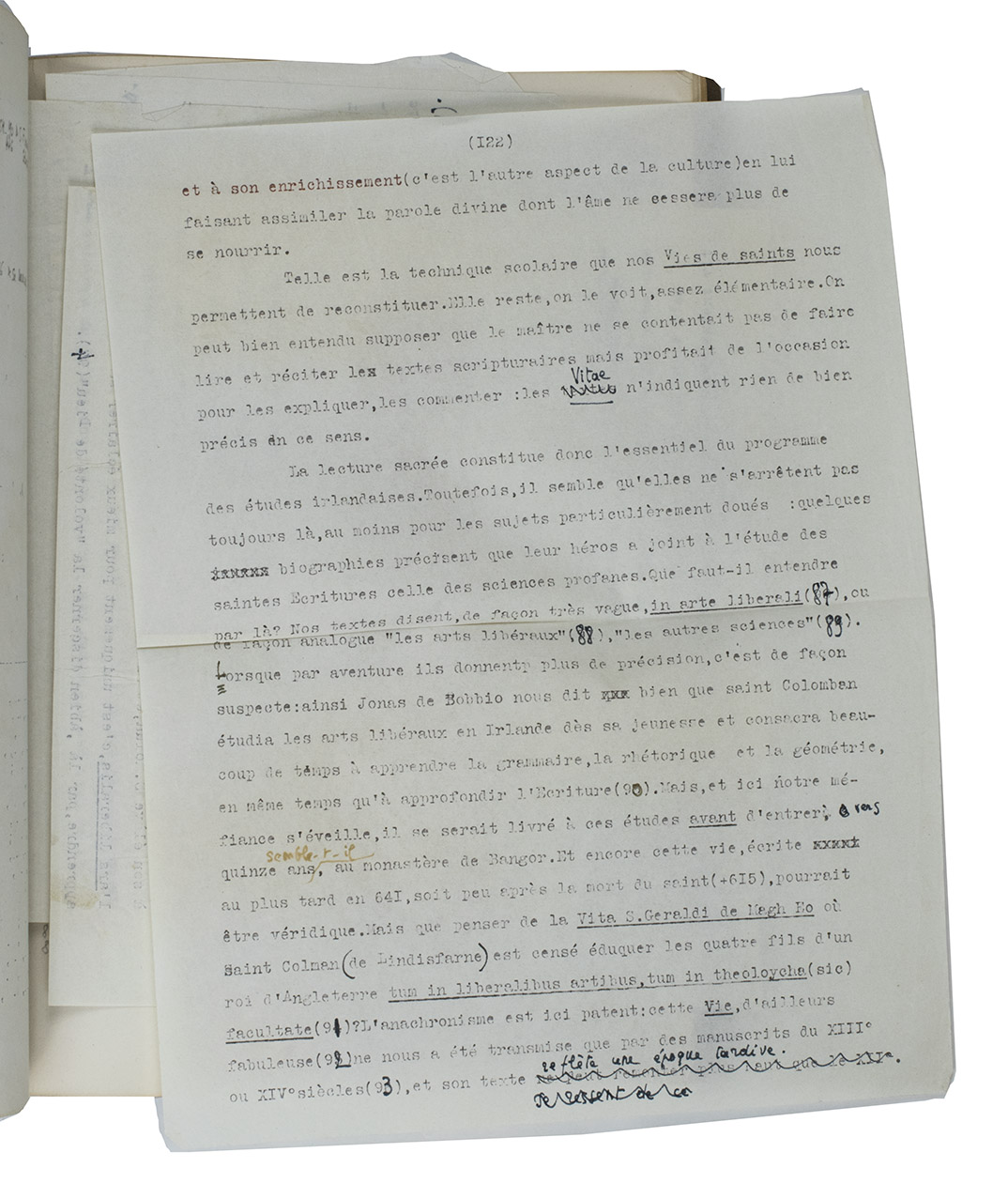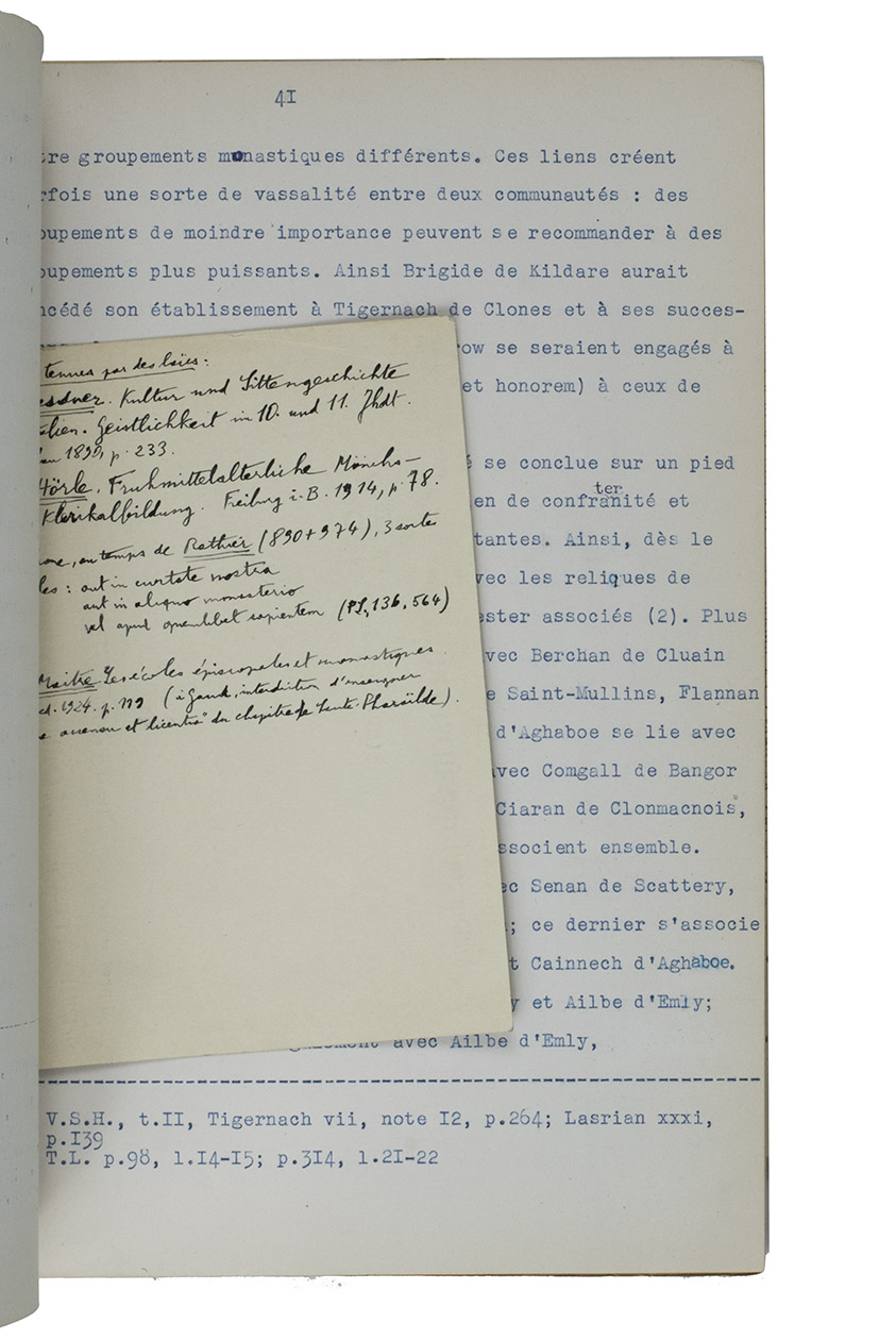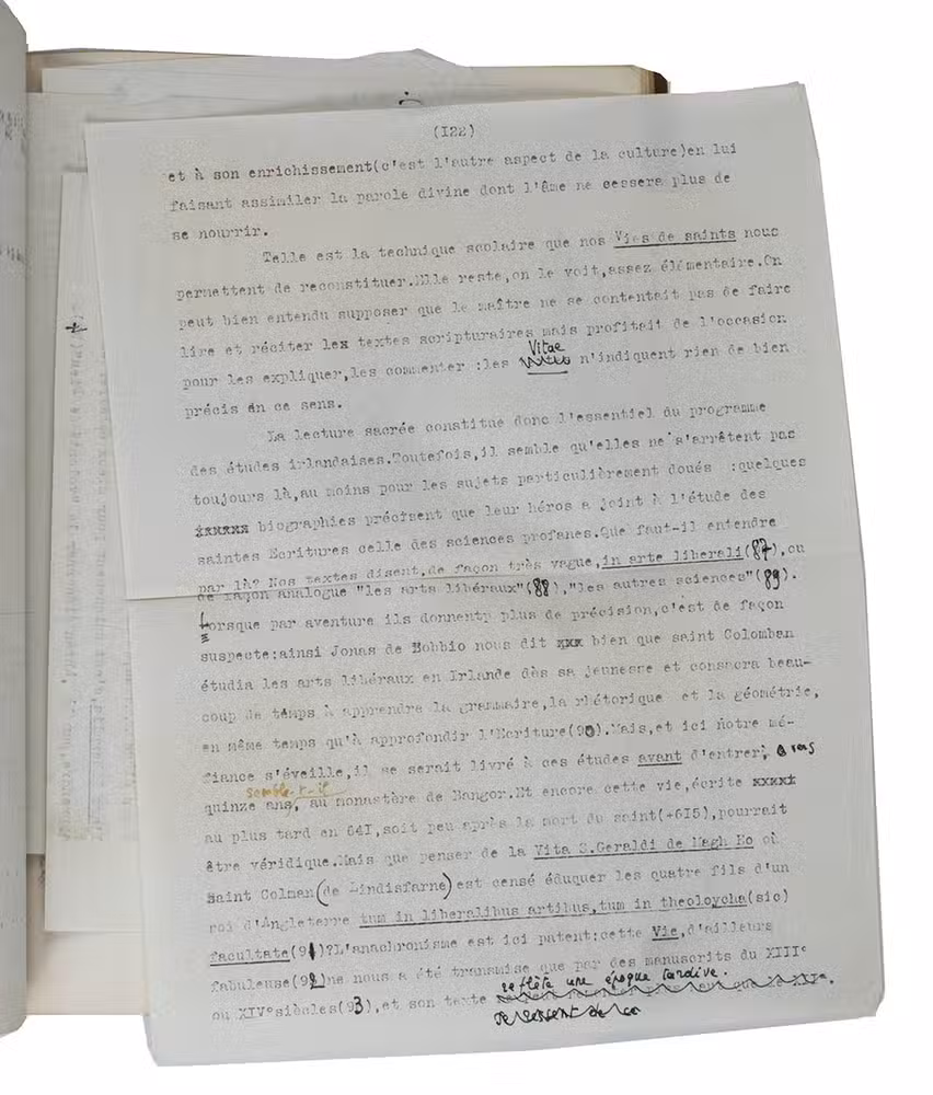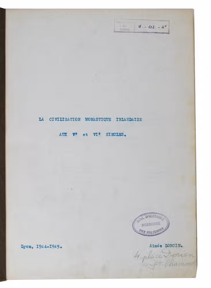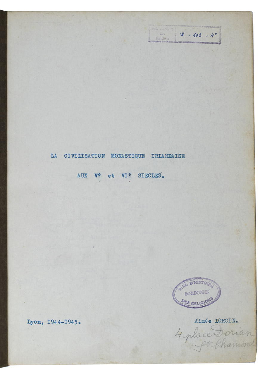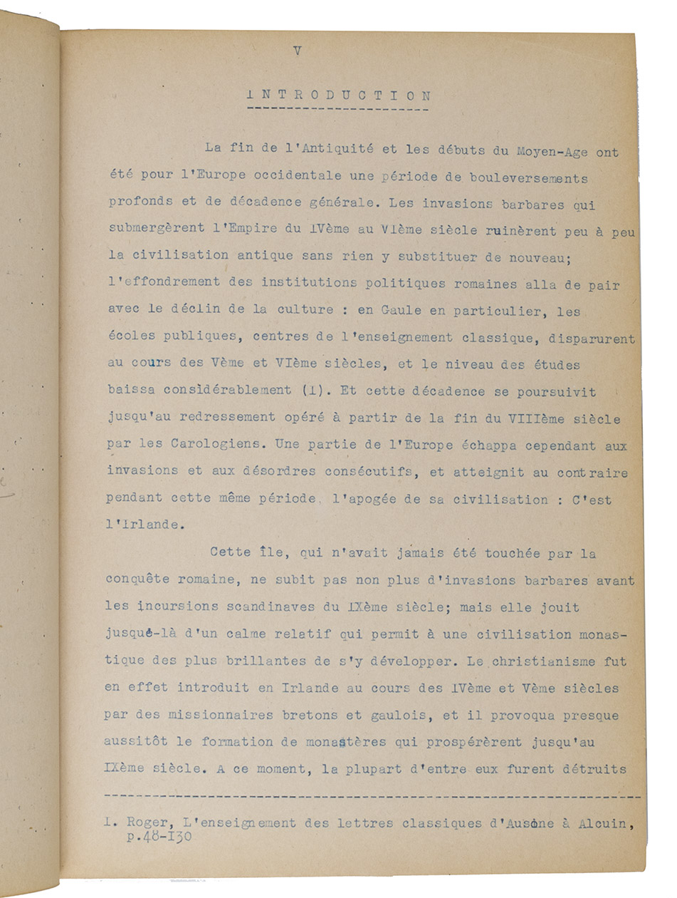 Unpublished thesis by a French female student, on the life, educational system and cultural environment of the Irish monasteries during the 5th and 6th centuries. Chapter [B] III is heavily corrected and the author added 8 additional leaves to amend the text.