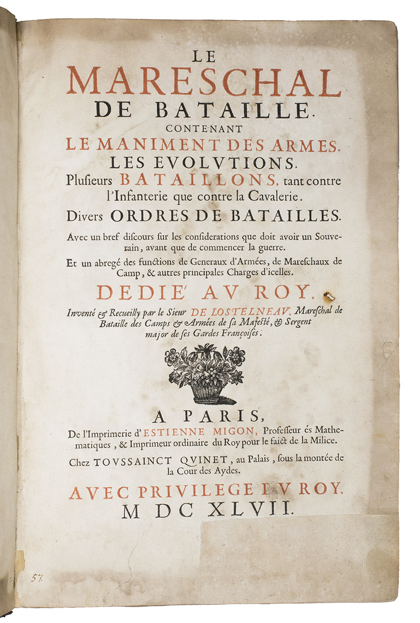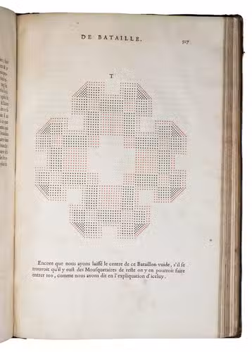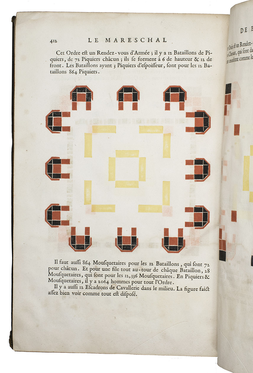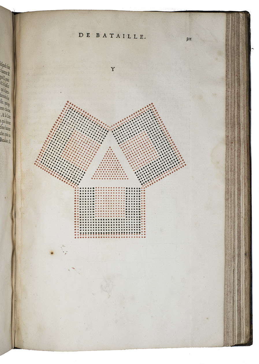 First edition of a practical manual for use of the French army commanders, composed by the French Marshall and Commander of the French Royal Guards by order of Louis XIV, who wanted to establish a strictly uniform military science for his whole army. Jähns curtly mentions the work (rather chauvinisticly) as an imitation of Wallhausen's works, which may be partly true as far as basic military principles are concerned, but for its numerous practical applications, and especially for its rich illustration of 17th century French army tactics, Lostelneau's work stands on its own for its original contributions to the documentation of 17th-century military practice. It is also of special interest as an example of early colour printing in books, with no less than 400 colour printed plates. Intended at the time as a purely practical aid, the arrays of coloured dots in patterns of various symmetries can now also be appreciated as rather modernistic decorative art.