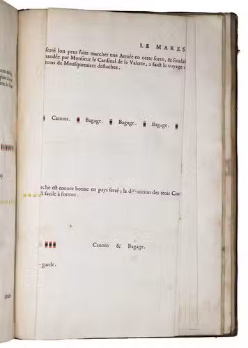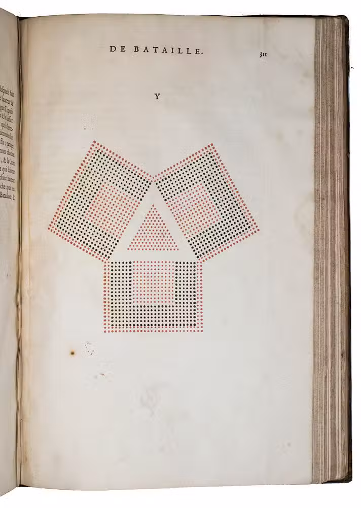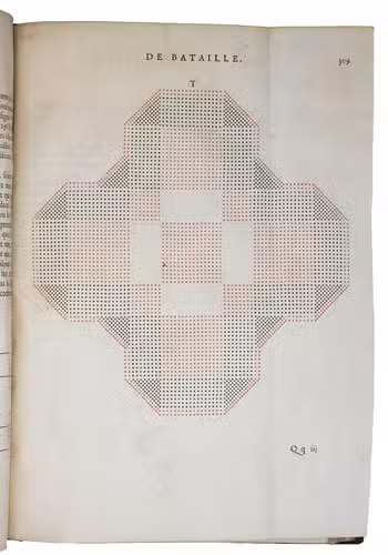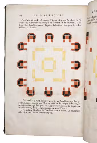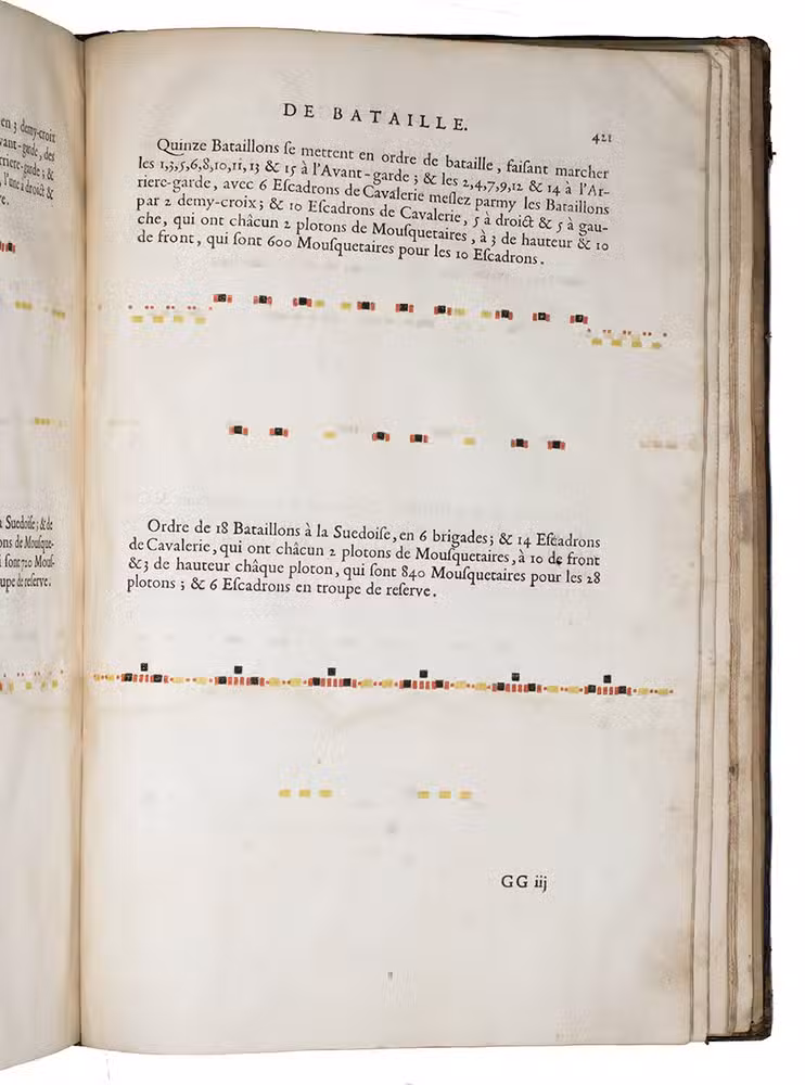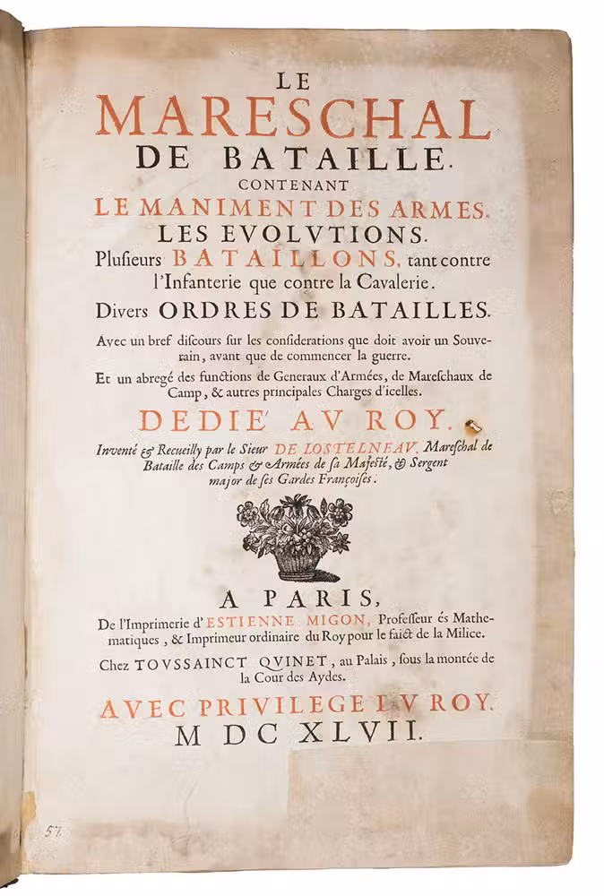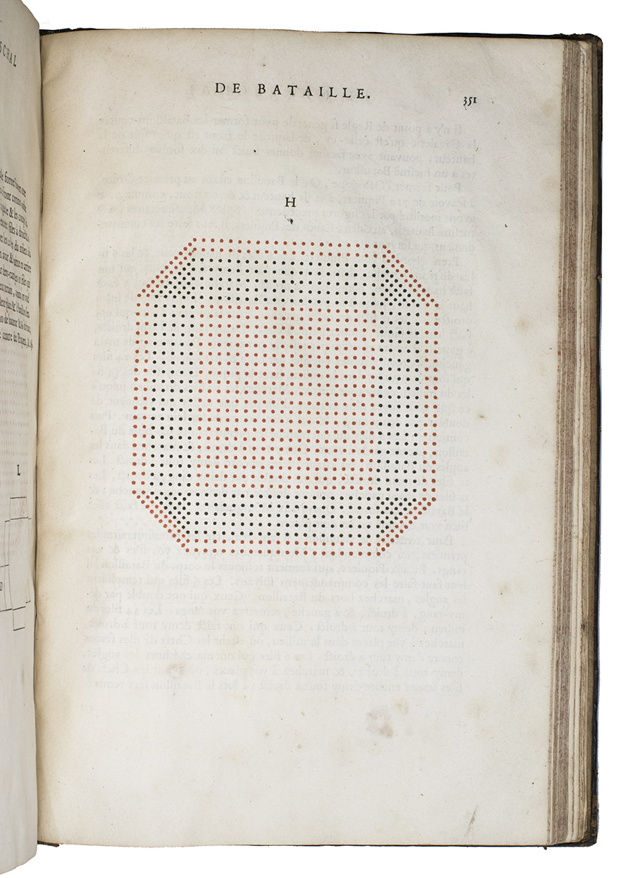 First edition of a practical manual for use of the French army commanders, composed by the French Marshall and Commander of the French Royal Guards by order of Louis XIV, who wanted to establish a strictly uniform military science for his whole army. Jähns curtly mentions the work (rather chauvinisticly) as an imitation of Wallhausen's works, which may be partly true as far as basic military principles are concerned, but for its numerous practical applications, and especially for its rich illustration of 17th century French army tactics, Lostelneau's work stands on its own for its original contributions to the documentation of 17th-century military practice. It is also of special interest as an example of early colour printing in books, with no less than 400 colour printed plates. Intended at the time as a purely practical aid, the arrays of coloured dots in patterns of various symmetries can now also be appreciated as rather modernistic decorative art.