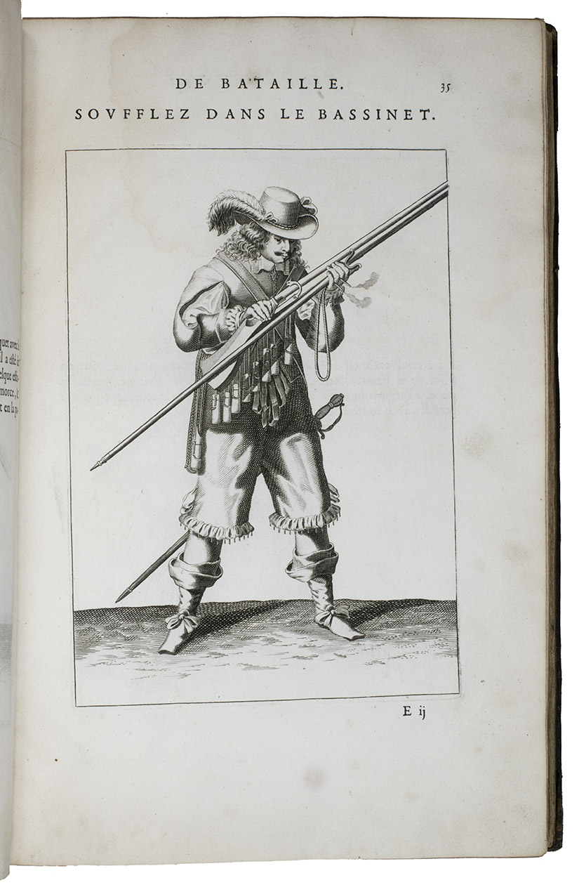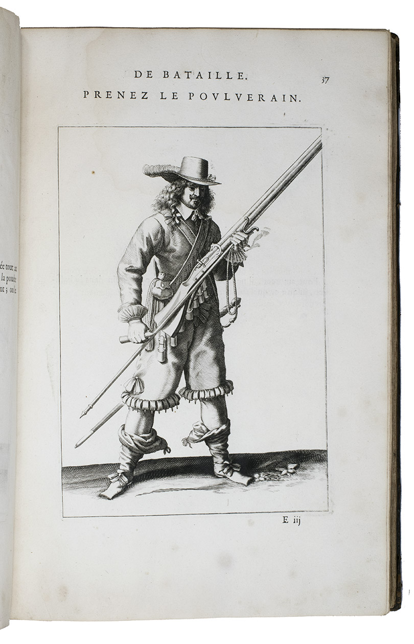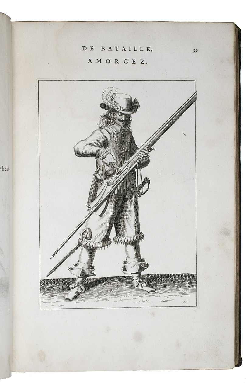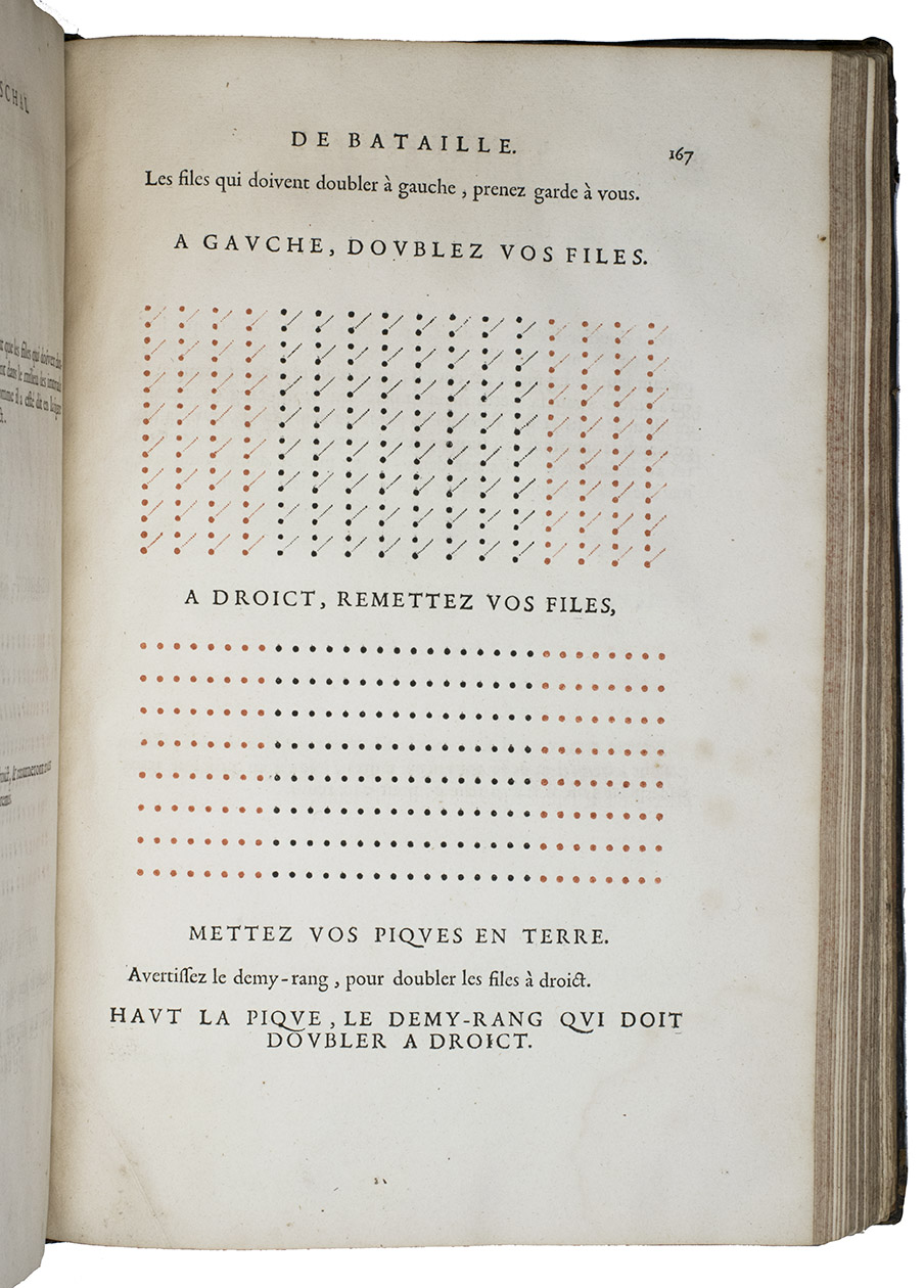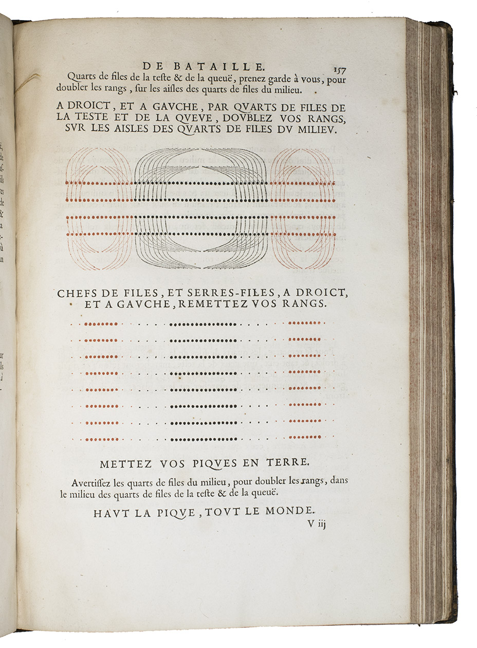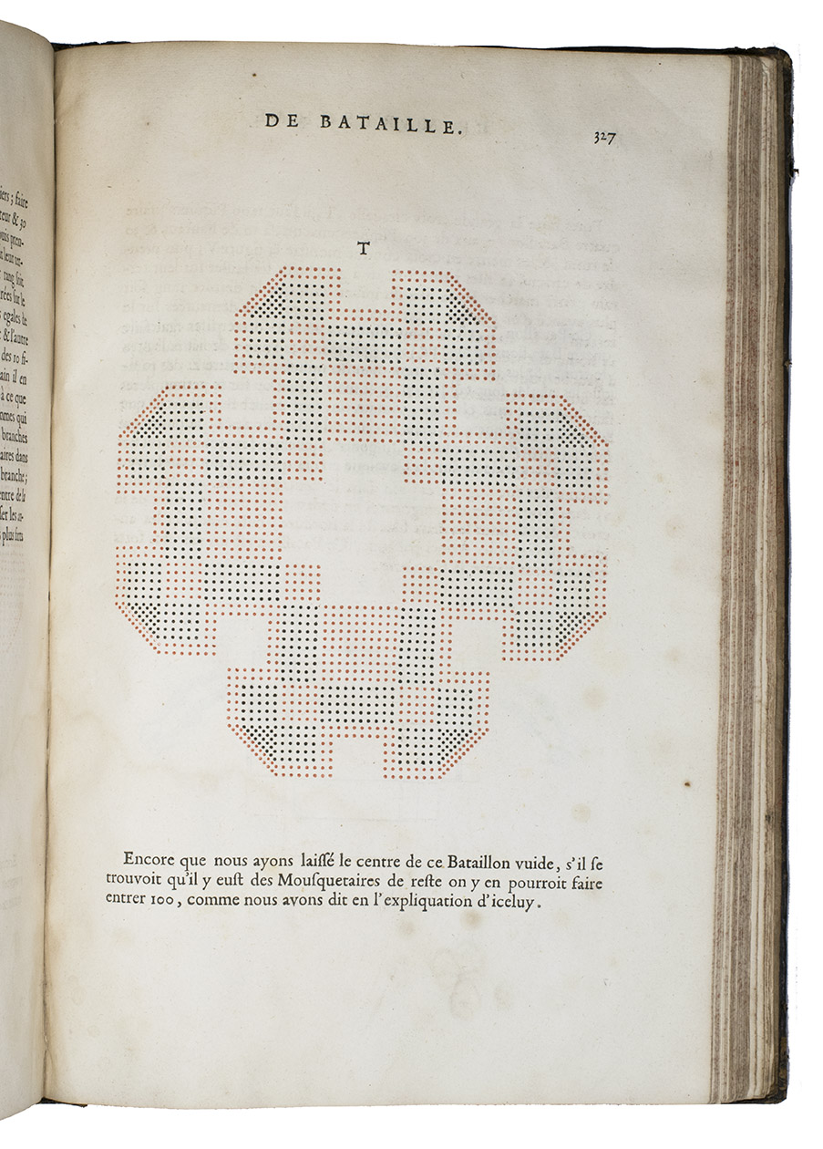 Paris, Toussainct Quinet (printed by Estienne Migon), 1647. Folio. With 48 full-page engraved plates of French infantry-men exercising with musket (35) and pike (13), after the models of Jacques de Gheyn, 400 full-page (or larger folding) woodcut diagrams of battle formations, all printed in red and black, some also in yellow, with troops represented by red and black dots and a few smaller woodcut illustrations. Dark brown gold-tooled calf (ca. 1700?). XII, 459 pp.