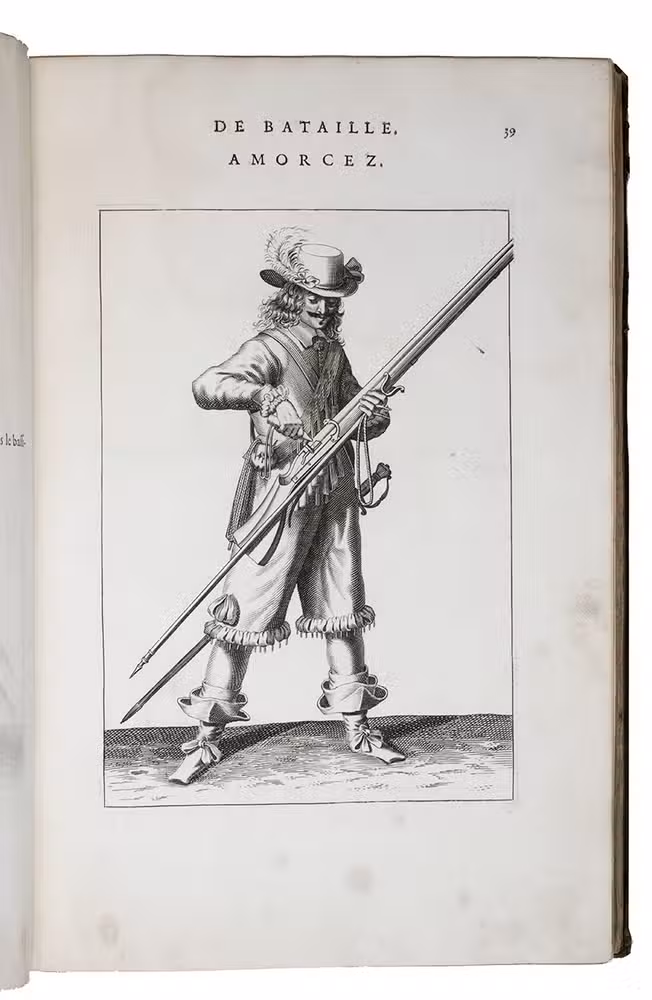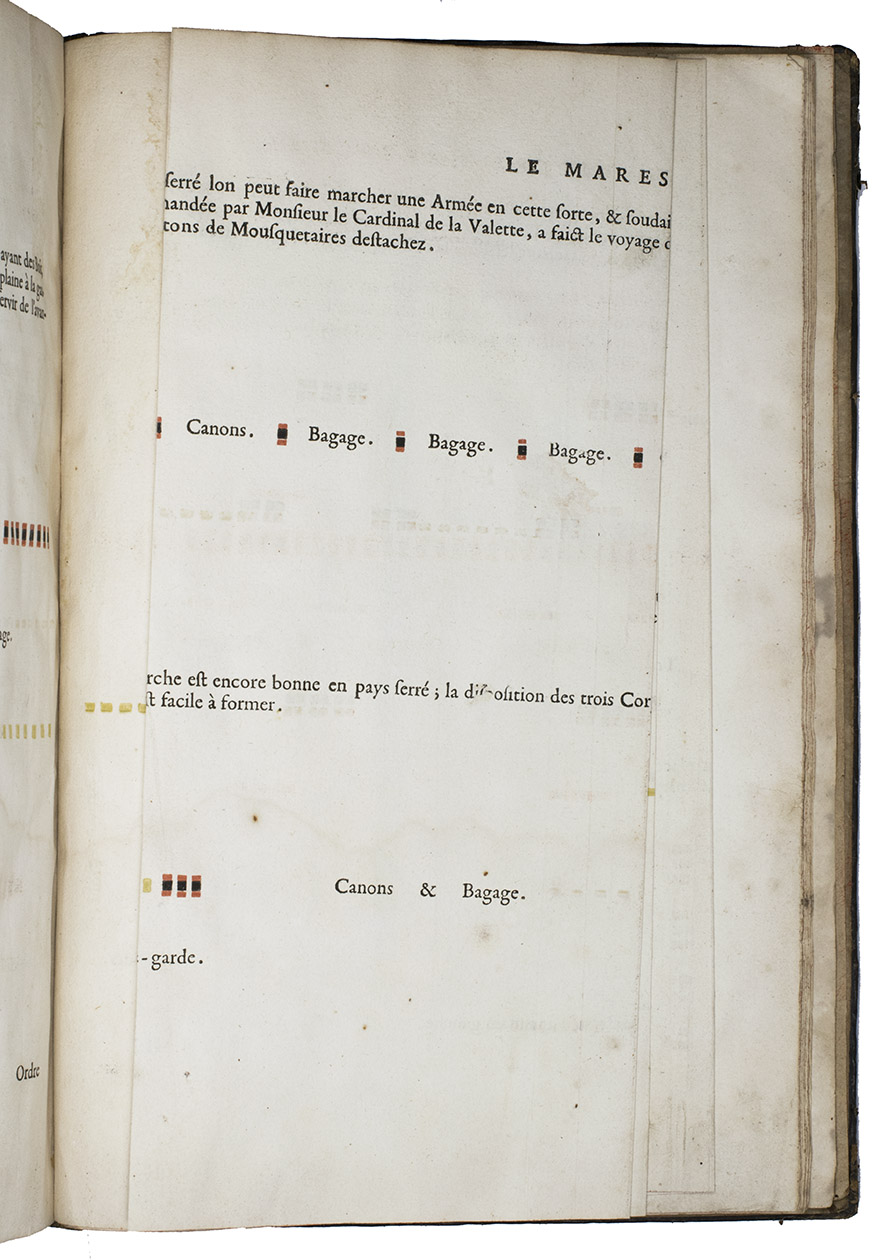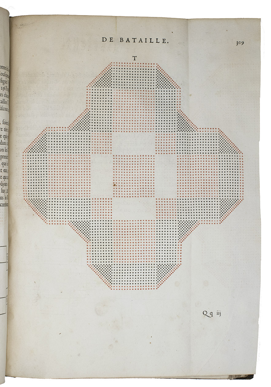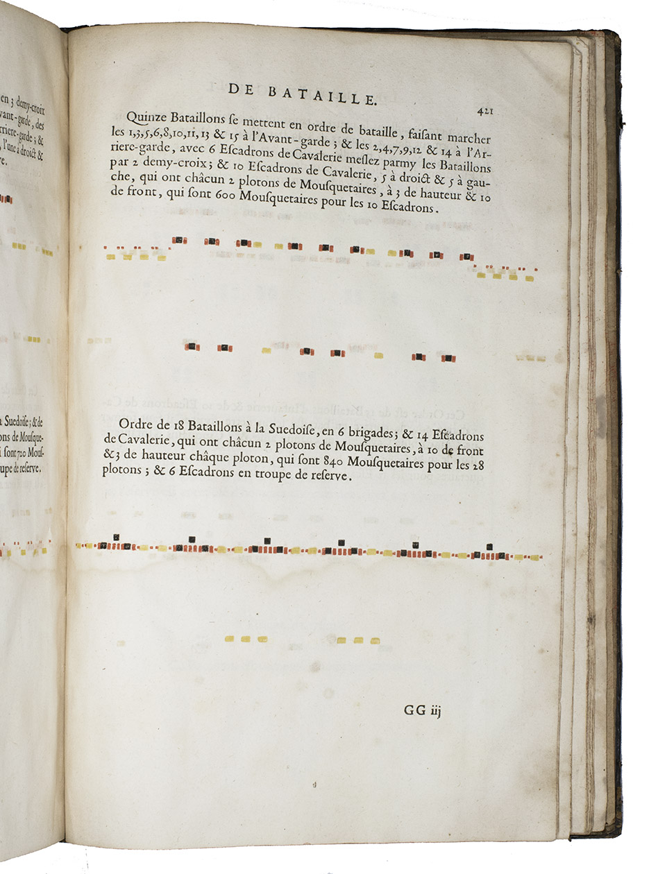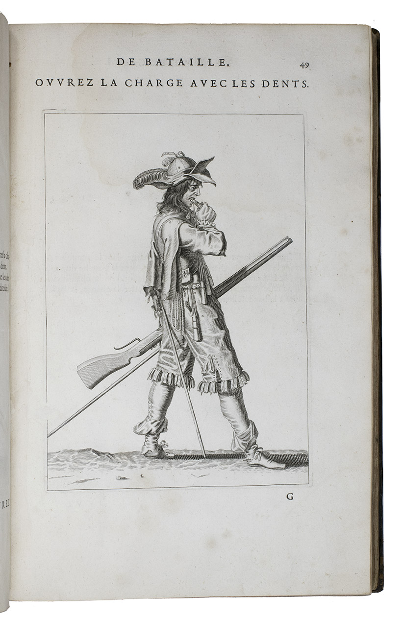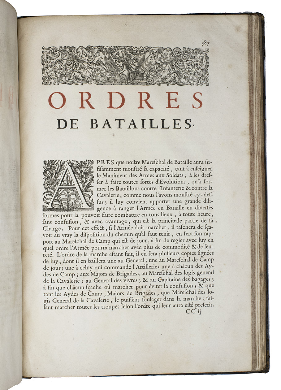 Paris, Toussainct Quinet (printed by Estienne Migon), 1647. Folio. With 48 full-page engraved plates of French infantry-men exercising with musket (35) and pike (13), after the models of Jacques de Gheyn, 400 full-page (or larger folding) woodcut diagrams of battle formations, all printed in red and black, some also in yellow, with troops represented by red and black dots and a few smaller woodcut illustrations. Dark brown gold-tooled calf (ca. 1700?). XII, 459 pp.