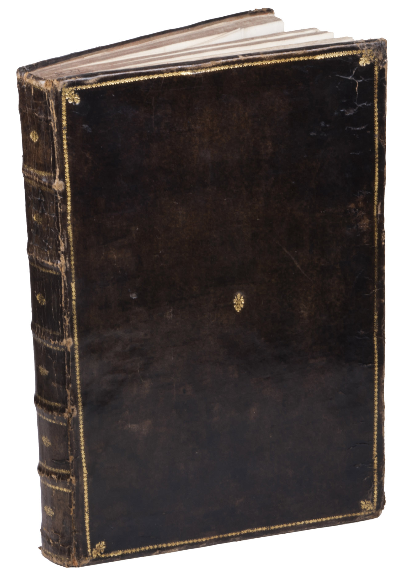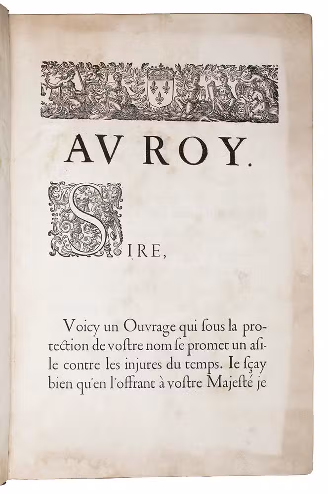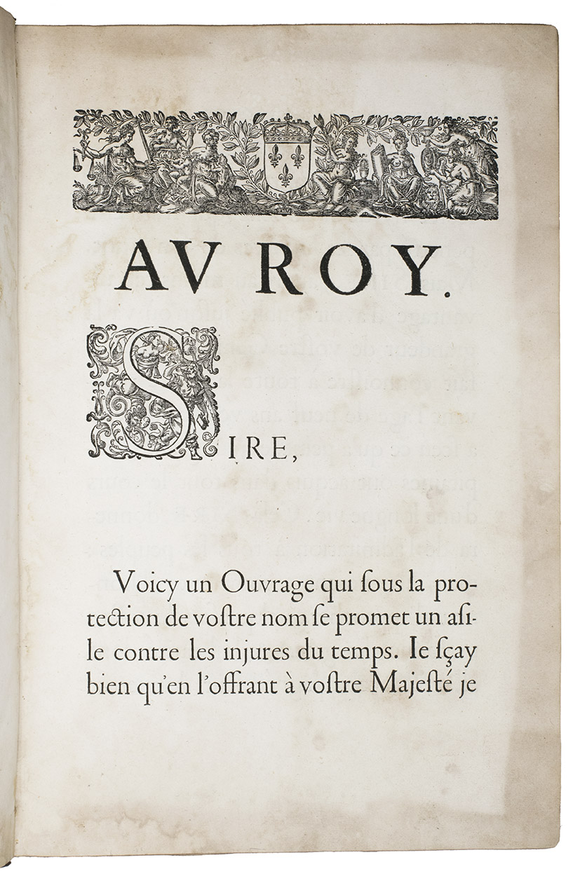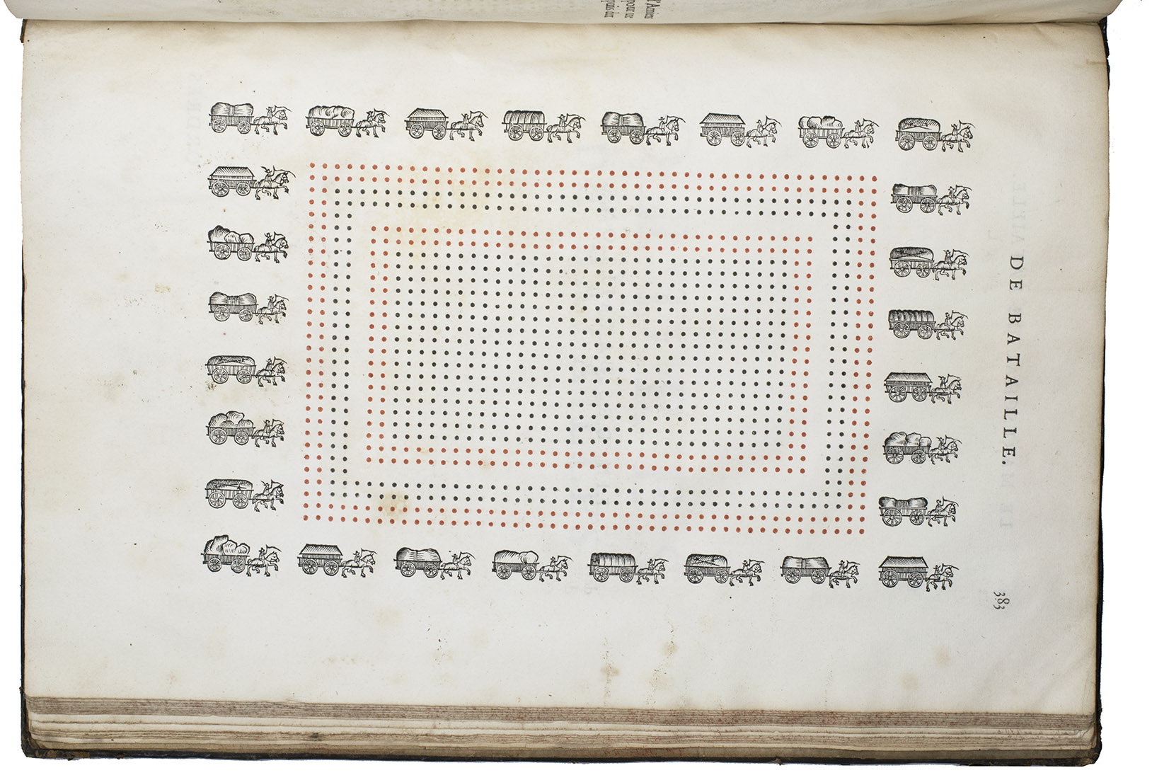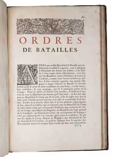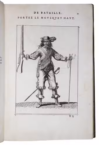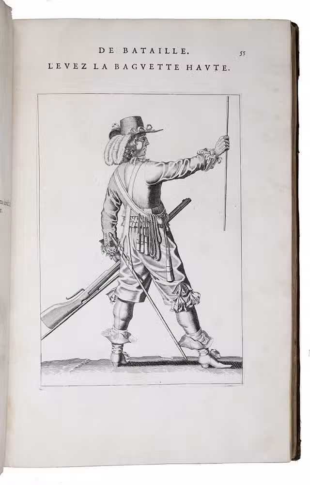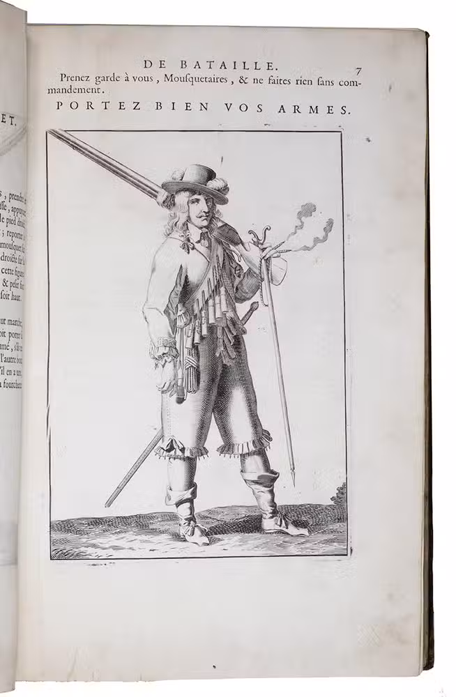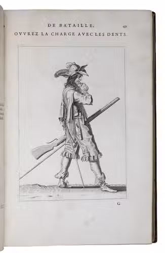 Paris, Toussainct Quinet (printed by Estienne Migon), 1647. Folio. With 48 full-page engraved plates of French infantry-men exercising with musket (35) and pike (13), after the models of Jacques de Gheyn, 400 full-page (or larger folding) woodcut diagrams of battle formations, all printed in red and black, some also in yellow, with troops represented by red and black dots and a few smaller woodcut illustrations. Dark brown gold-tooled calf (ca. 1700?). XII, 459 pp.
