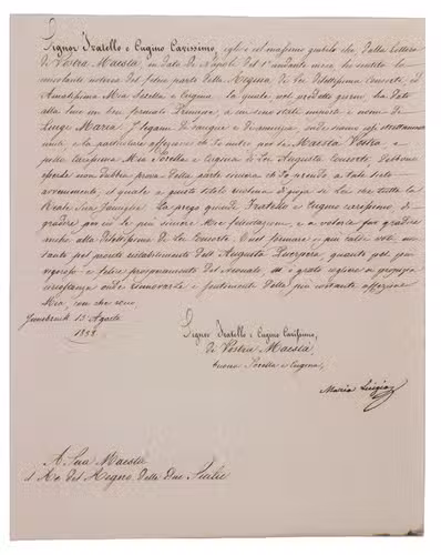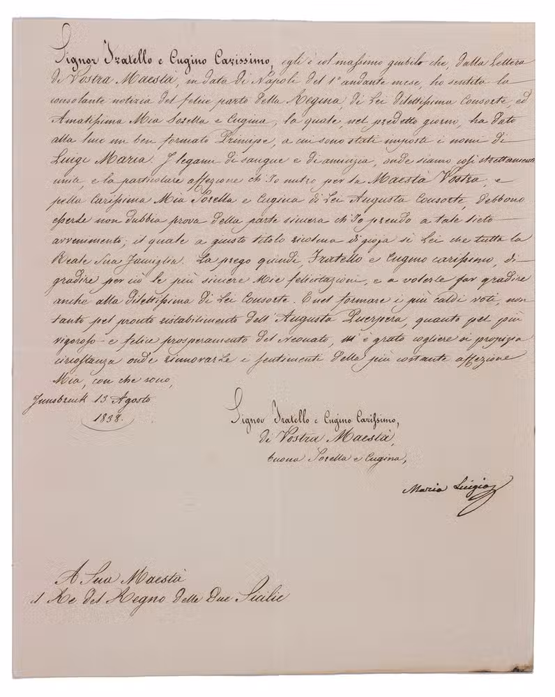 Letter addressed to Ferdinand II, King of Two Sicilies (1810-1859) signed by Maria Luigios, with congratulations on the birth of his eldest son with Archduchess Maria Theresa of Austria (1816-1867), Luigi Maria of Bourbon-Two Sicilies (1838-1886) who was born on the 1st of August. The letter is signed by Maria Luigios, who was in all likelihood Maria Karoline Luise Christine of Austria (1825-1915), a sister of Maria Theresa.