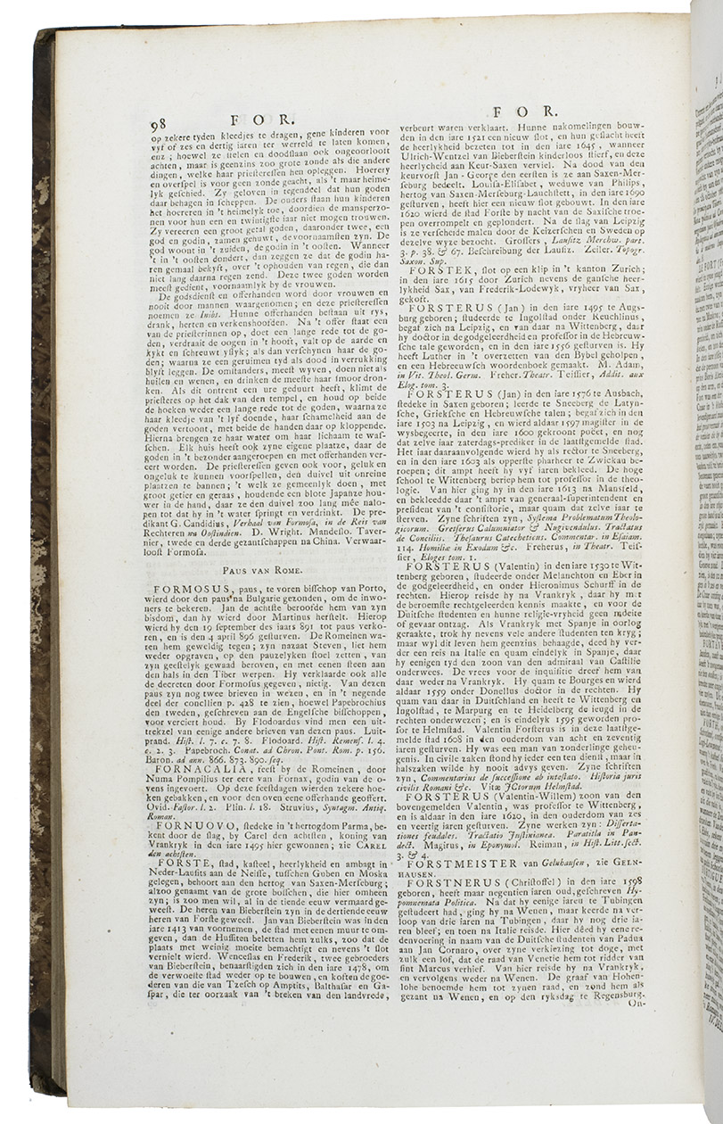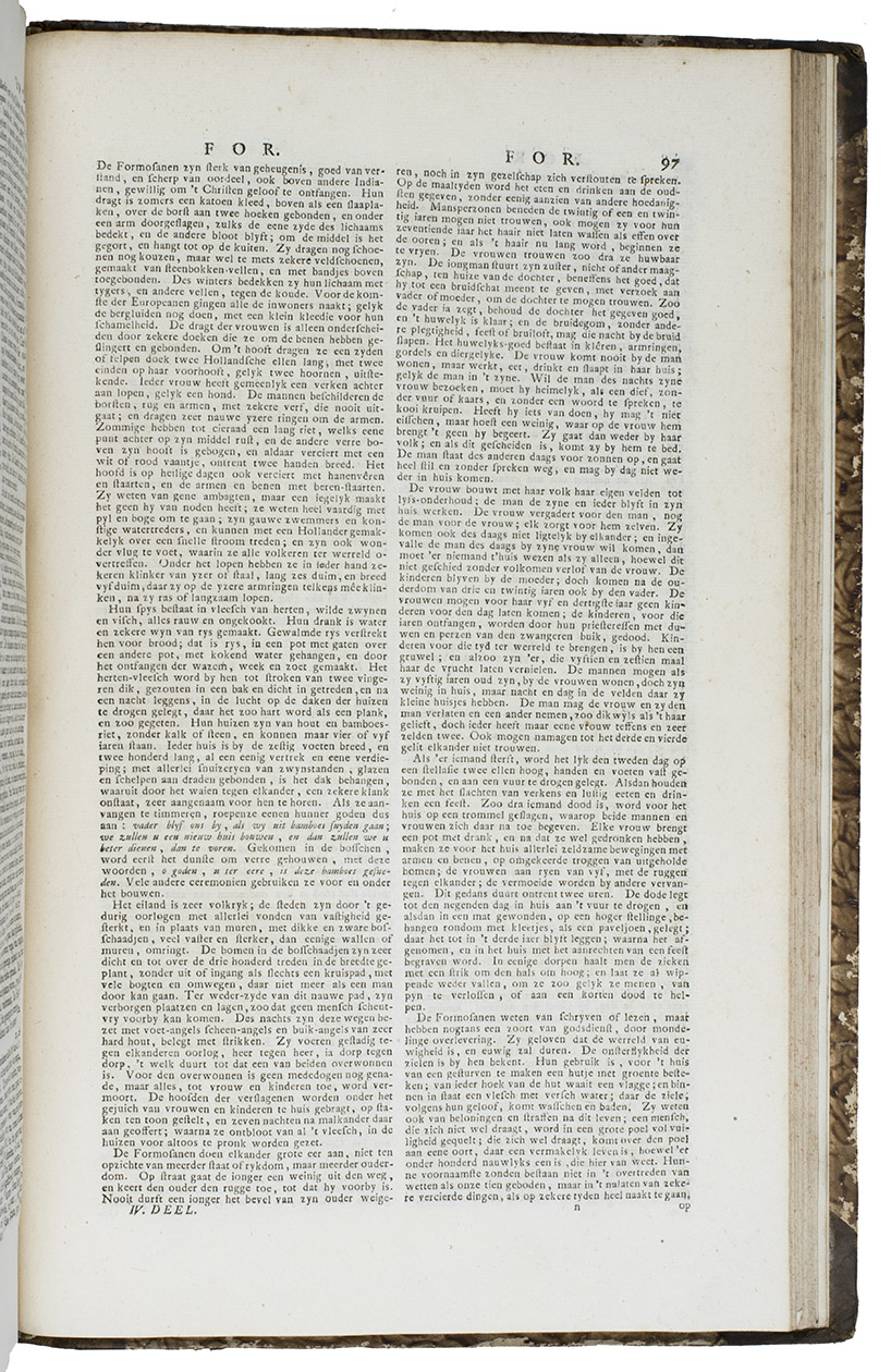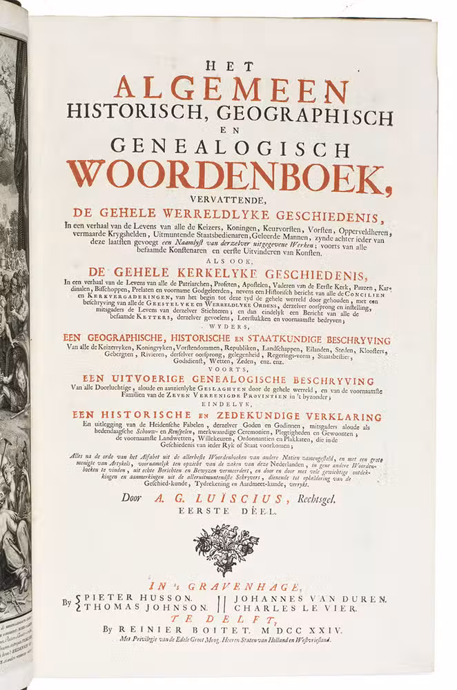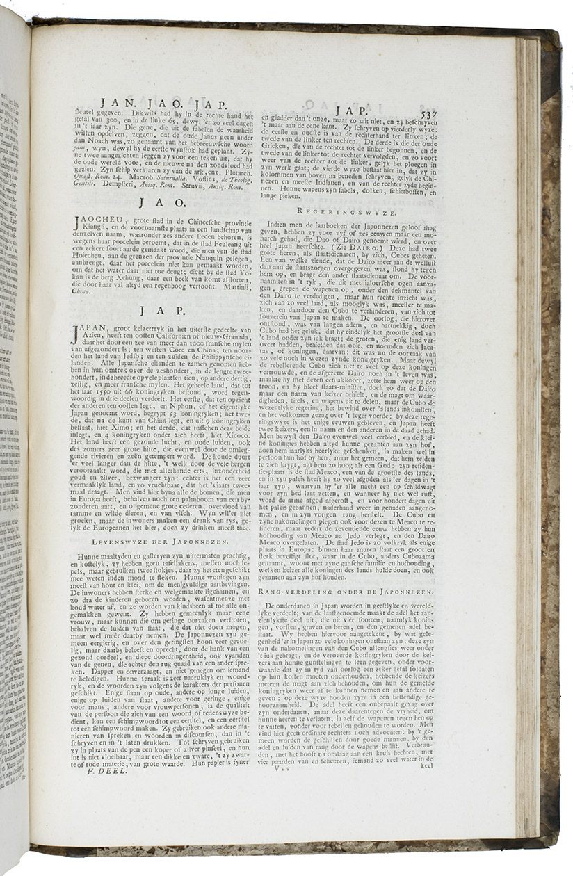 Complete first edition in 8 uniform volumes of Abraham George Luiscius's great encyclopedia in the original Dutch. It contains "the entire ecclesiastical and secular history" along with a "geographical, historical, political and genealogical description" of the world. The contents are arranged alphabetically. It included articles on the Dutch East and West India Companies (VOC and WIC), the city of Florence and the philosopher Socrates. The 8 volumes are full of information on Japan, for example all the provinces have separate entries and descriptions, and the general part about Japan (vol. V) covers the history, climate, way of life, social hierarchy, government, religion and more.