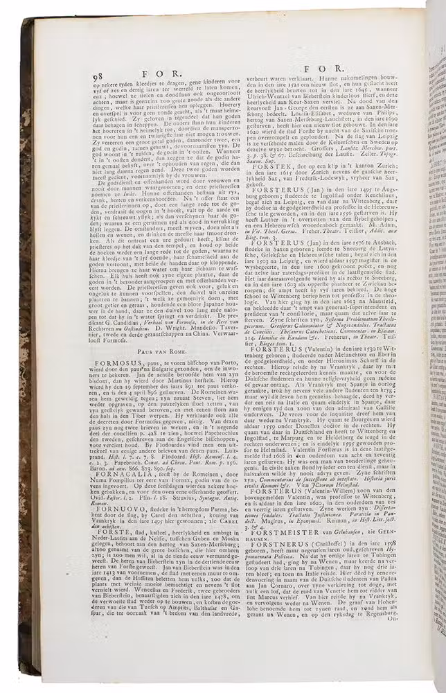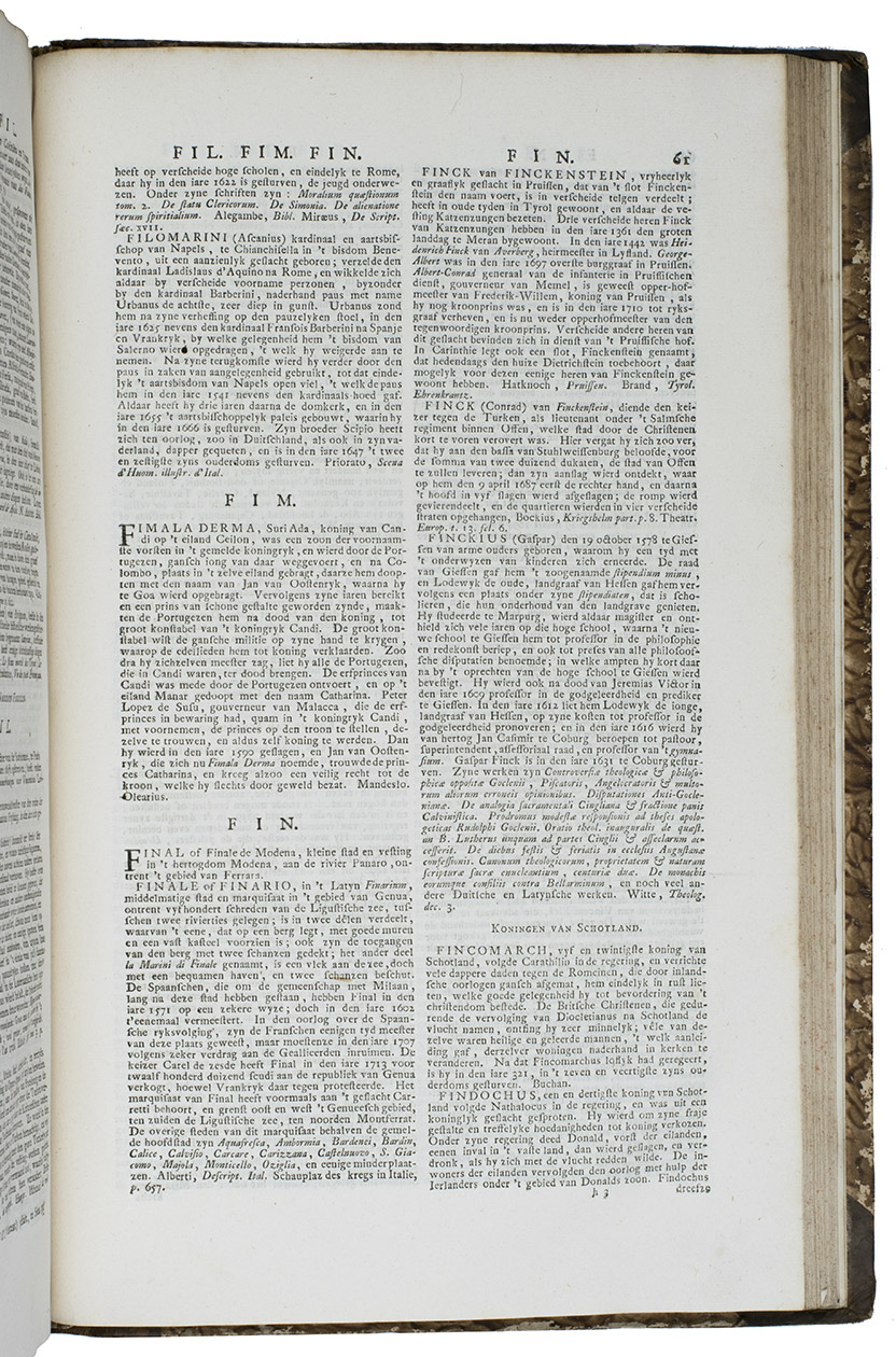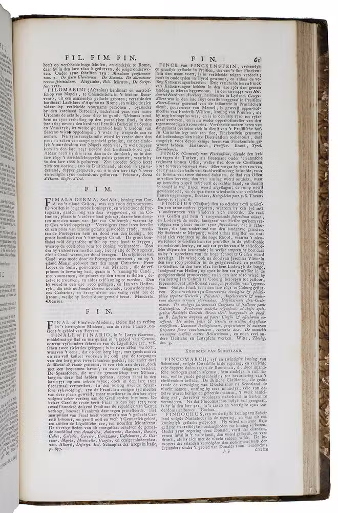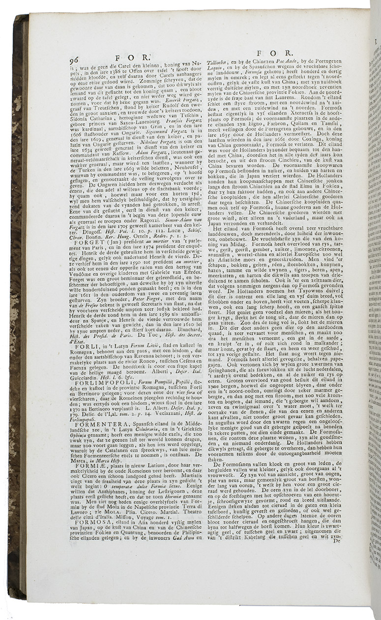 Complete first edition in 8 uniform volumes of Abraham George Luiscius's great encyclopedia in the original Dutch. It contains "the entire ecclesiastical and secular history" along with a "geographical, historical, political and genealogical description" of the world. The contents are arranged alphabetically. It included articles on the Dutch East and West India Companies (VOC and WIC), the city of Florence and the philosopher Socrates. The 8 volumes are full of information on Japan, for example all the provinces have separate entries and descriptions, and the general part about Japan (vol. V) covers the history, climate, way of life, social hierarchy, government, religion and more.