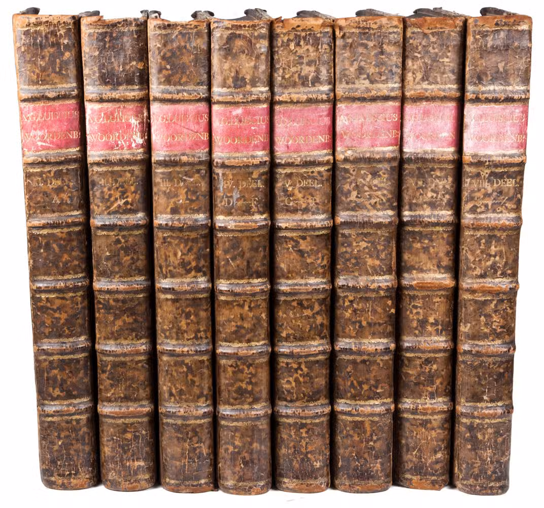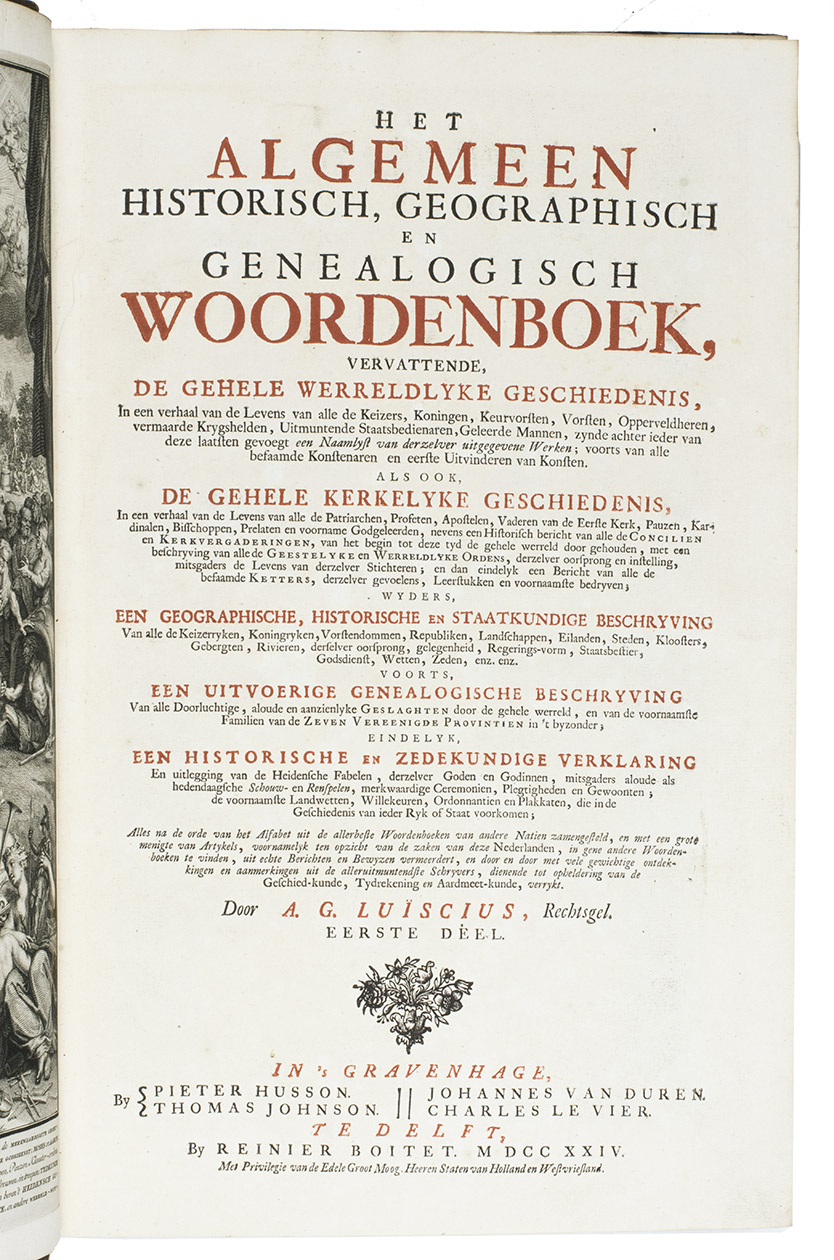The Hague, Pieter Husson, Thomas Johnson, Johannes van Duren, Charles le Vier; Delft, Reinier Boitett, 1724-1737. 8 volumes. Large folio (41.5 x 27.5 cm). Vol. 1 with an impressive engraved frontispiece by Bernard Picart and an engraved armorial dedication to Isack van Hoornbeek. Each volume except the first has an engraving at the head of the first page depicting a library with visitors in it. Contemporary and uniform mottled half calf, marbled sides, gold-tooled spine with red label. [14], 574; 440, 192; 428, 146; 234, 190; 600; 578; 556; 572 pp.
