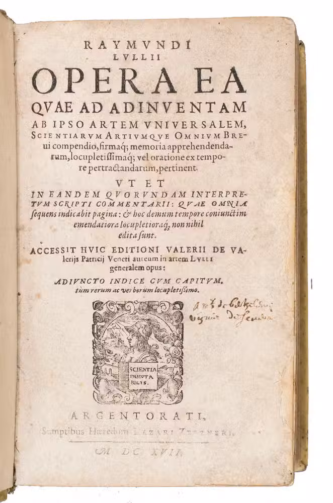 Scarce edition of the first Latin compilation of the works of Ramon Lull (ca. 1232-1315), together with the most important commentaries on his ideas. This compilation was almost solely responsible for the spread of Lullism in the Early Modern period, and it directly influenced significant thinkers such as Gottfried Wilhelm Leibniz (1646-1716), who was known to own a copy. The present edition rarely appears on the market.