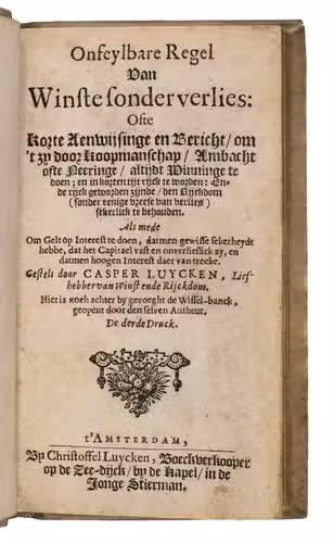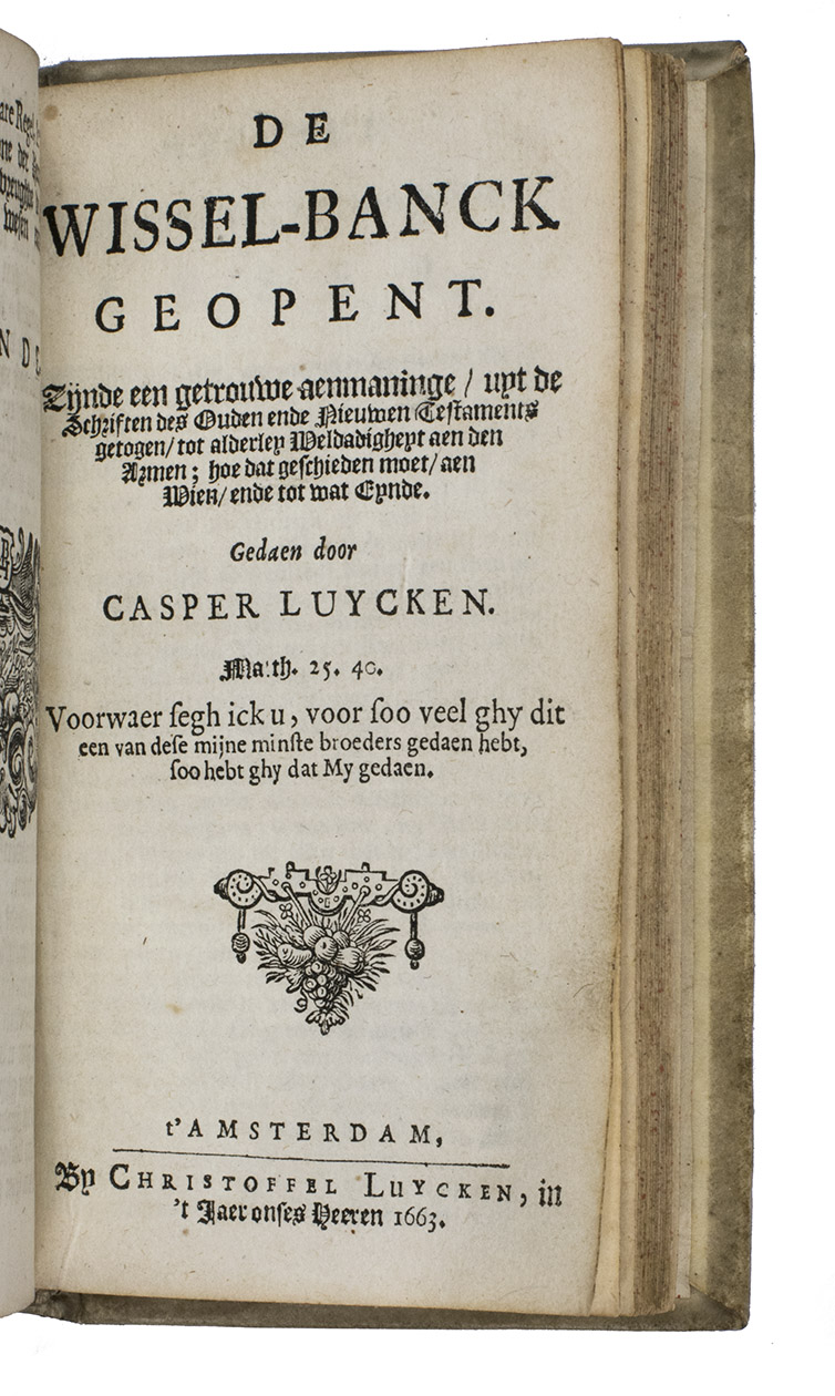 The true third edition may have been unauthorized, published by Dominicus Jansz. de Gaver at Haarlem in 1656, without naming the printer and copying the second editions spelling of the authors name "Luken". The present 1663 edition, published by the authors eldest son (Jans older brother) also calls itself the third, suggesting they did not wish to acknowledge the 1656 edition. All early editions are extremely rare, the STCN recording only 2 copies of the second and only 1 copy each of the first, third and the present fourth.Fine copy. STCN (1 copy); Van Eeghen & Van der Kellen I, pp. XII-XIII note; cf. Klaversma & Hannema 901 (1656 ed.) & 902 (1685 ed., noting that the foreword of De Wissel-banck geopent is dated 1663); not in Hoock & Jeannin; Kress.