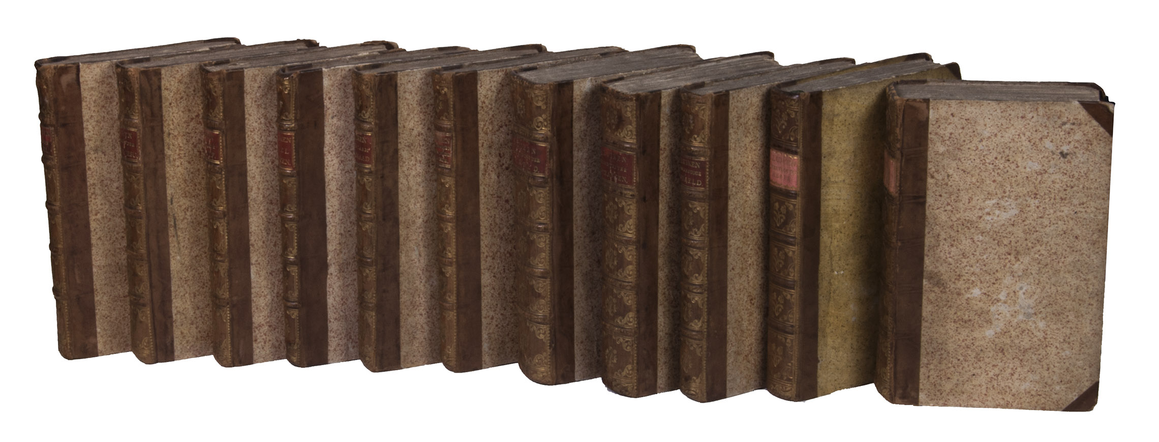 Amsterdam, widow of P. Arentz, and Kornelis vander Sys, 1708 - 1718 (10 vols.); Haarlem, C.H. Bohn, 1767 (1 vol.). 11 volumes. 8vo. Contemporary uniform half calf, richly gold-tooled spines (10 vols.), the 1767 in slightly different half calf, apparently made to match the earlier ones.