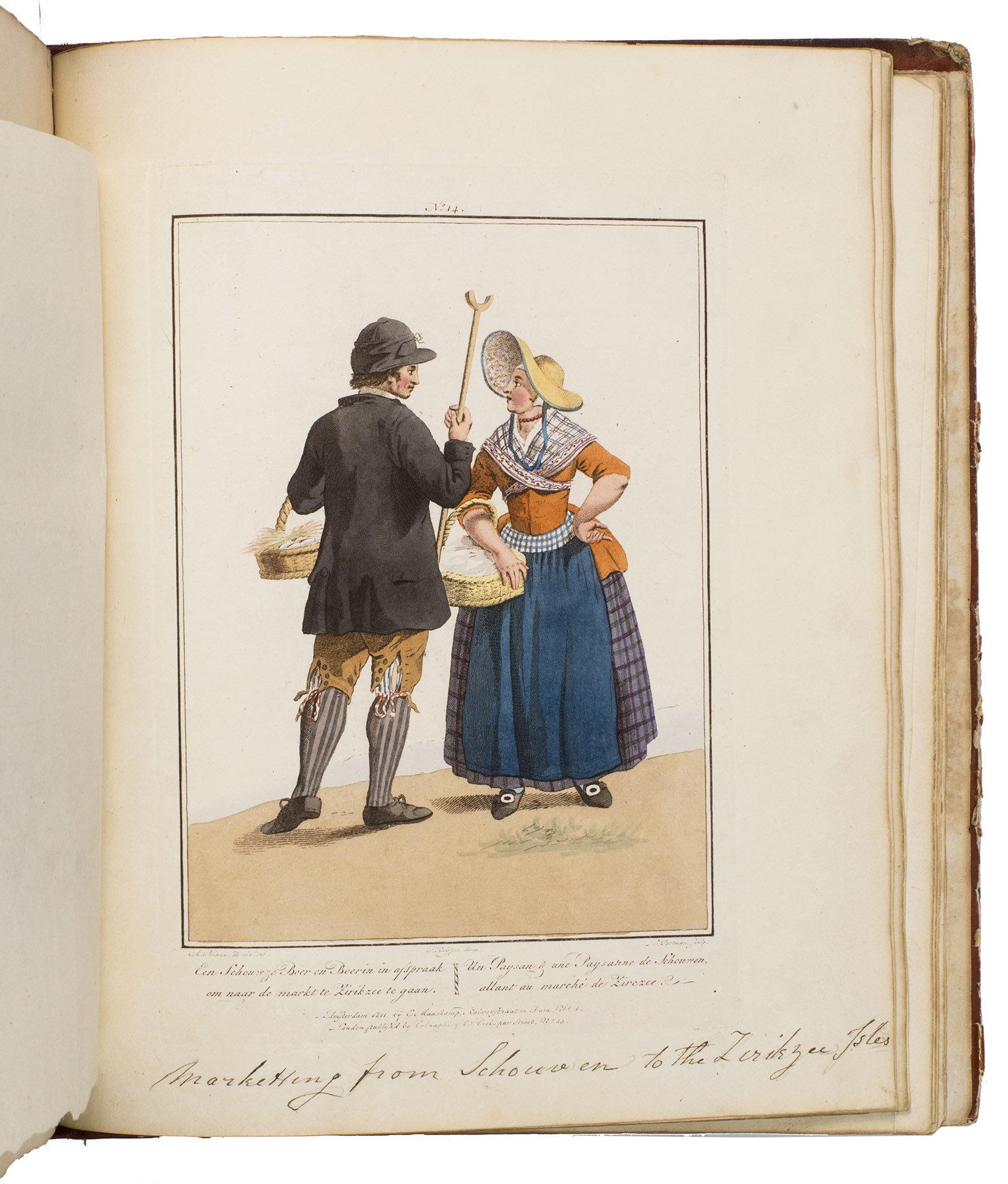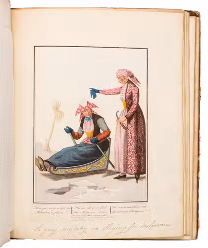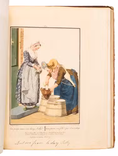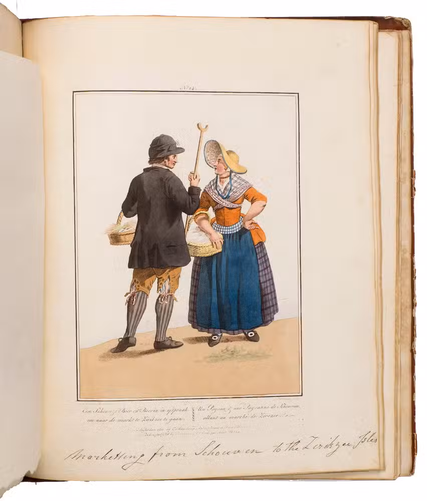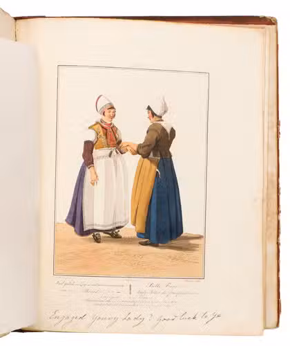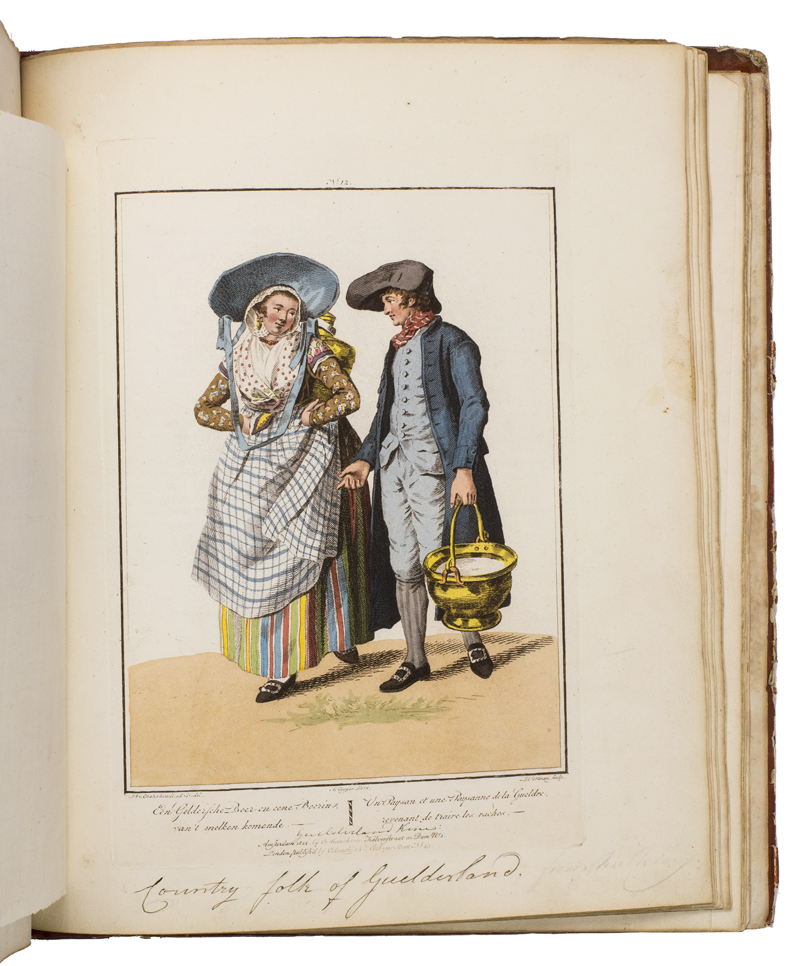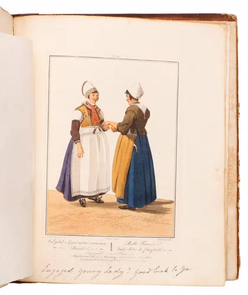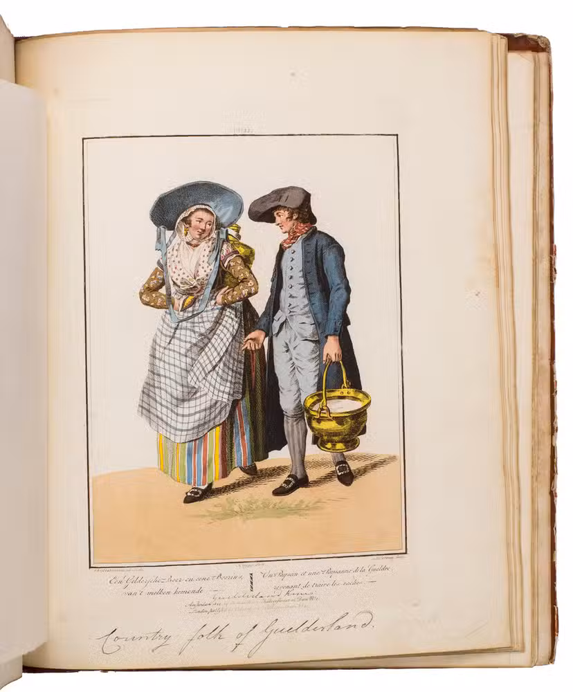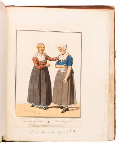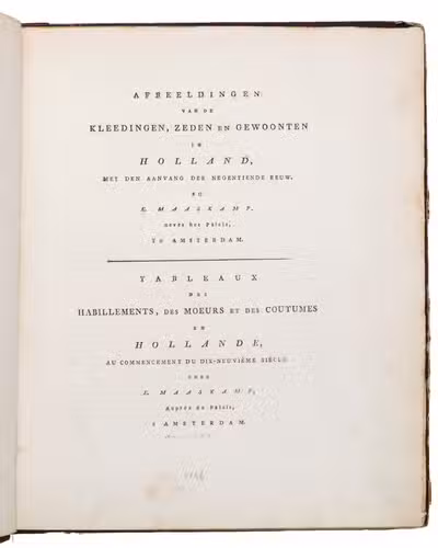 Second edition in the original Dutch and French, printed from the plates of the first edition, of the famous first Dutch costume book to cover the different costumes of the various provinces, edited by the well-known publisher Evert Maaskamp (1769-1834) in Amsterdam. The illustrations are much more than just costume plates, for they show people (mostly peasants, but also city dwellers, clergymen, soldiers and others) engaged in a wide variety of activities (selling goods, going to church, courting, etc.), though always in their best clothes. The costumes include those of the Moravian brethren. Each plate has an engraved caption in French and Dutch with a detailed explanation on separate letterpress leaves in Dutch and French. The extensive texts accompanying the plates describe the costumes and people in their cultural, historical, moral and social context. The introduction notes that the costume plates were drawn from life under the direction of Jacques Kuyper (1761-1808), engraved by Lodewijk Gottlieb Portman (1772-post 1828) and coloured by the now famous Dutch painter Jan Willem Pieneman (1779-1853).