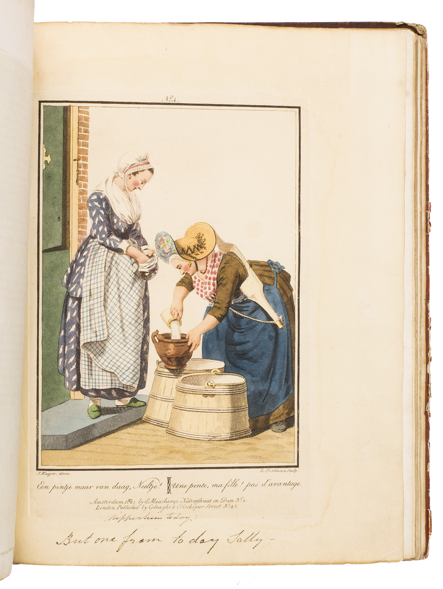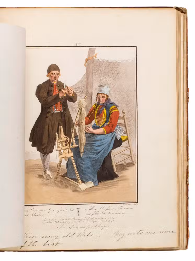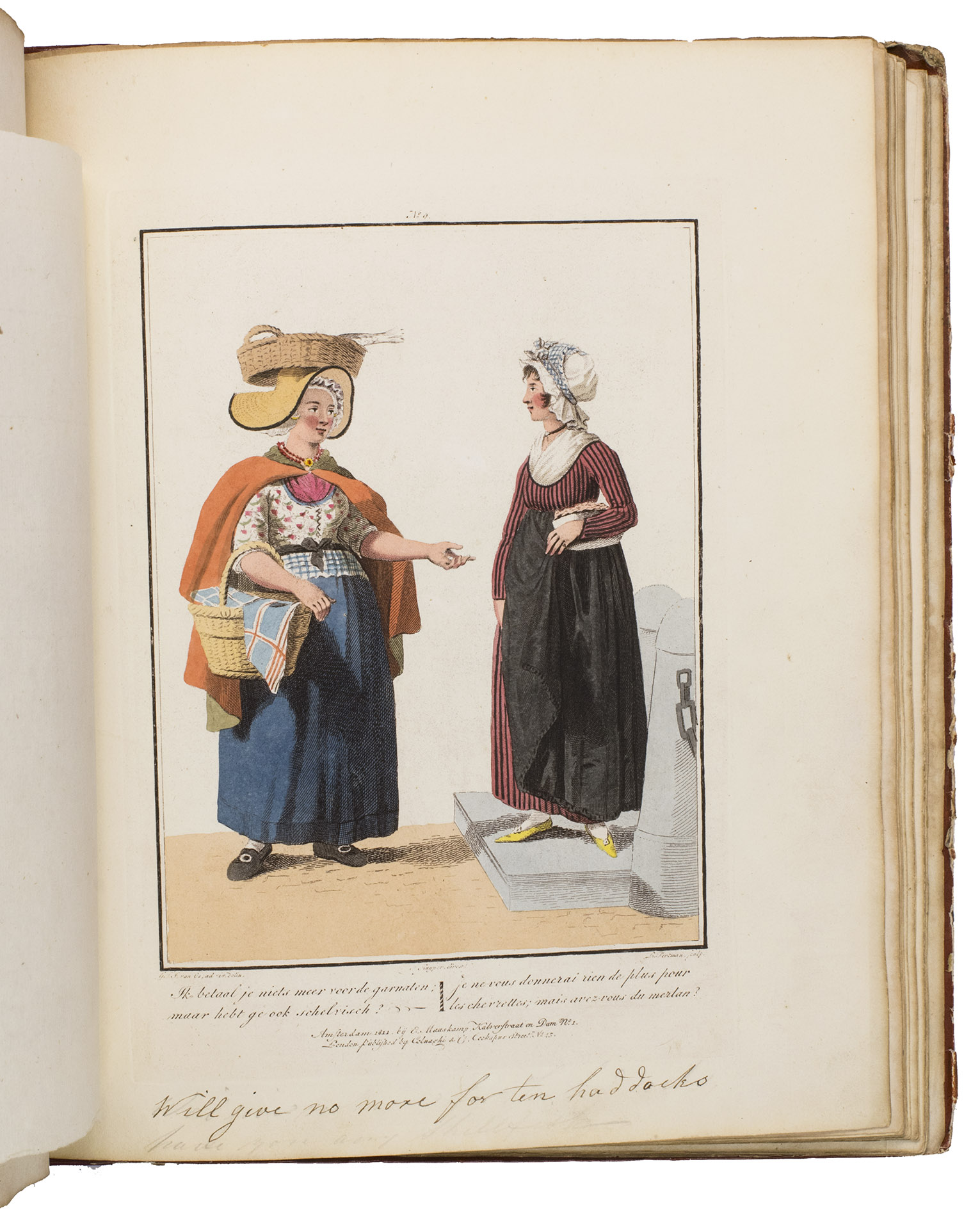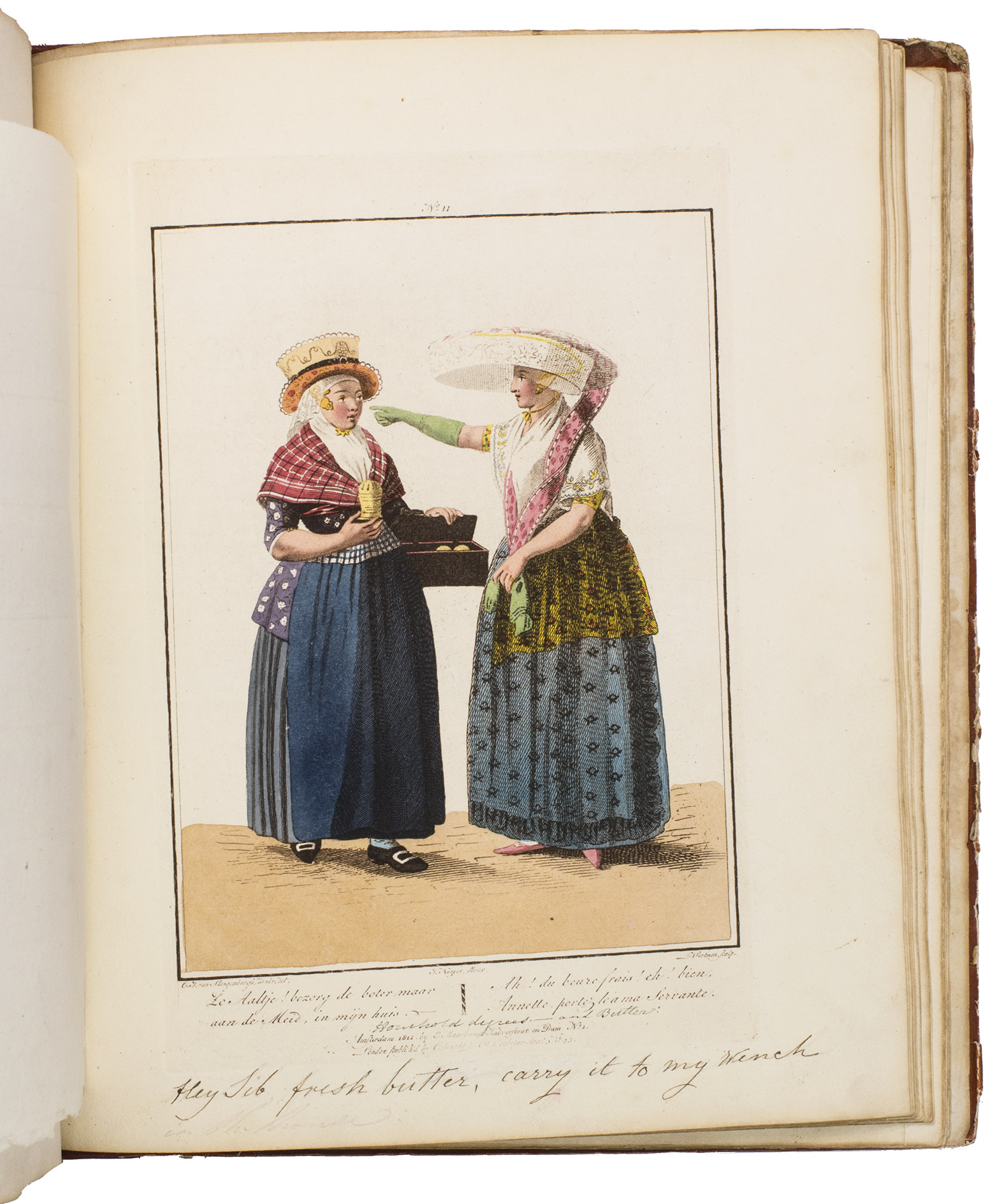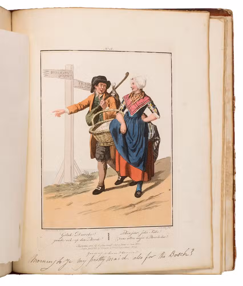 Second edition in the original Dutch and French, printed from the plates of the first edition, of the famous first Dutch costume book to cover the different costumes of the various provinces, edited by the well-known publisher Evert Maaskamp (1769-1834) in Amsterdam. The illustrations are much more than just costume plates, for they show people (mostly peasants, but also city dwellers, clergymen, soldiers and others) engaged in a wide variety of activities (selling goods, going to church, courting, etc.), though always in their best clothes. The costumes include those of the Moravian brethren. Each plate has an engraved caption in French and Dutch with a detailed explanation on separate letterpress leaves in Dutch and French. The extensive texts accompanying the plates describe the costumes and people in their cultural, historical, moral and social context. The introduction notes that the costume plates were drawn from life under the direction of Jacques Kuyper (1761-1808), engraved by Lodewijk Gottlieb Portman (1772-post 1828) and coloured by the now famous Dutch painter Jan Willem Pieneman (1779-1853).