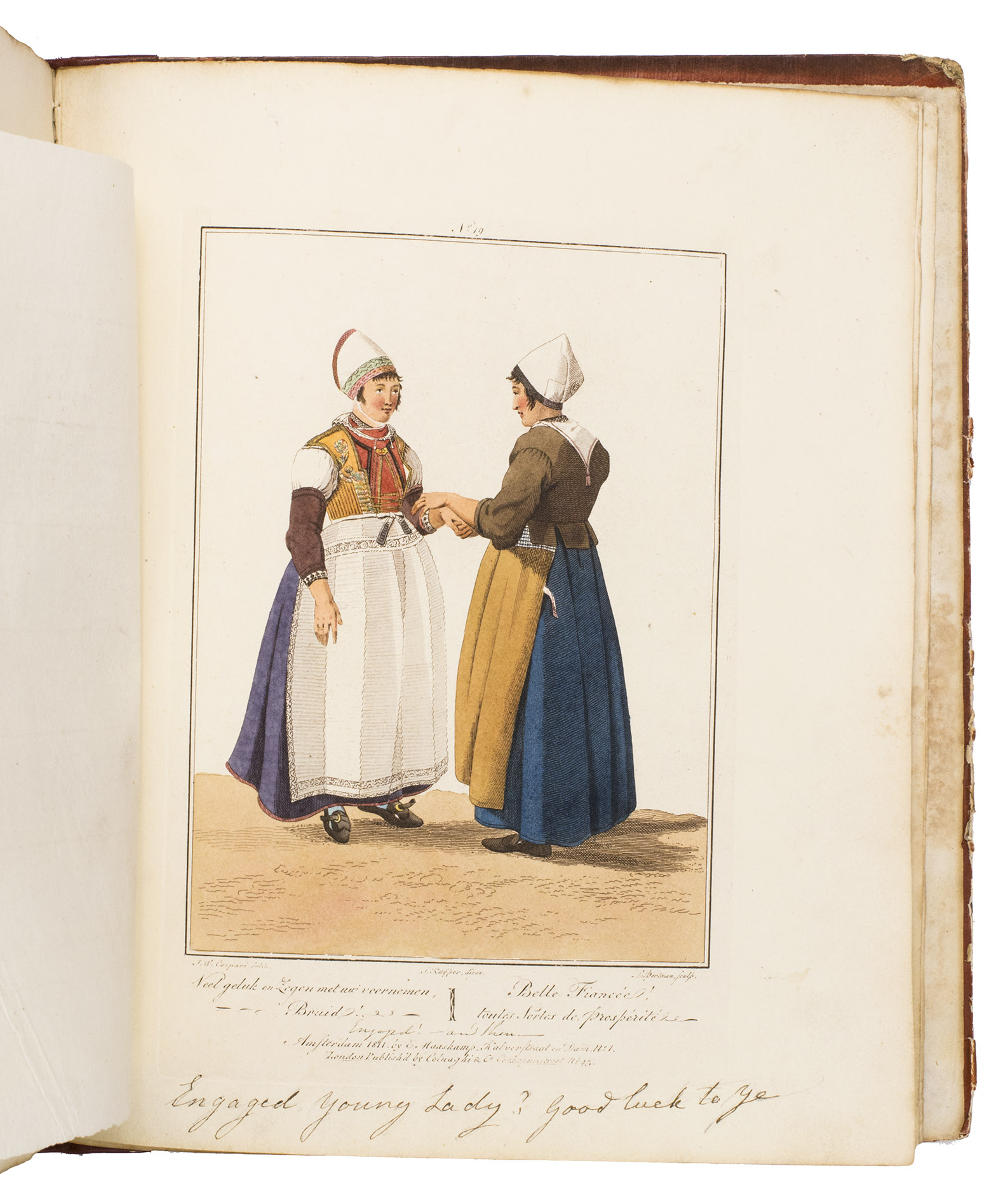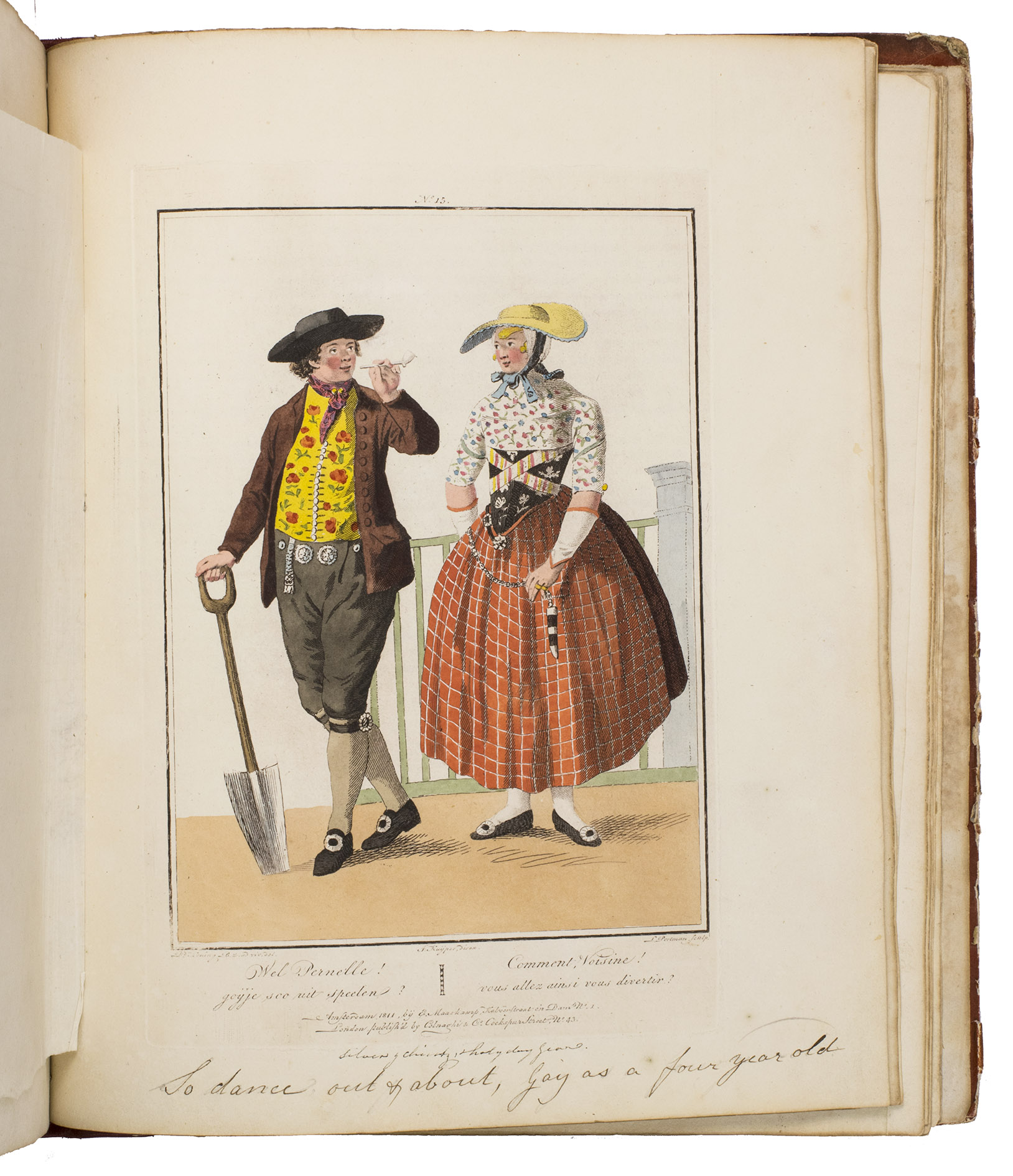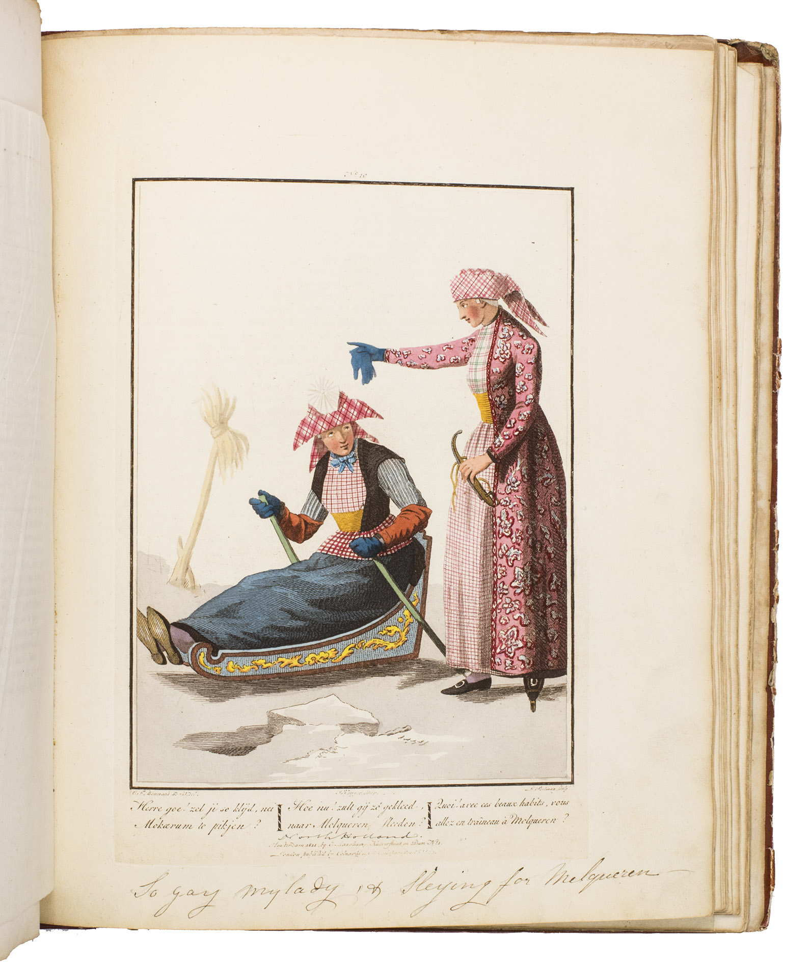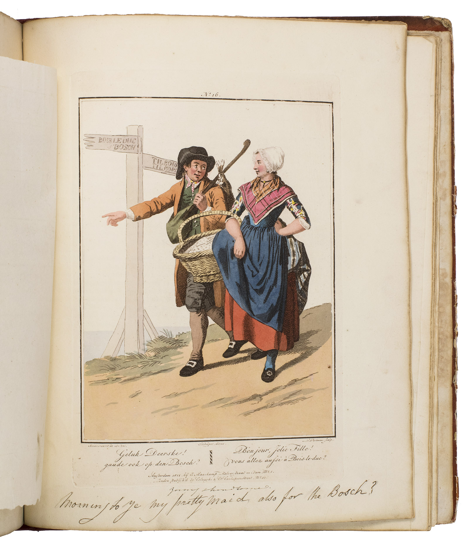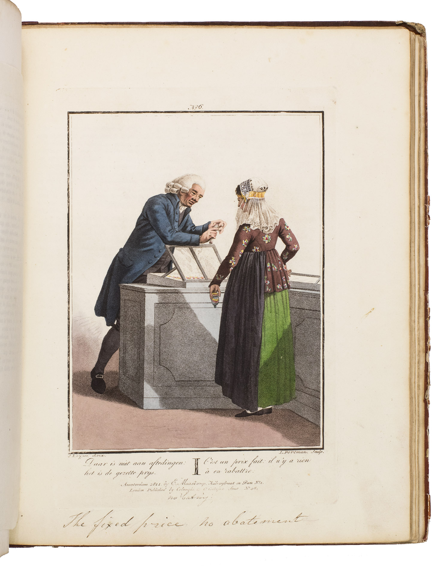 Second edition in the original Dutch and French, printed from the plates of the first edition, of the famous first Dutch costume book to cover the different costumes of the various provinces, edited by the well-known publisher Evert Maaskamp (1769-1834) in Amsterdam. The illustrations are much more than just costume plates, for they show people (mostly peasants, but also city dwellers, clergymen, soldiers and others) engaged in a wide variety of activities (selling goods, going to church, courting, etc.), though always in their best clothes. The costumes include those of the Moravian brethren. Each plate has an engraved caption in French and Dutch with a detailed explanation on separate letterpress leaves in Dutch and French. The extensive texts accompanying the plates describe the costumes and people in their cultural, historical, moral and social context. The introduction notes that the costume plates were drawn from life under the direction of Jacques Kuyper (1761-1808), engraved by Lodewijk Gottlieb Portman (1772-post 1828) and coloured by the now famous Dutch painter Jan Willem Pieneman (1779-1853).