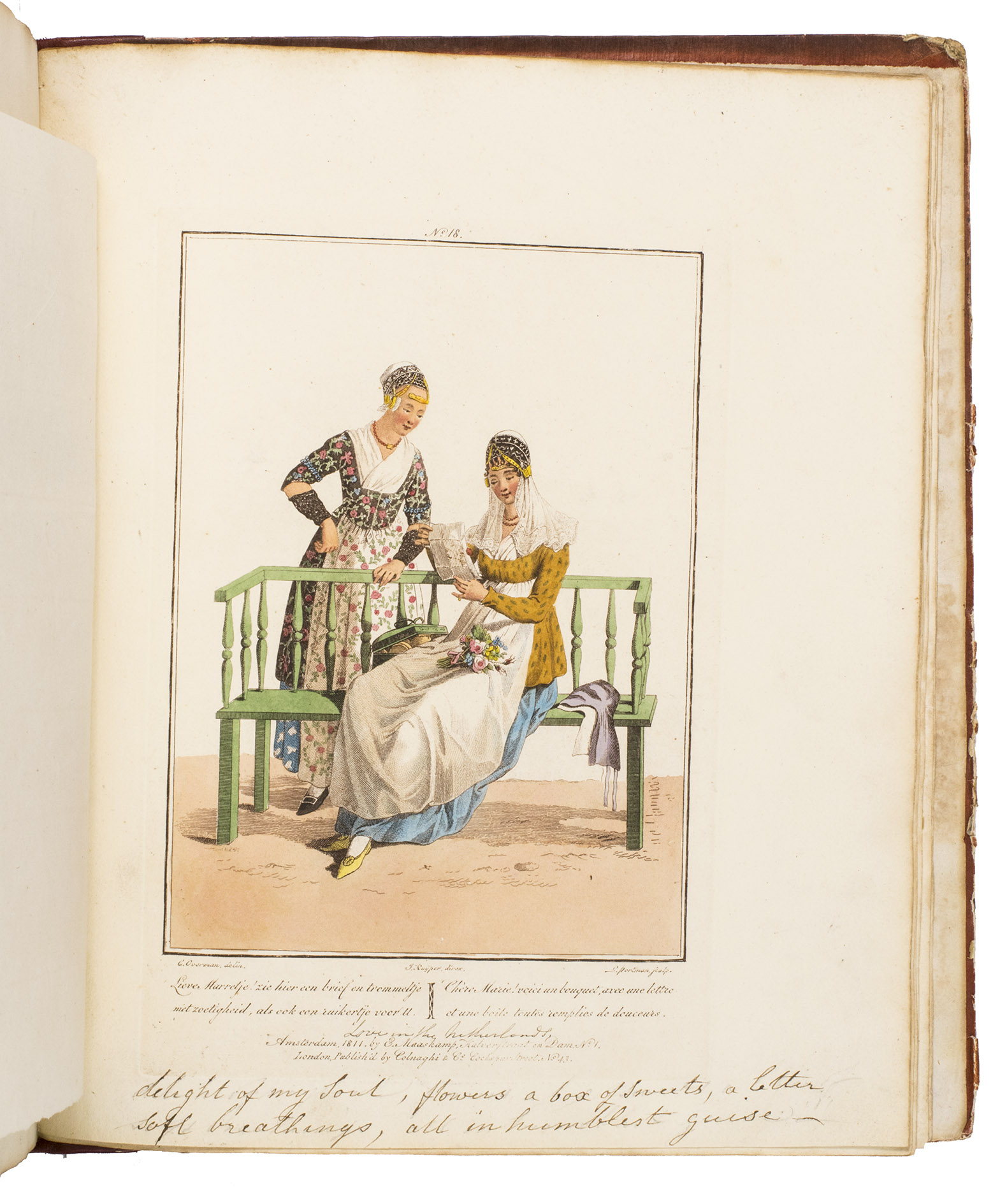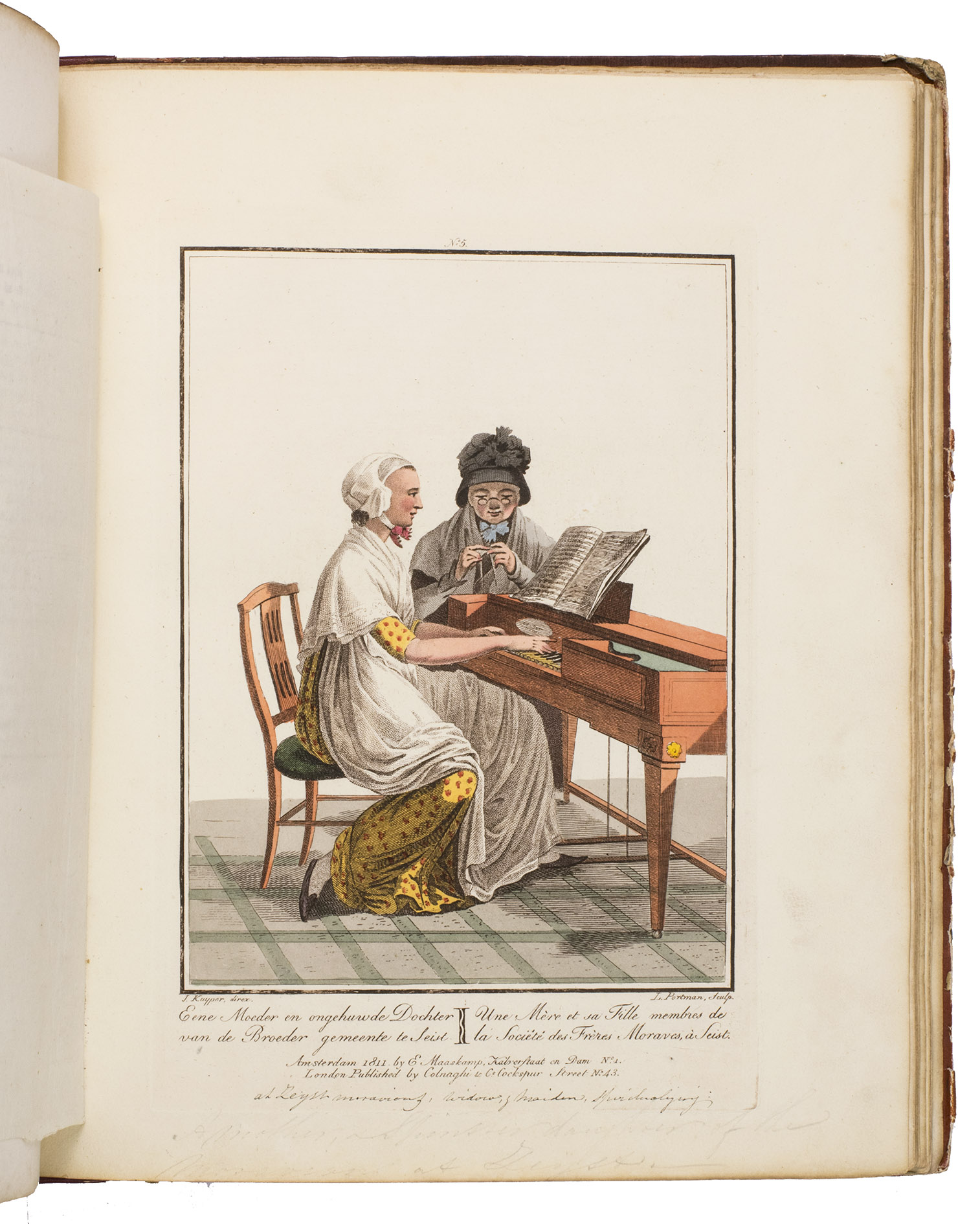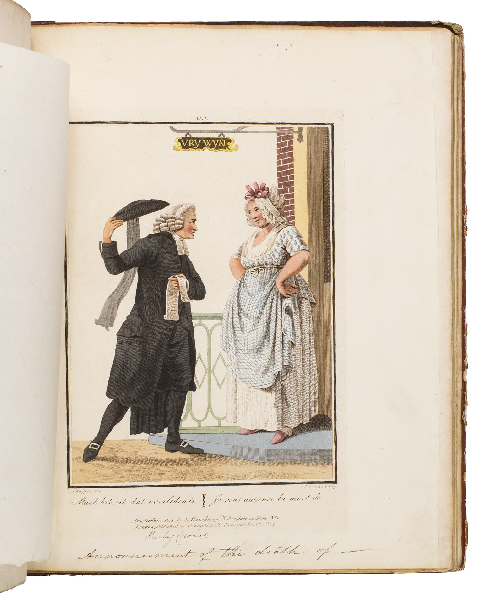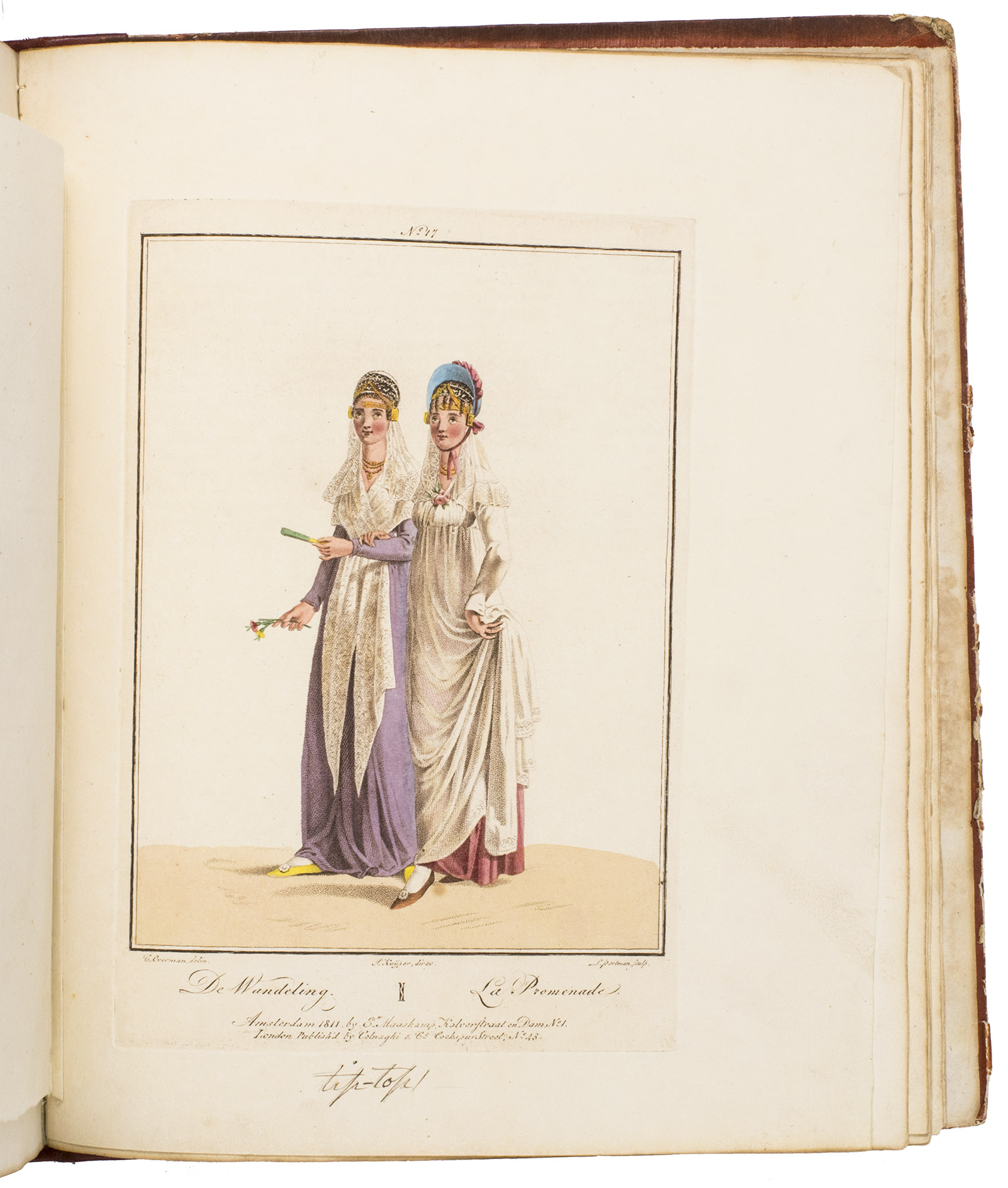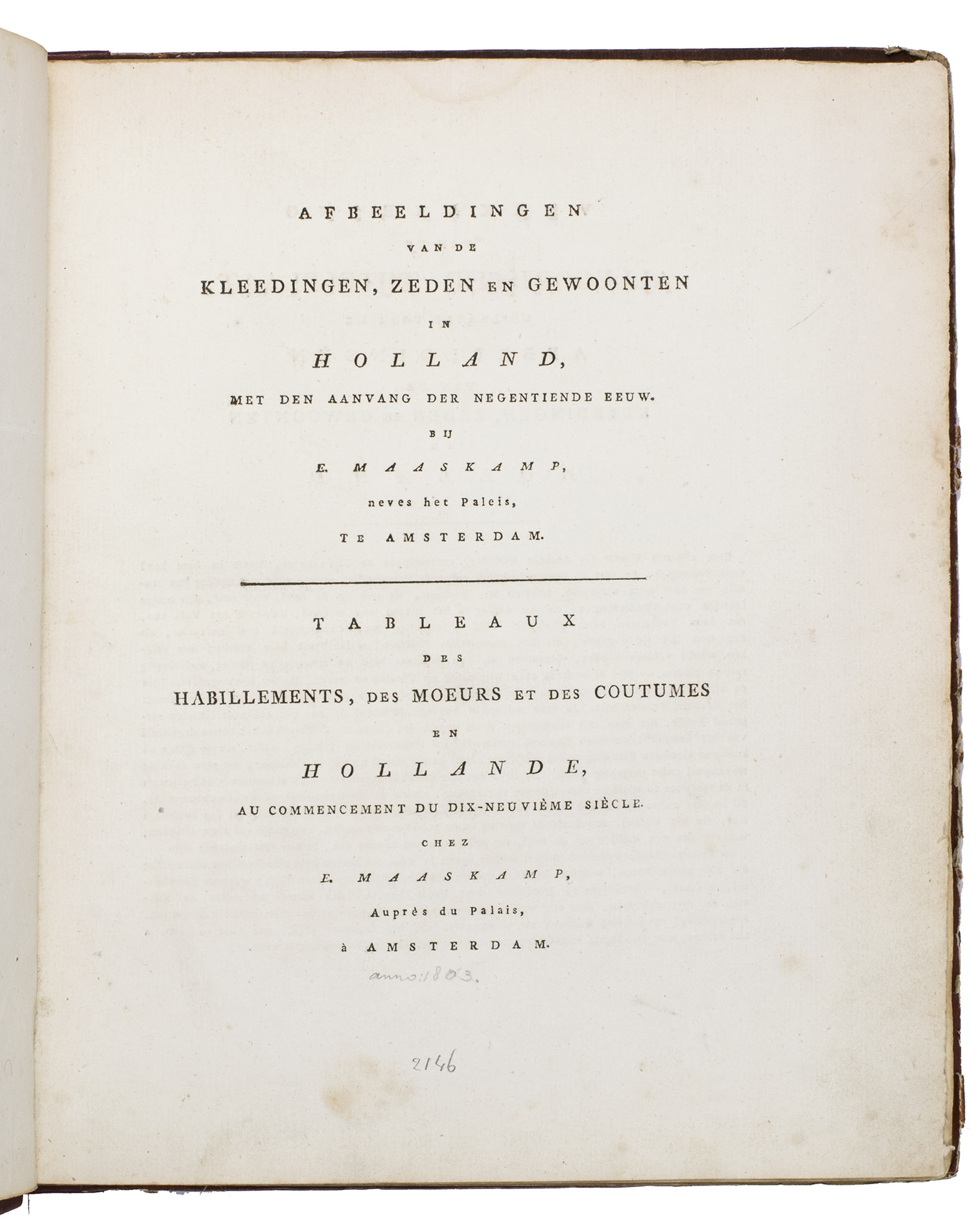 Second edition in the original Dutch and French, printed from the plates of the first edition, of the famous first Dutch costume book to cover the different costumes of the various provinces, edited by the well-known publisher Evert Maaskamp (1769-1834) in Amsterdam. The illustrations are much more than just costume plates, for they show people (mostly peasants, but also city dwellers, clergymen, soldiers and others) engaged in a wide variety of activities (selling goods, going to church, courting, etc.), though always in their best clothes. The costumes include those of the Moravian brethren. Each plate has an engraved caption in French and Dutch with a detailed explanation on separate letterpress leaves in Dutch and French. The extensive texts accompanying the plates describe the costumes and people in their cultural, historical, moral and social context. The introduction notes that the costume plates were drawn from life under the direction of Jacques Kuyper (1761-1808), engraved by Lodewijk Gottlieb Portman (1772-post 1828) and coloured by the now famous Dutch painter Jan Willem Pieneman (1779-1853).