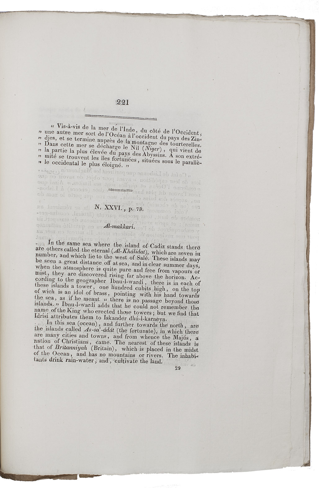 A detailed scholarly study of ancient sources for the history and geography of the Canary Islands, attempting to prove that the Portuguese discovered them before Islamic explorers, and that Islamic geographers knew them only through classical Greek and Roman sources. The main text is followed by extensive notes from a wide variety of sources and transcriptions of numerous primary sources, some in Greek or Arabic. In passing it also provides a wealth of information about navigation in the Mediterranean and Atlantic by classical Greek and Roman and by Islamic explorers. While Macedo's claim for Malocello's discovery of the Canaries in 1336 is no longer accepted, the Islamic geographer Idrisi noted a Portuguese voyage to the Canaries already before 1154.