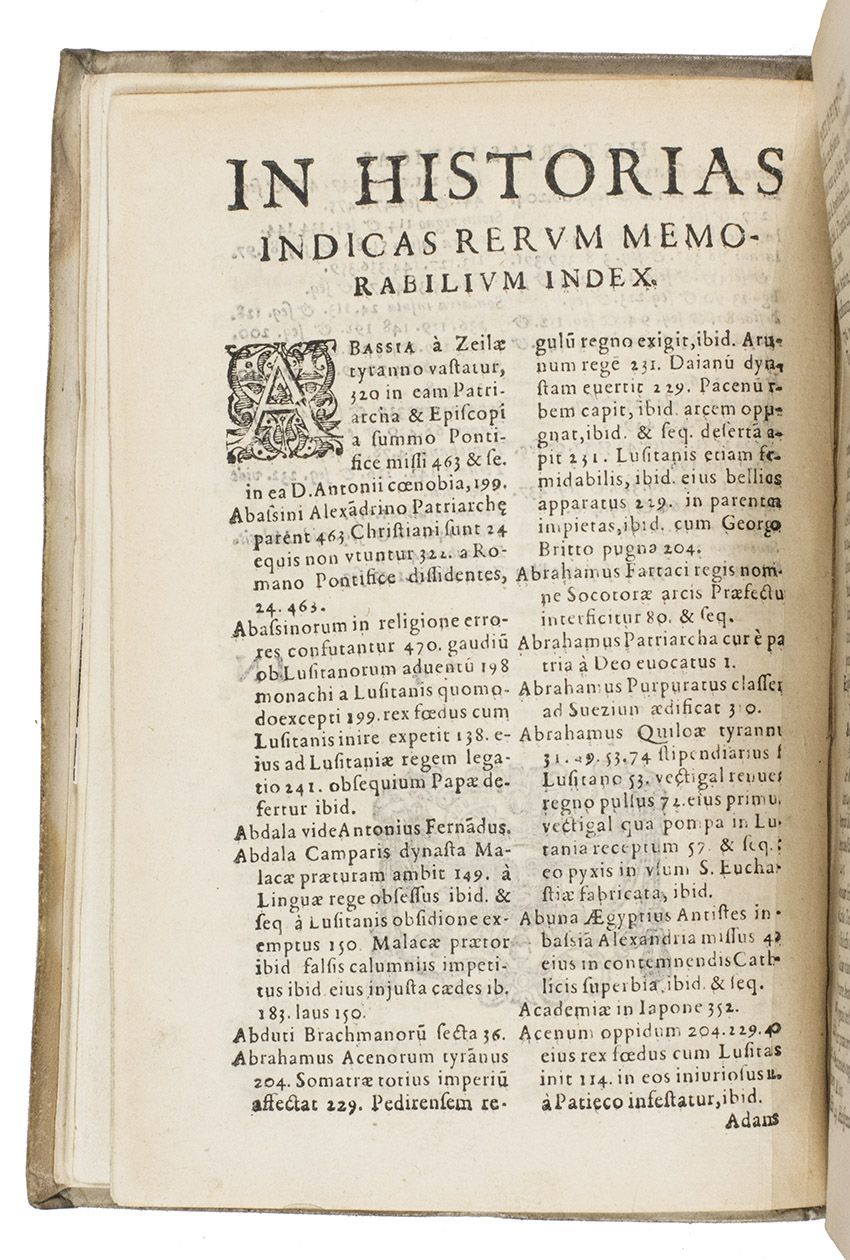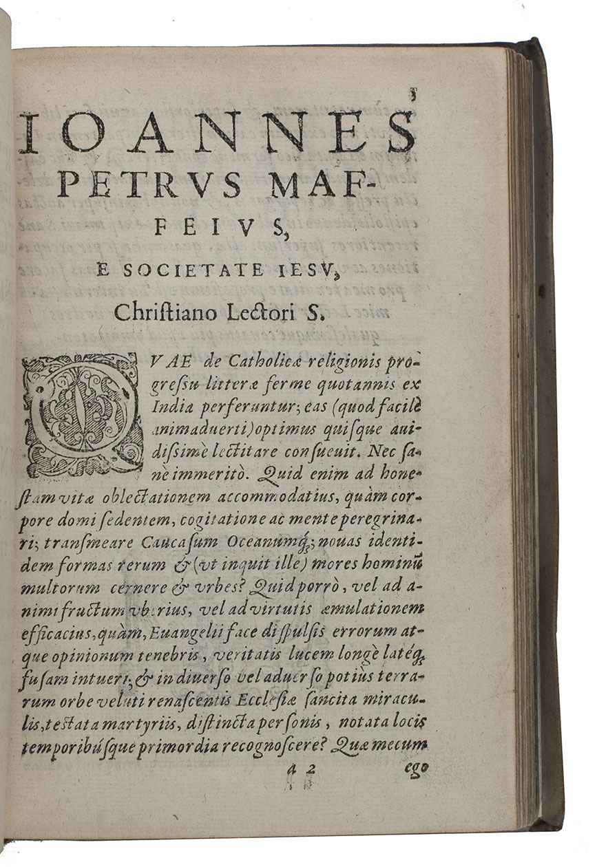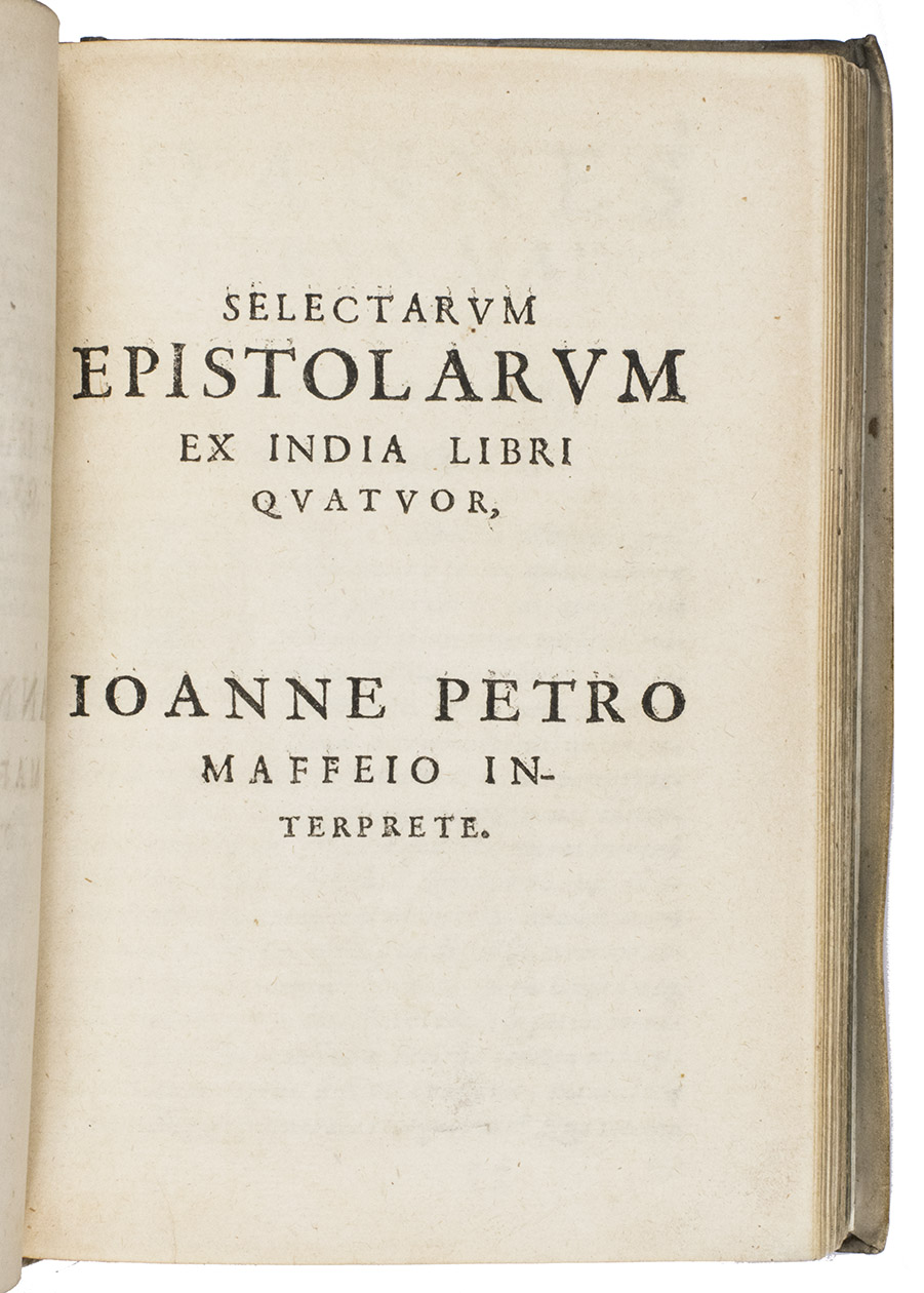 Early 17th-century edition of a classic work on "the Indies", including both the West and East Indies, considered the best (Sabin) and the most complete (Borba de Moraes) of the many Latin editions. Most of Maffei's work is concerned with the Portuguese conquests and the Jesuit stations in India, the East Indies, and regions around the Arabian Sea to about 1557. The first 5 books appear to follow rather closely the model of Barros. Book VI, dealing with China and book XII, which is mainly concerned with Japan, are heavily indebted to Valignano's account of those countries. The second part includes a selection of Jesuit letters written from the Indies and translated by Maffei.