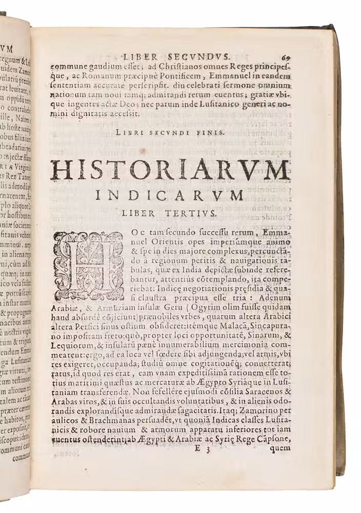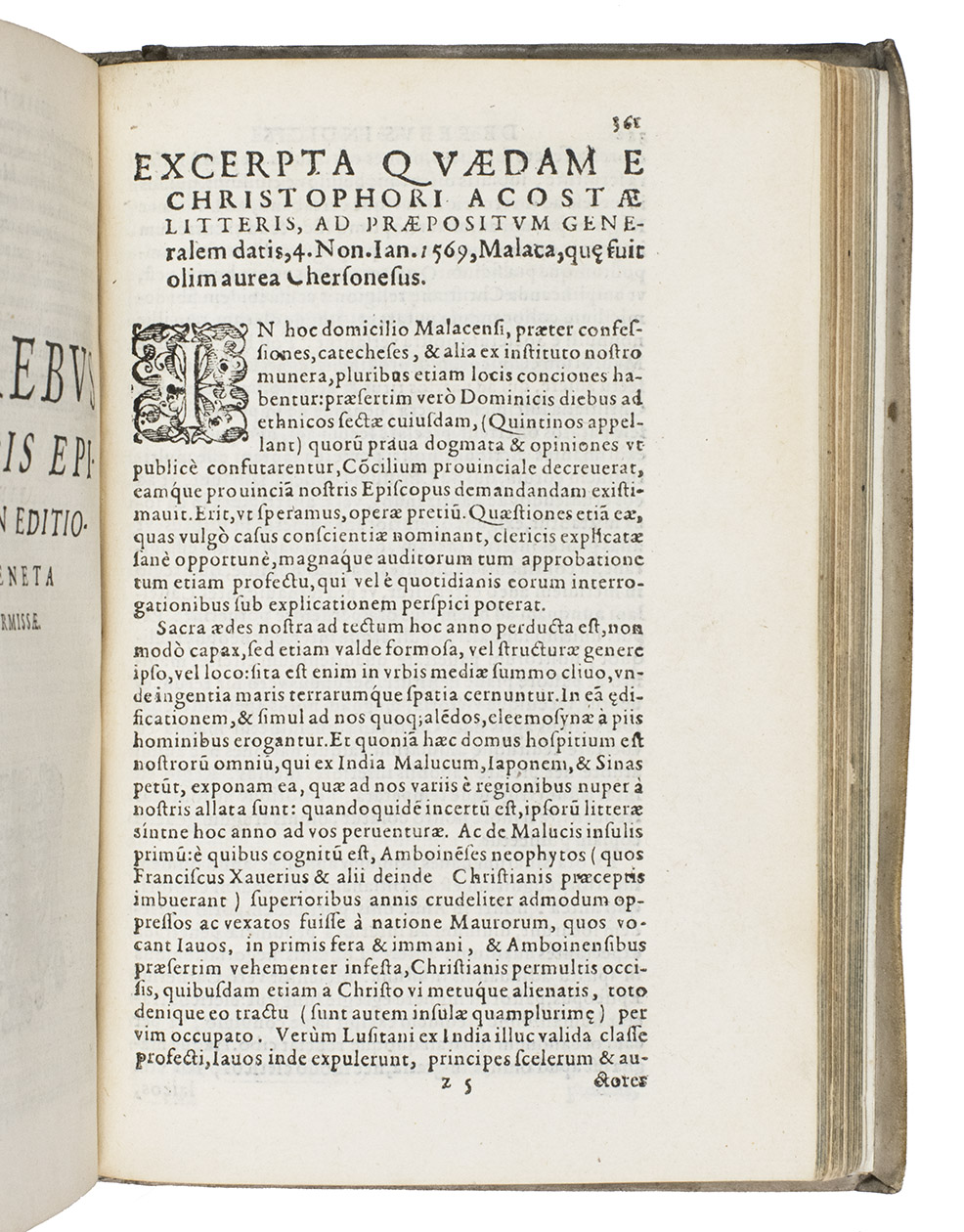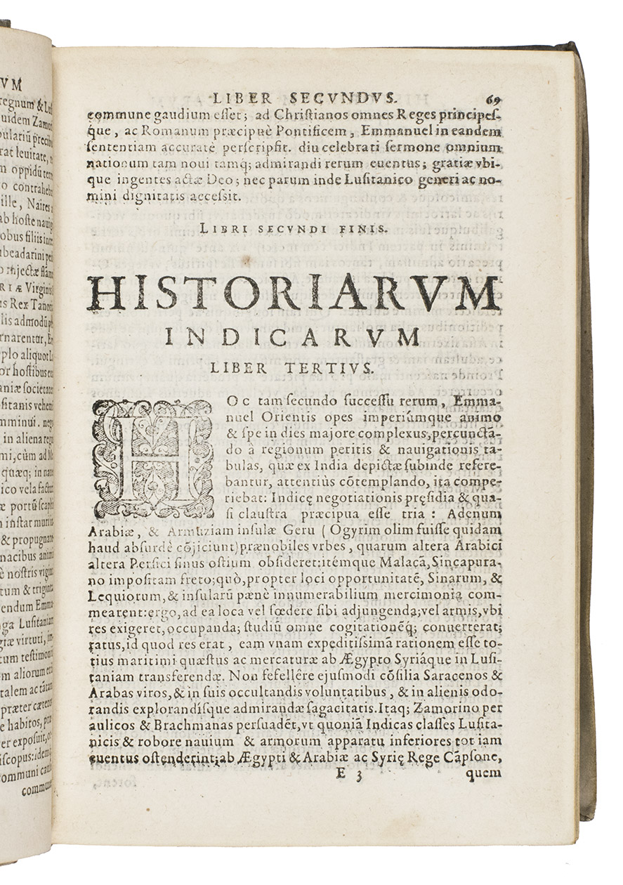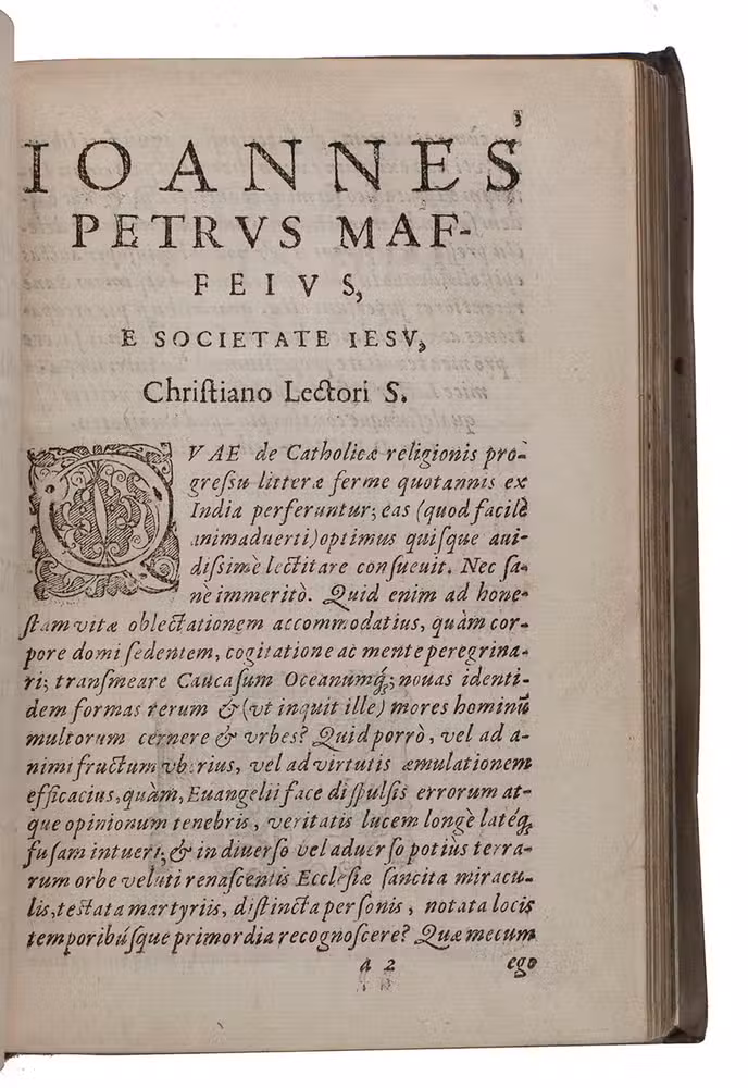 Early 17th-century edition of a classic work on "the Indies", including both the West and East Indies, considered the best (Sabin) and the most complete (Borba de Moraes) of the many Latin editions. Most of Maffei's work is concerned with the Portuguese conquests and the Jesuit stations in India, the East Indies, and regions around the Arabian Sea to about 1557. The first 5 books appear to follow rather closely the model of Barros. Book VI, dealing with China and book XII, which is mainly concerned with Japan, are heavily indebted to Valignano's account of those countries. The second part includes a selection of Jesuit letters written from the Indies and translated by Maffei.