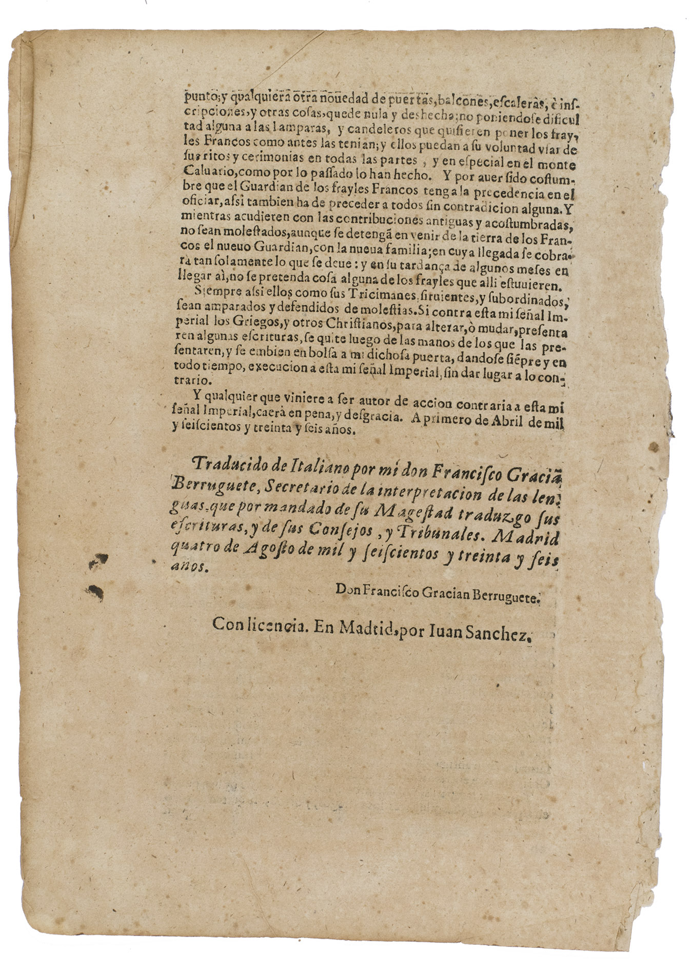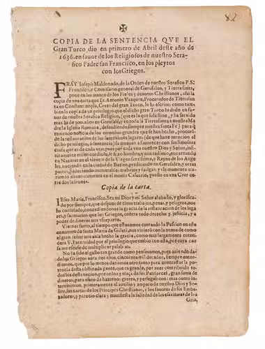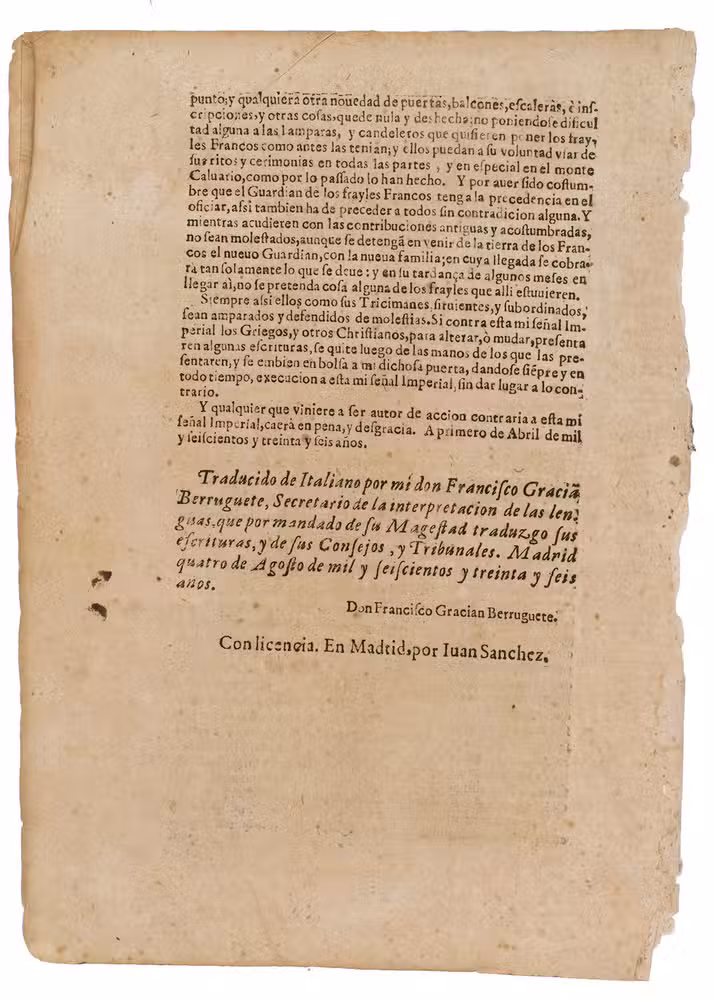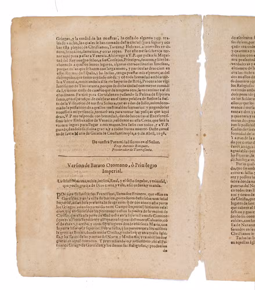 Rare copy of a privilege, including the translation of the Ottoman "Barato" or a version of an imperial privilege, extended to the Franciscan Order, for the restoration of the holy places in Jerusalem, granted by Sultan Amurath IV (1623-1640). The imprint bears a copy of the letter sent by Fray Antonio Vazquez, Procurator to the Holy Land - sent from the Court of the Great Turk, as the Spanish referred to the Ottoman ruler - which was received by Maldonado.
