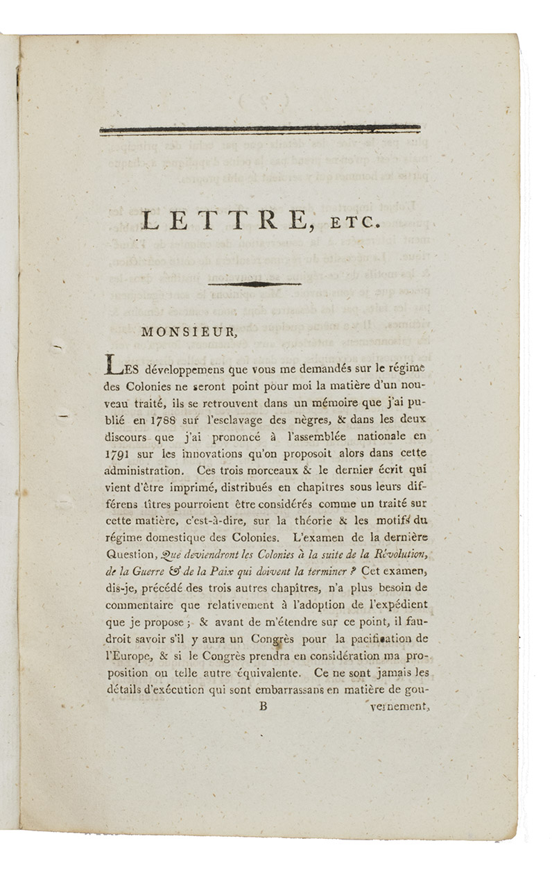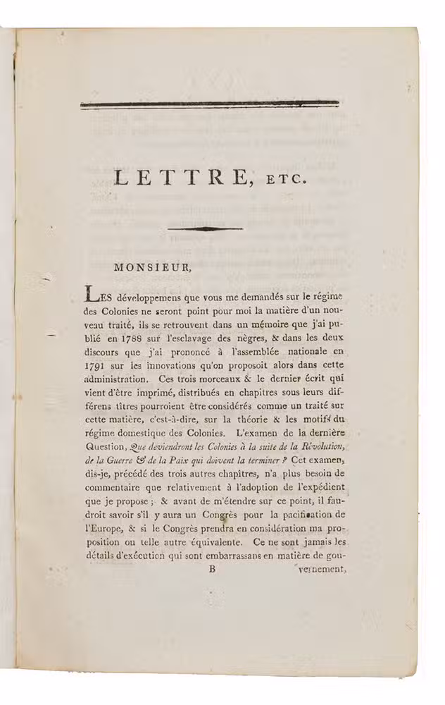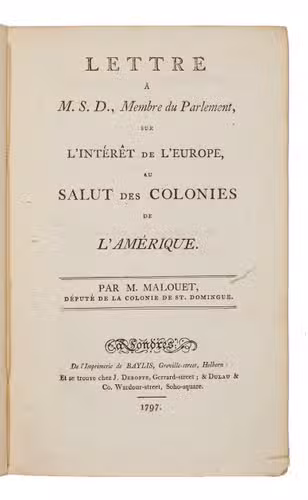 Letter by the French colonialist and plantation owner Pierre Victor Malouet (1750-1814) to a French(?) member of the parliament, which he wrote as "deputy of the colony of Saint-Domingue". Saint-Domingue (now called Haiti) was a former French colony, until its independency in 1804. In this letter, Malouet describes the importance of America and colonies as Saint-Domingue for Europe and he also particularly gives attention to the merits of the American colonies and the poltical and economical implications of losing them. It was published during the Haitan Revolution (1791-1804), when self-liberated slaves revolted against the French colonial rule. Malouet is known as a counter-revolutionary colonist, who also signed for example the Whitehall Accord of 19 February 1793, which was an angreement that allowed colonist at Saint-Domingue as Malouet to maintain slavery, which was abolished by the French government.