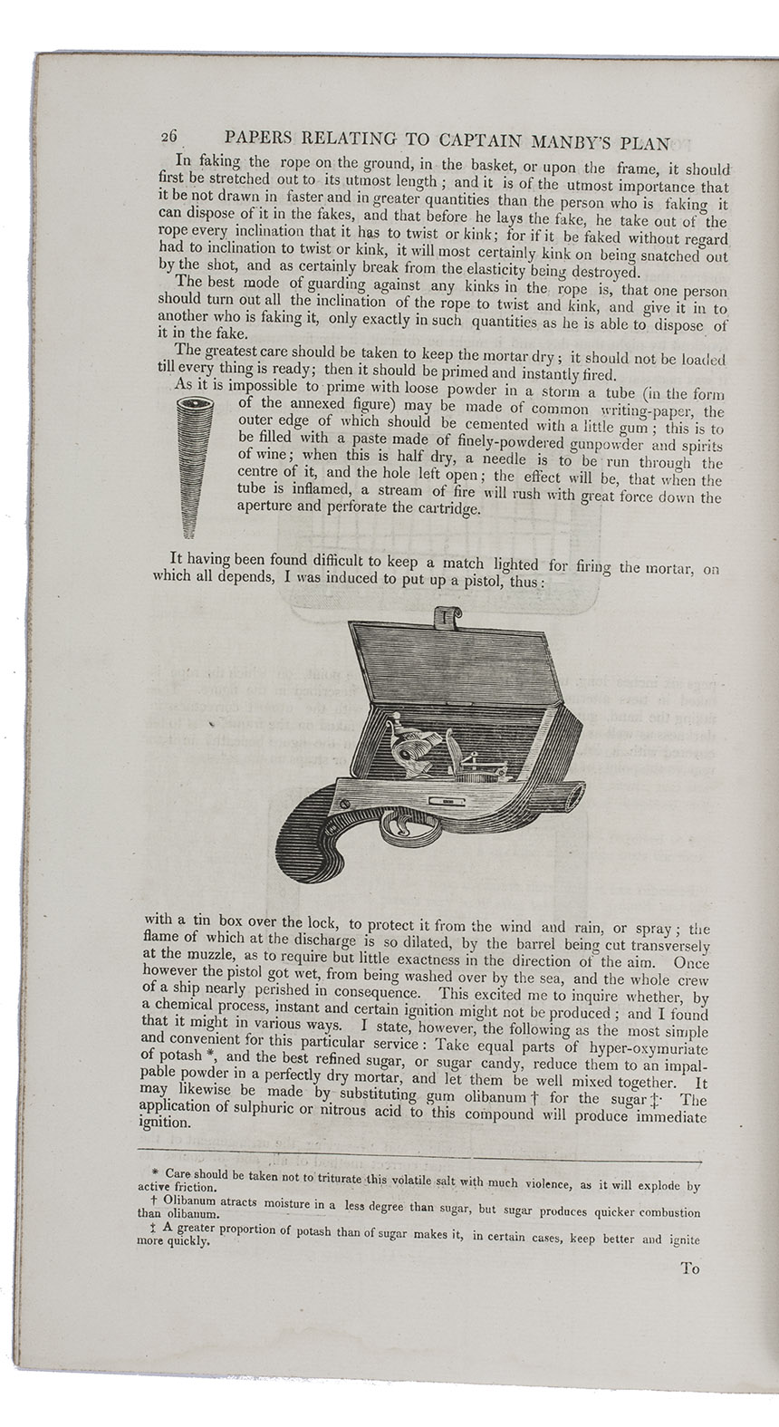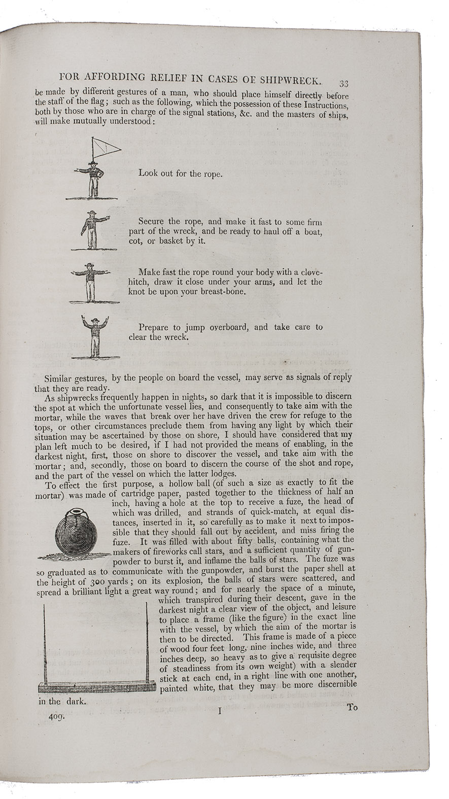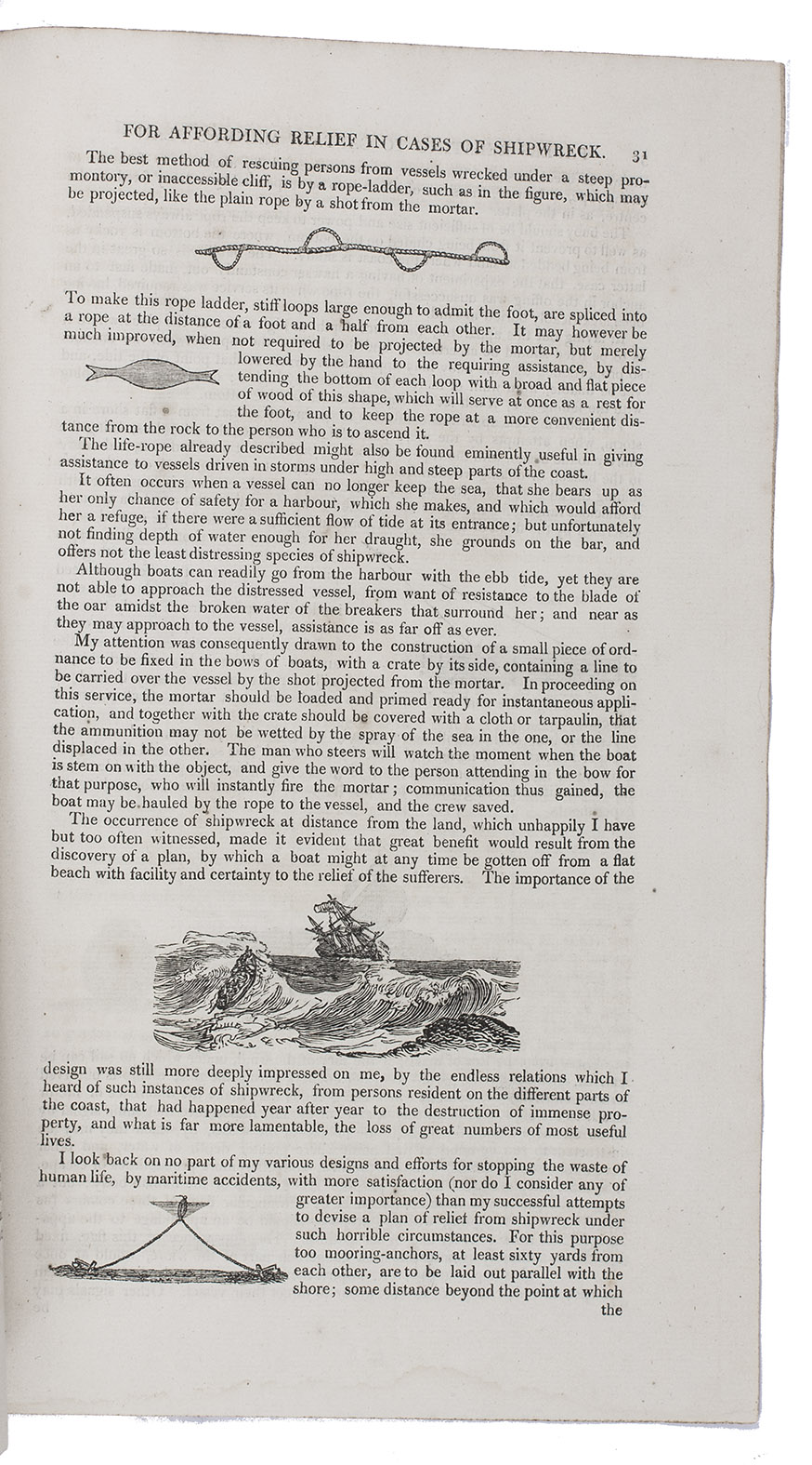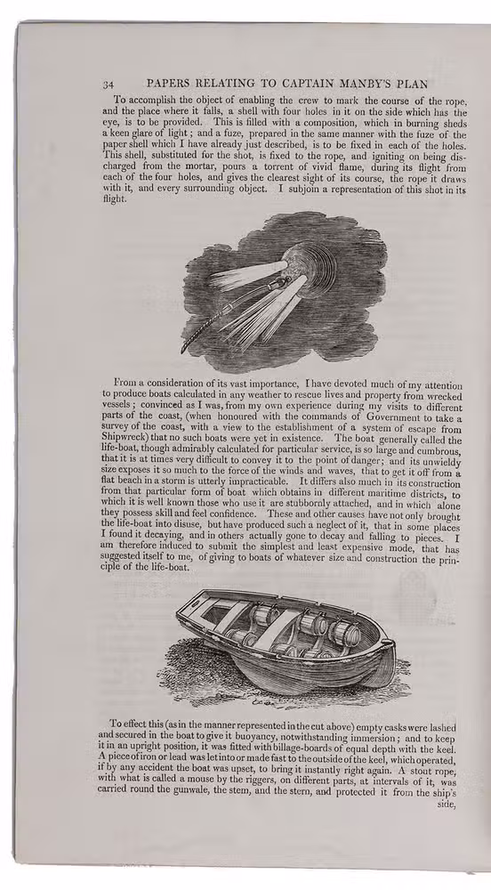 Rare compilation of papers for the parliament of the United Kingdom, commonly found bound in series, related to a plan concerning the rescue of shipwrecked persons. The proposal included the placement throughout the country of so-called "Manby mortars" throughout the country. This mortar fired a shot with a line to a wrecked ship and could be lighted with a special wind-proof pistol. The line could be used for communication purposes, as well as to connect to specially designed lifeboats.