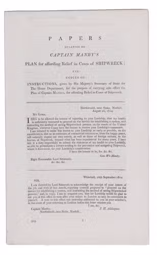 Papers relating to Captain Manby's plan for affording relief in cases of shipwreck: viz. Copies of instructuions, given by His Majesty's Secretary of State for the Home Department, for the purpose of carrying into effect the plan of Captain Manby, for affording relief in cases of shipwreck.