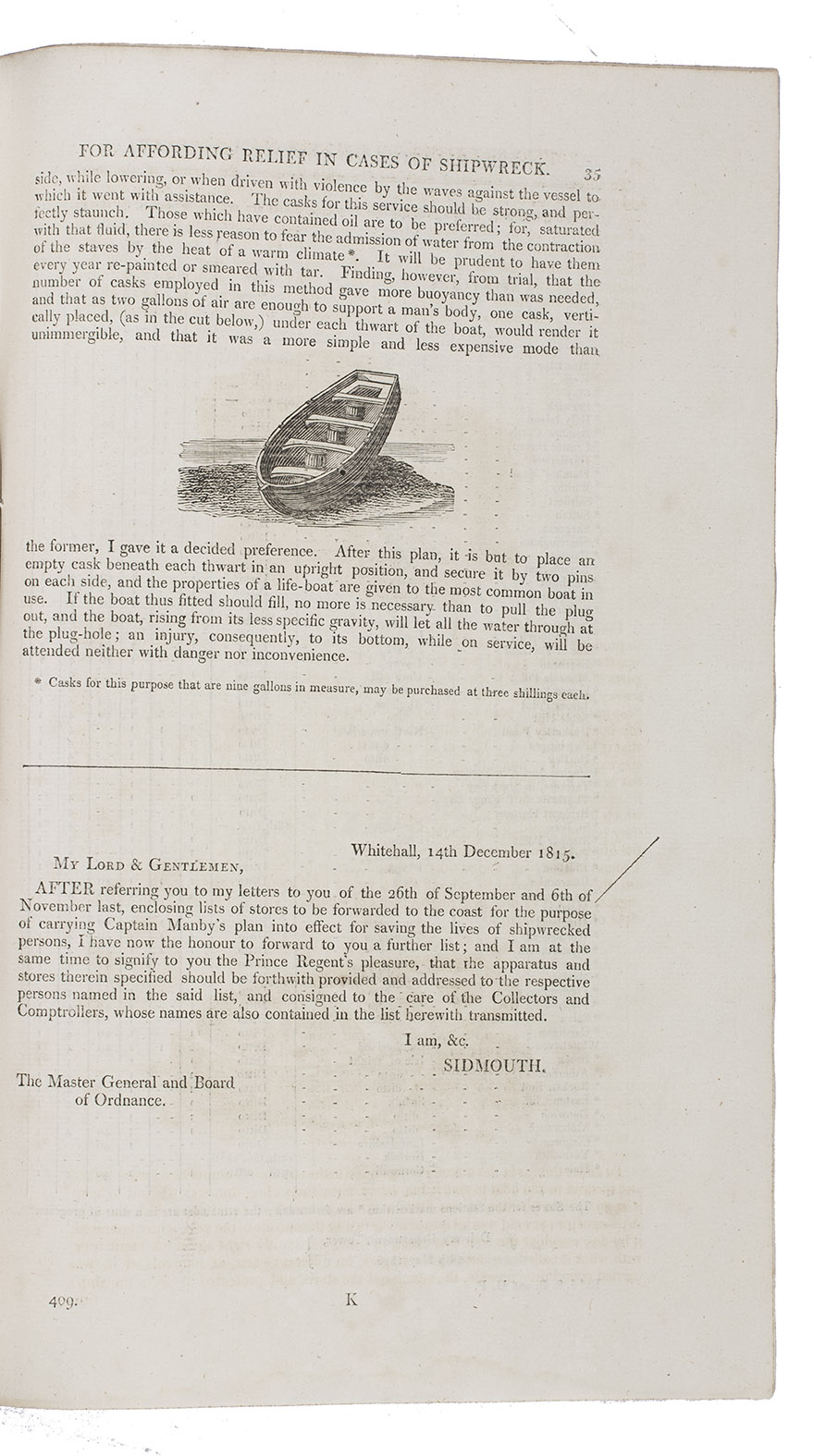 Water stain in foot margins throughout; last leaf with some foxing; a good copy. "Captain Manby's apparatus for wrecks", in: The Edinburgh review XXXVIII, pp. 332-349; Catalogue of Parliamentary reports... 1869-1834, p. 71 no. 28.