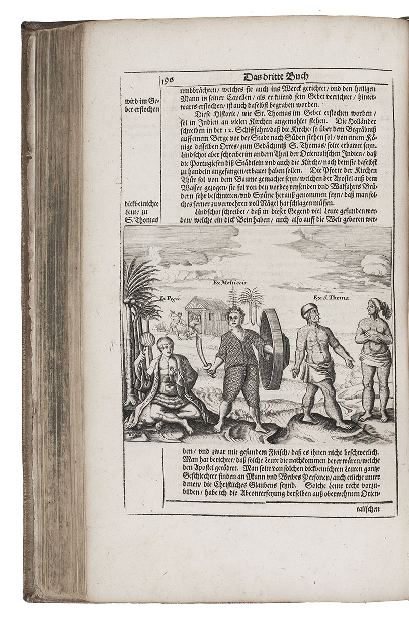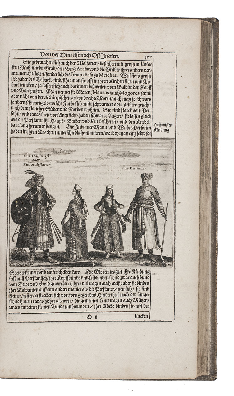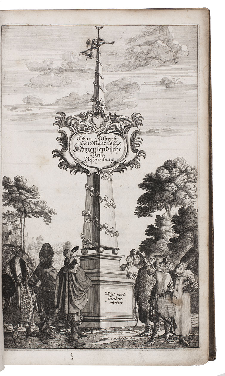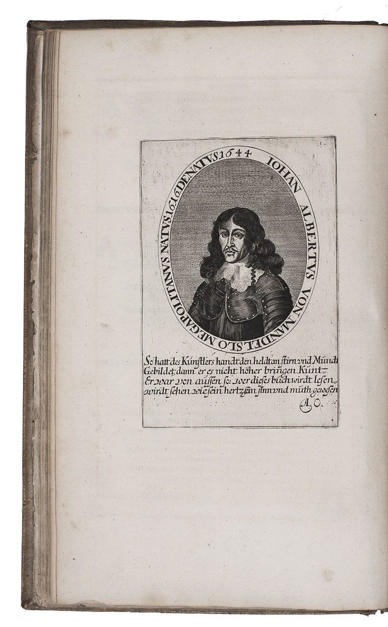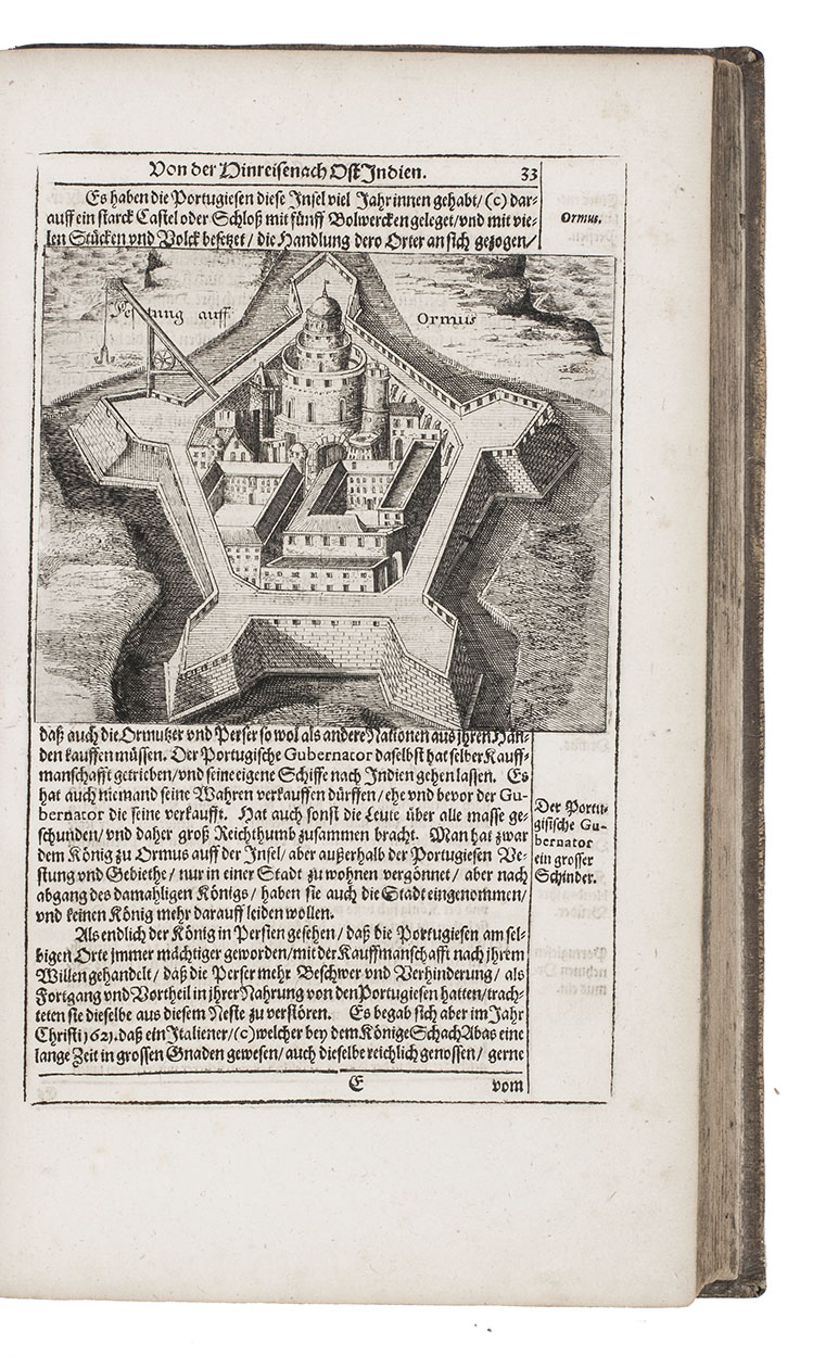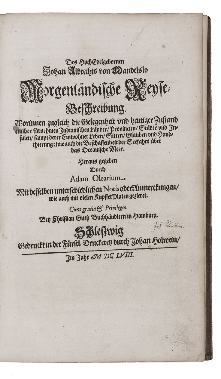 First complete German edition of the engaging travel account of Johann Albrecht von Mandelslo, edited by Adam Olearius. Mandelslo was attached to the diplomatic mission of the Duke of Holstein-Gottorp to Moscow and Persia. The ambassadors remained in Persia, but Mandelslo travelled further. He sailed from Hormuz to Surat and proceeded through Gujarat to Agra, Lahore, Goa, Bijapur and Malaba, visiting Ceylon, Madagascar, the Cape of Good Hope, and St. Helena on his return voyage in 1639. Before his death 5 years later, he had entrusted his rough notes to Olearius, who subsequently published them with a third part containing descriptions of the Coromandel coast, Bengal, Siam, Sumatra, Java, Borneo, Bantam, the Philippines, Formosa (Tai-wan), China and Japan.