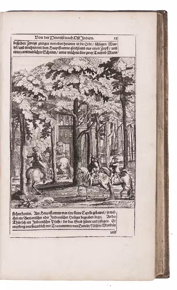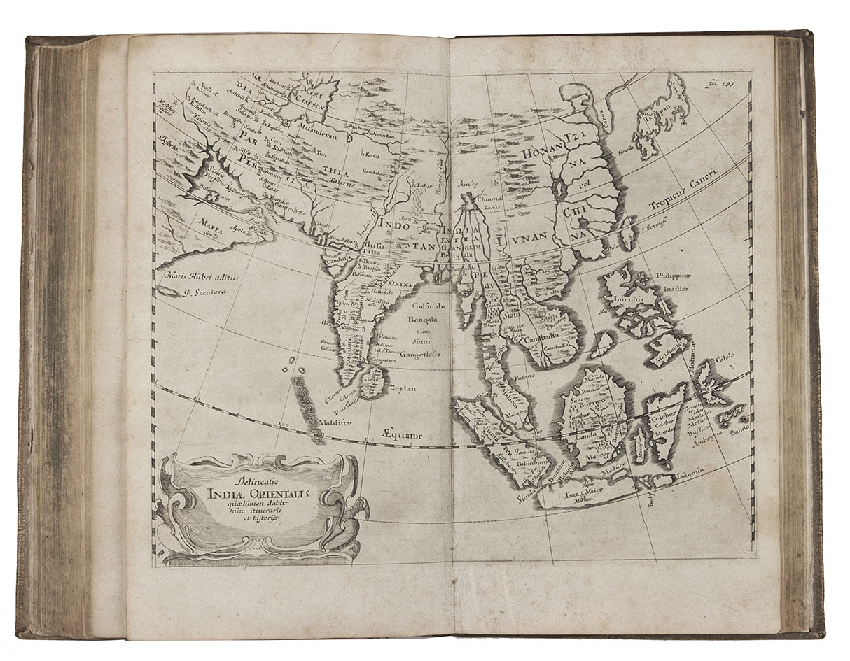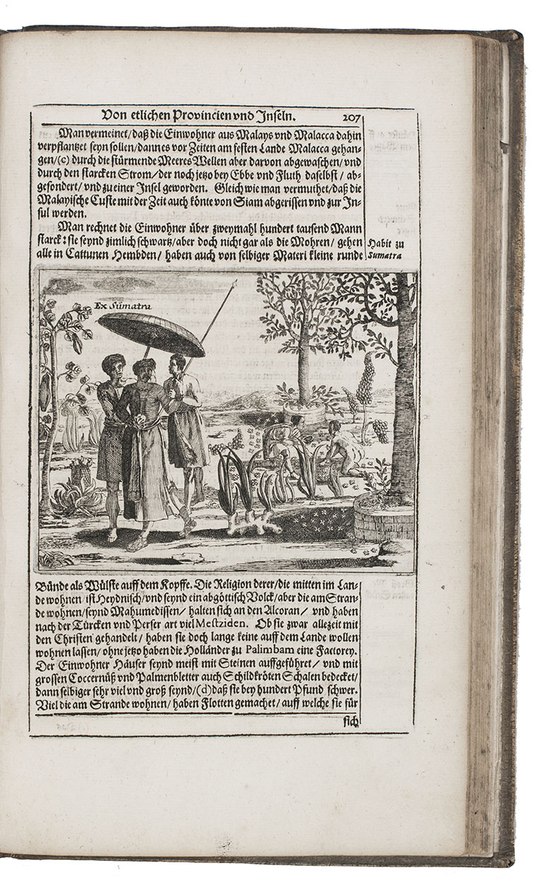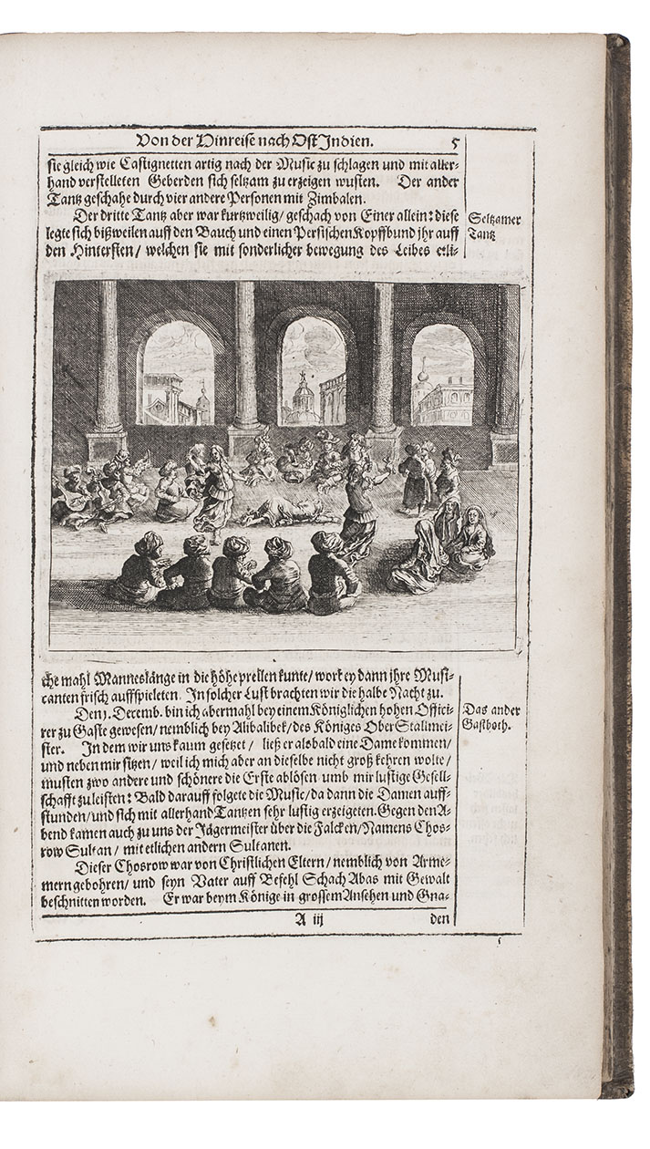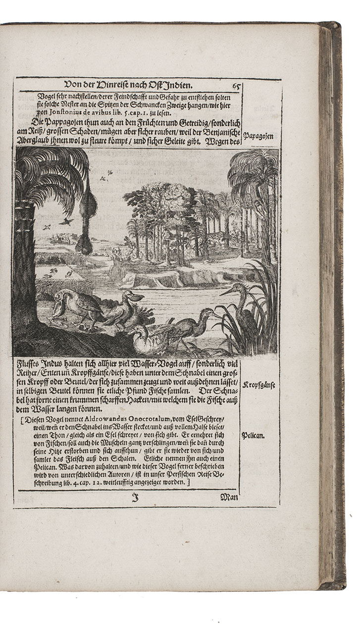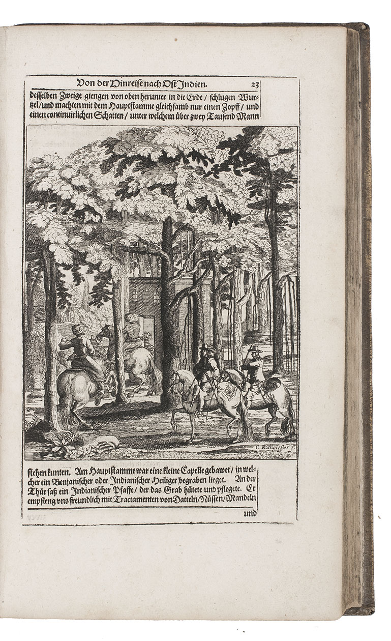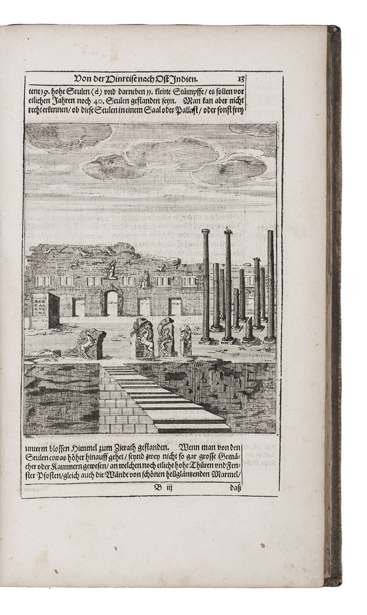 First complete German edition of the engaging travel account of Johann Albrecht von Mandelslo, edited by Adam Olearius. Mandelslo was attached to the diplomatic mission of the Duke of Holstein-Gottorp to Moscow and Persia. The ambassadors remained in Persia, but Mandelslo travelled further. He sailed from Hormuz to Surat and proceeded through Gujarat to Agra, Lahore, Goa, Bijapur and Malaba, visiting Ceylon, Madagascar, the Cape of Good Hope, and St. Helena on his return voyage in 1639. Before his death 5 years later, he had entrusted his rough notes to Olearius, who subsequently published them with a third part containing descriptions of the Coromandel coast, Bengal, Siam, Sumatra, Java, Borneo, Bantam, the Philippines, Formosa (Tai-wan), China and Japan.