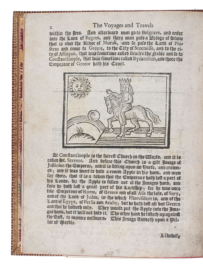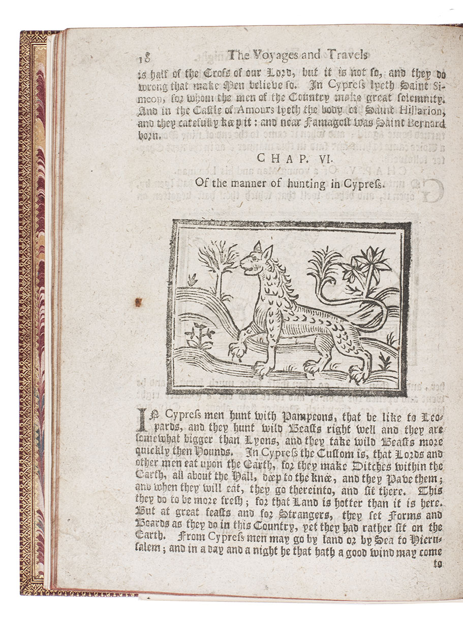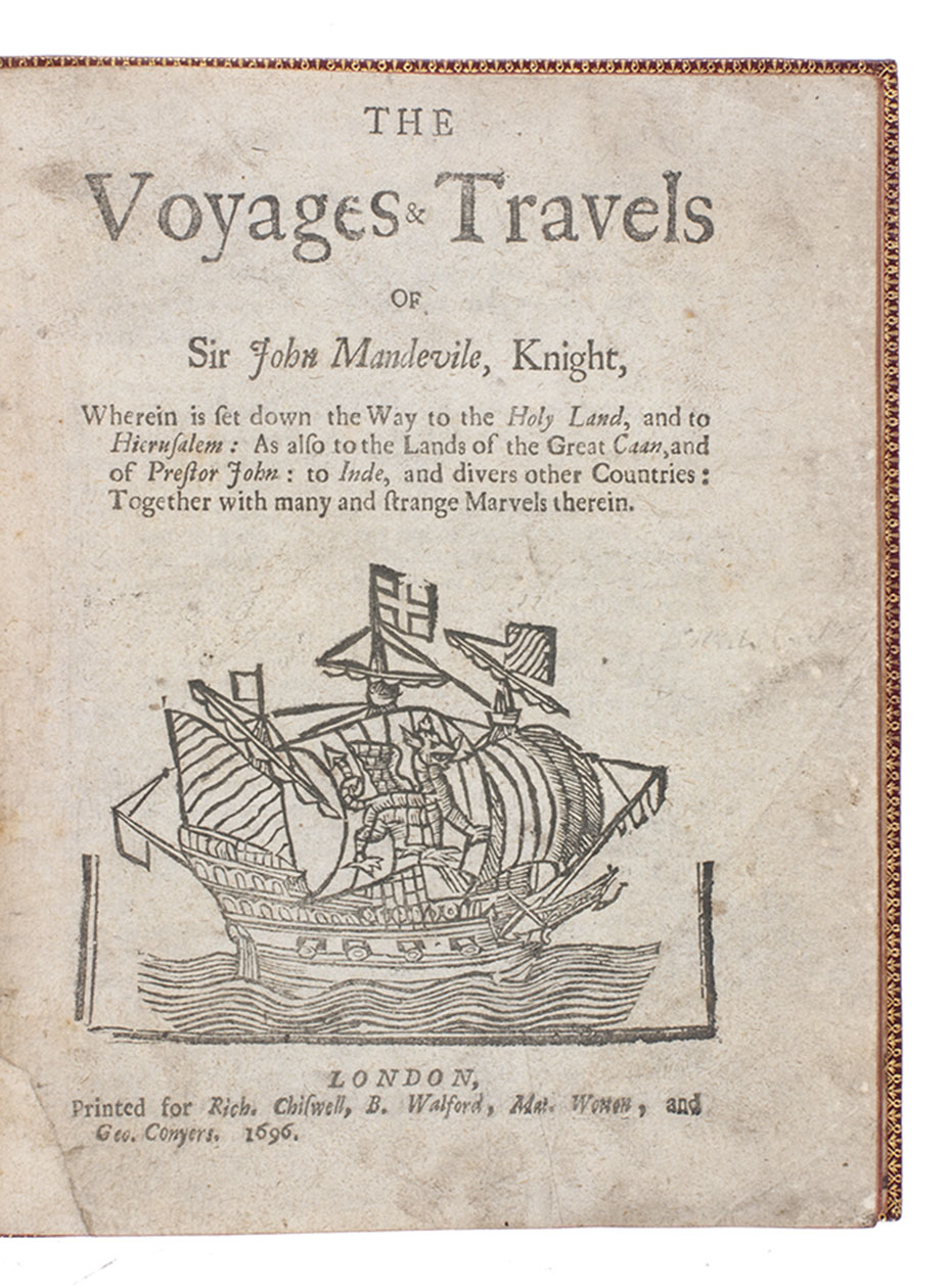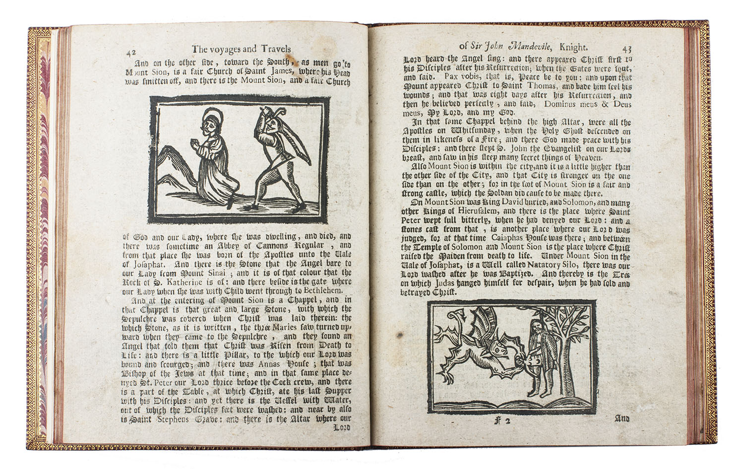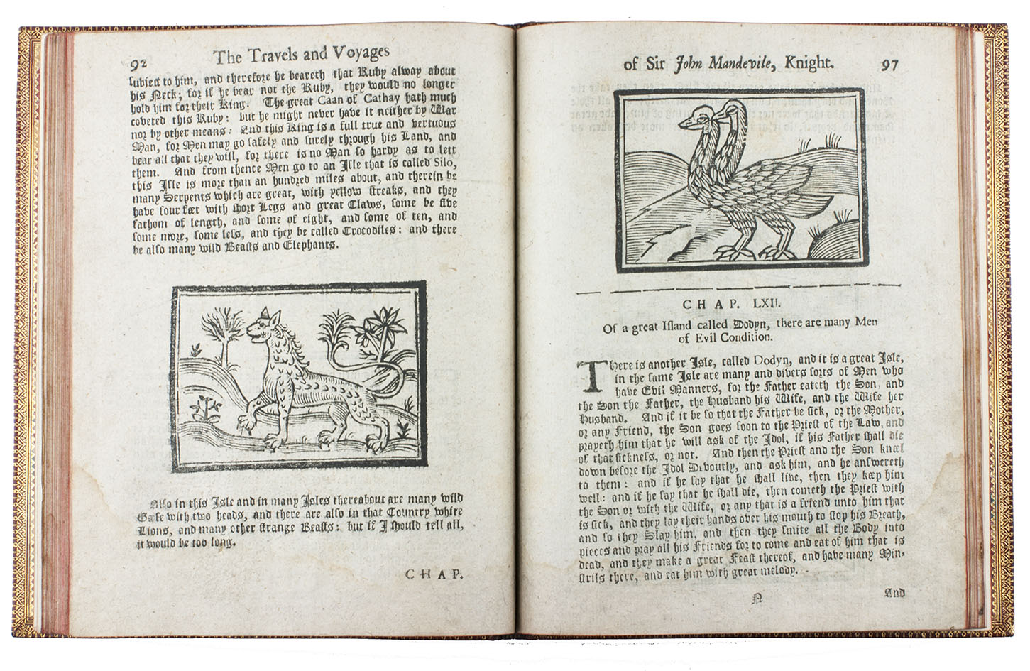 A rare 17th-century English edition, with about 60 different woodcut illustrations, of a classic and partly fictional 14th-century account of travels presented as voyages of Sir John Mandeville through Turkey, Egypt, Ethiopia, Syria, Persia, Arabia, India and the East Indies. It was originally written in French and is thought to have been compiled from various sources by Jehan d'Outremeuse (1338-1400) of Liege. It includes many well-known stories and illustrations of monstrous people and animals in exotic lands: a man with only one enormous foot that he can use as a parasol, a dog-headed man, a man with his face in his chest, a girl who turns into a dragon, griffins, nine-meter giants, ants that gather gold, diamonds that mate and give birth to baby diamonds and much more that spoke to the imagination. The book also includes genuine descriptions of the regions covered and gave many Europeans their first notions of the Near East, Middle East, India and East Indies. The part on Arabia includes an account of the birth of Mohammed.