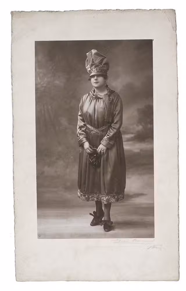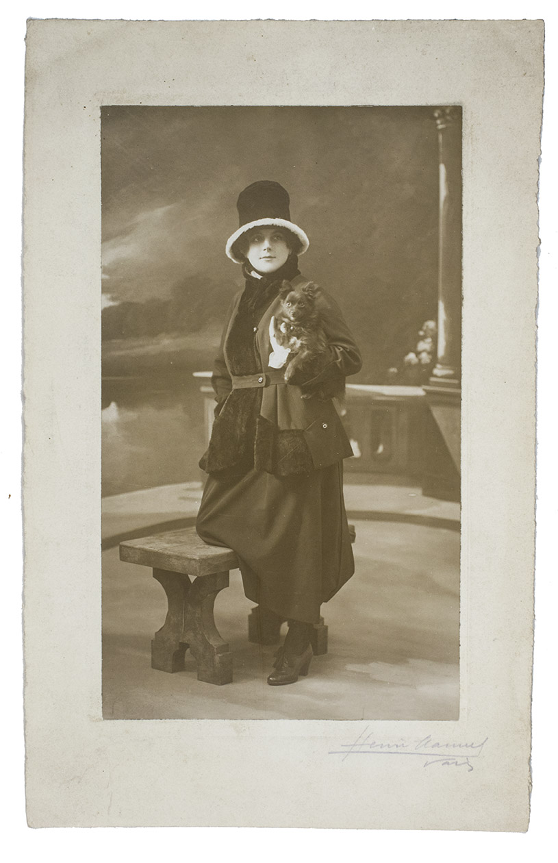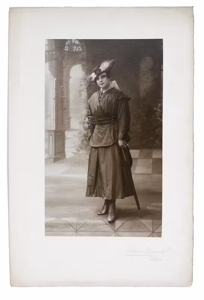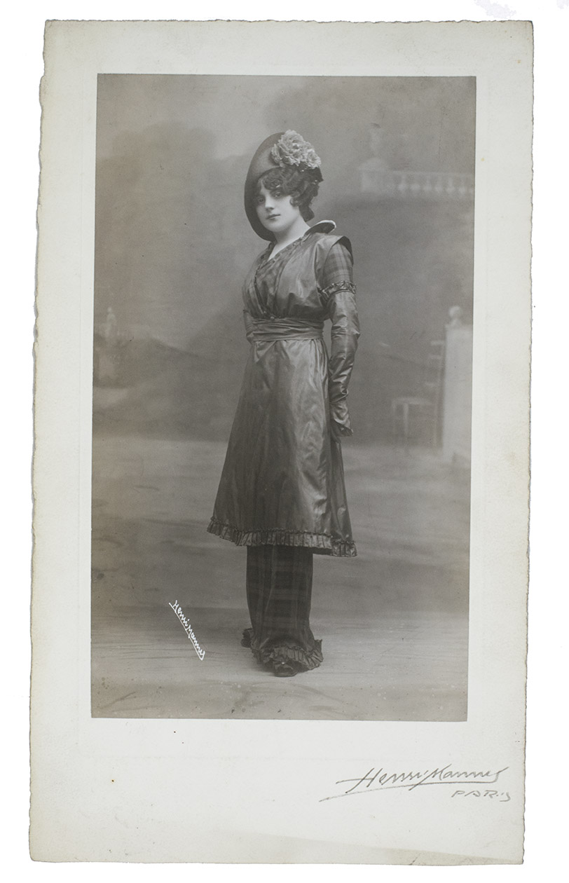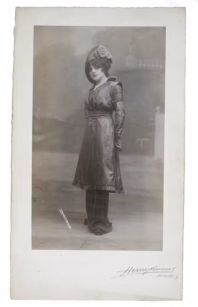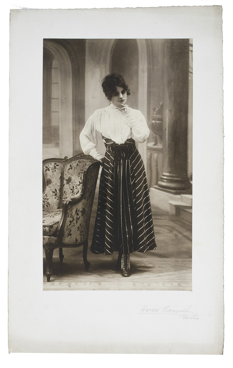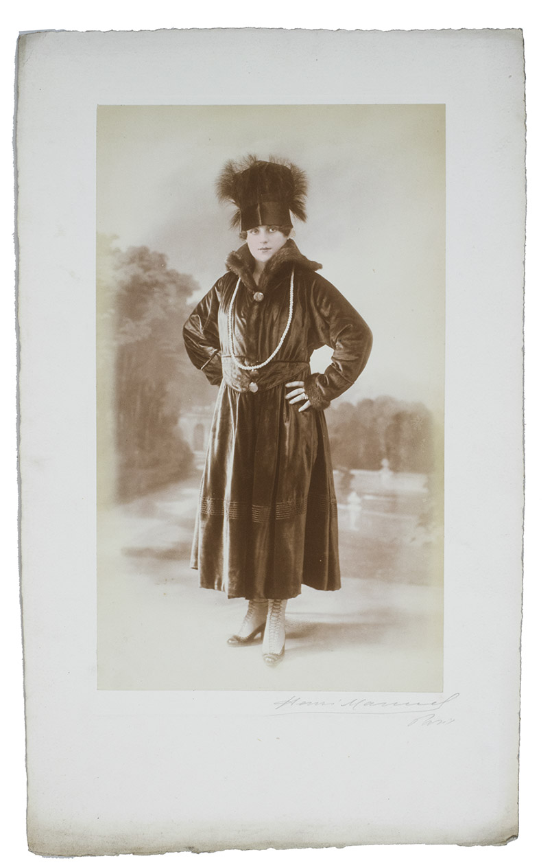Collection of early fashion photographs by the renowned Parisian photographer Henri Manuel. Each shows a model before a studio background (showing a columned hall or various outdoor settings). Taken in the 1910s, the photographs show the changing fashions of the era: orientalist influences, the changes from the long narrow skirt into the war crinoline silhouette, the rise upwards of the hemline and even a pair of trousers worn under a skirt. The collection also includes several photographs showing fur-lined overcoats and military inspired velvet caps.